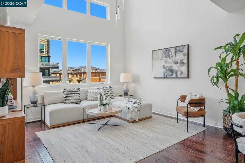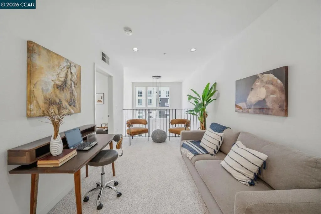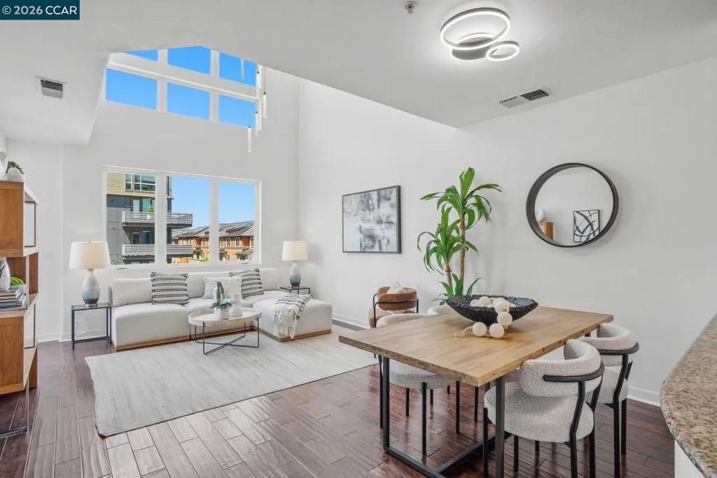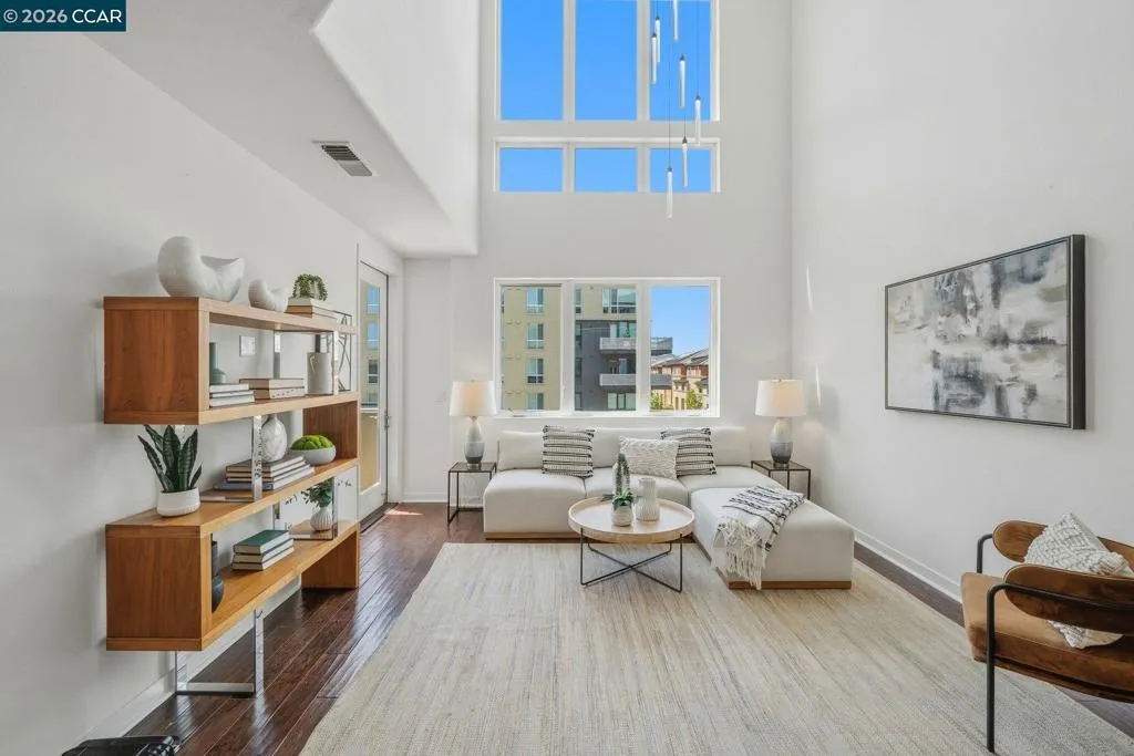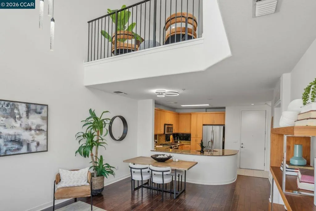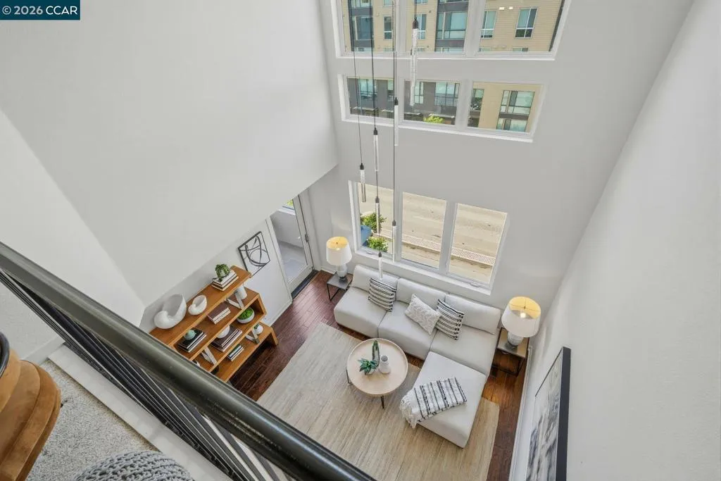 Sleek and sophisticated! Enjoy urban living in this rare, light-drenched two-level residence featuring dramatic double-height ceilings and soaring windows with stunning blue-sky views. The unique layout offers maximum privacy with one bedroom and a full bathroom on each floor, plus a versatile mezzanine loft perfect for a home office or gym. The open-concept interior boasts a chef’s kitchen with a gas stove and large peninsula, flowing seamlessly into the living area and a private balcony with East Bay Hill views. Enjoy ultimate convenience with in-unit laundry, two-car side-by-side deeded parking, and premium Homeowners Association amenities including a full gym, pool/game room, and onsite management. A true commuter’s dream, you are seconds from Dublin/Pleasanton BART, tech shuttles, and I-580/680, with Whole Foods and premier dining right around the corner.