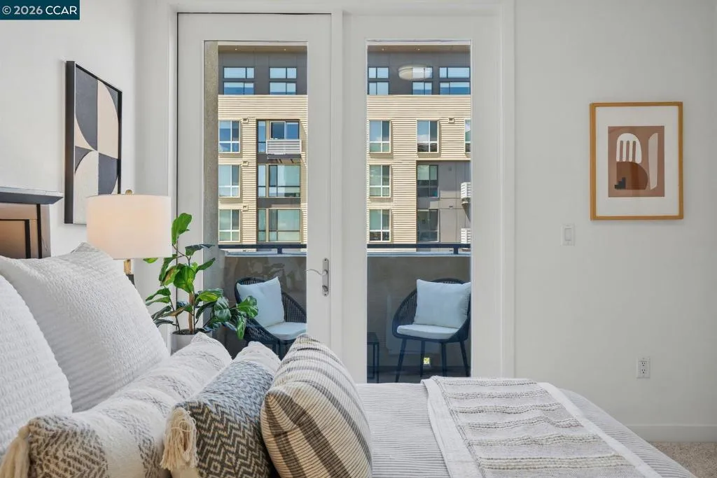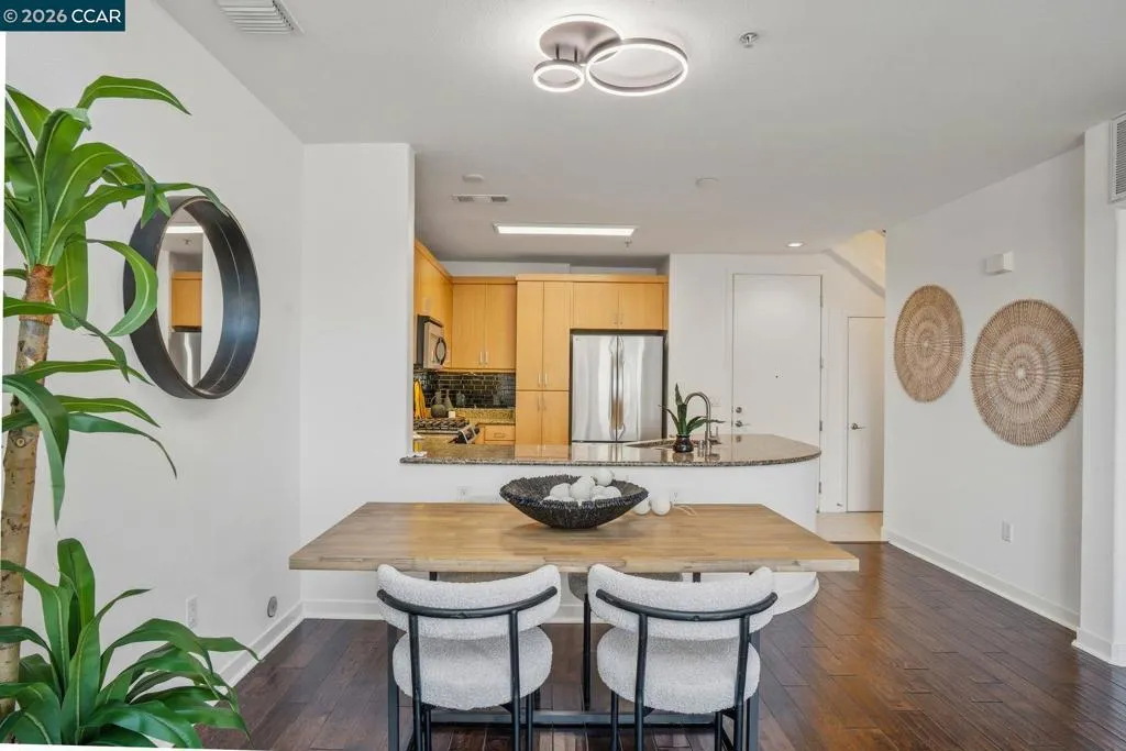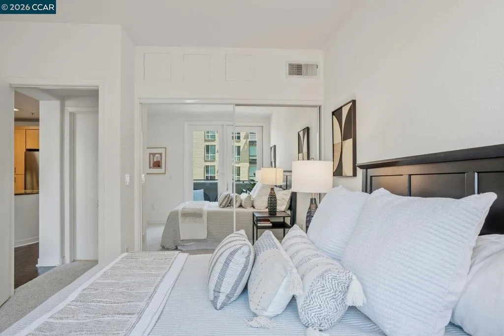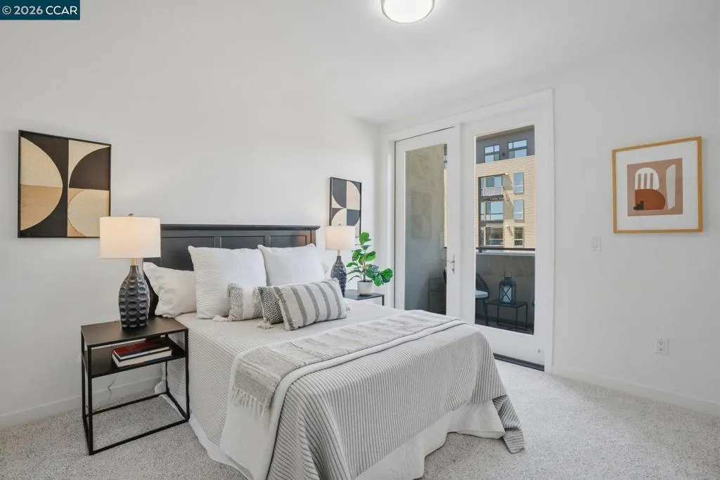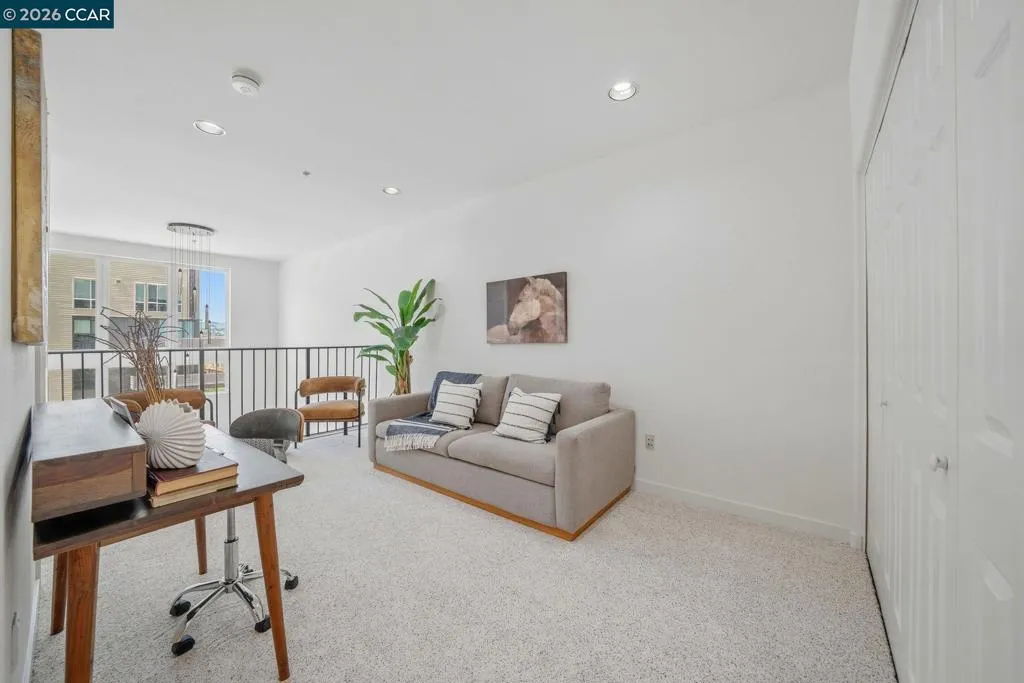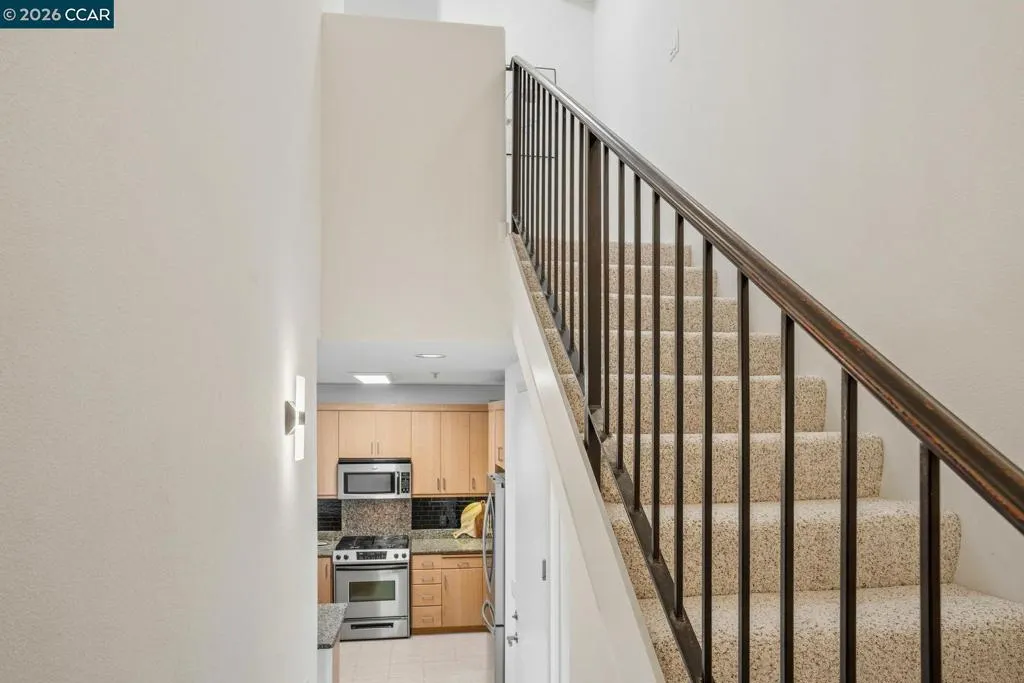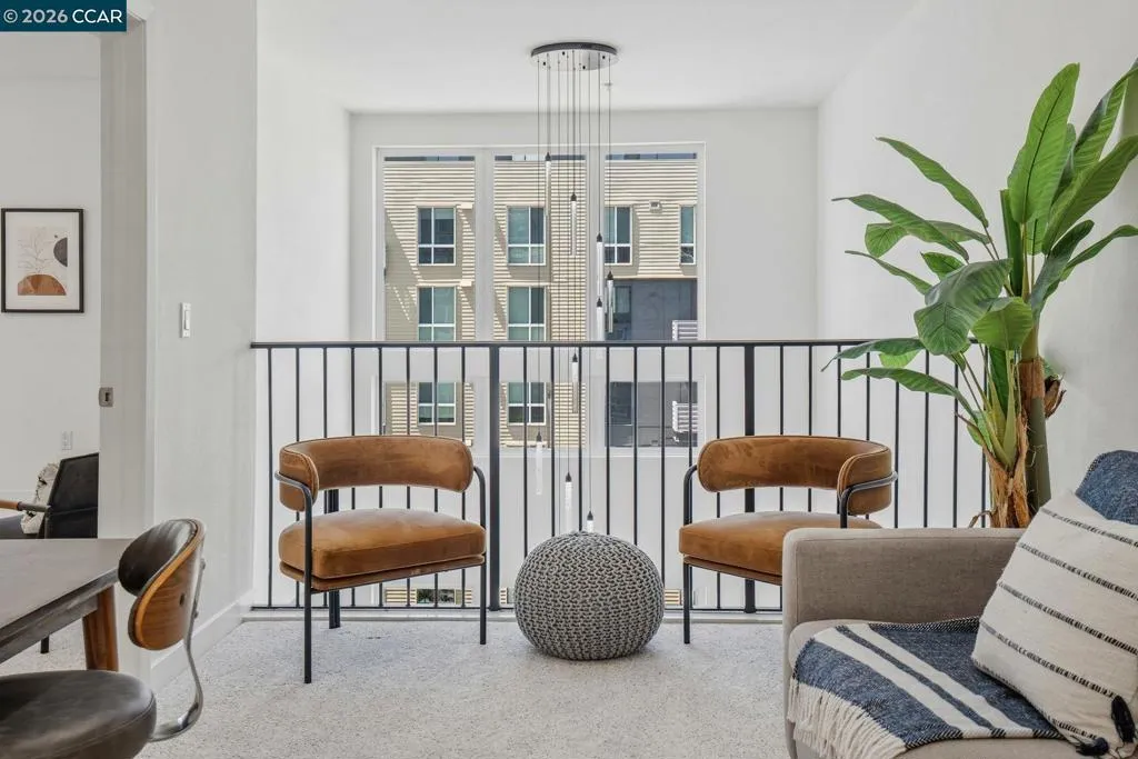 Sleek and sophisticated! Enjoy urban living in this rare, light-drenched two-level residence featuring dramatic double-height ceilings and soaring windows with stunning blue-sky views. The unique layout offers maximum privacy with one bedroom and a full bathroom on each floor, plus a versatile mezzanine loft perfect for a home office or gym. The open-concept interior boasts a chef’s kitchen with a gas stove and large peninsula, flowing seamlessly into the living area and a private balcony with East Bay Hill views. Enjoy ultimate convenience with in-unit laundry, two-car side-by-side deeded parking, and premium Homeowners Association amenities including a full gym, pool/game room, and onsite management. A true commuter’s dream, you are seconds from Dublin/Pleasanton BART, tech shuttles, and I-580/680, with Whole Foods and premier dining right around the corner.
