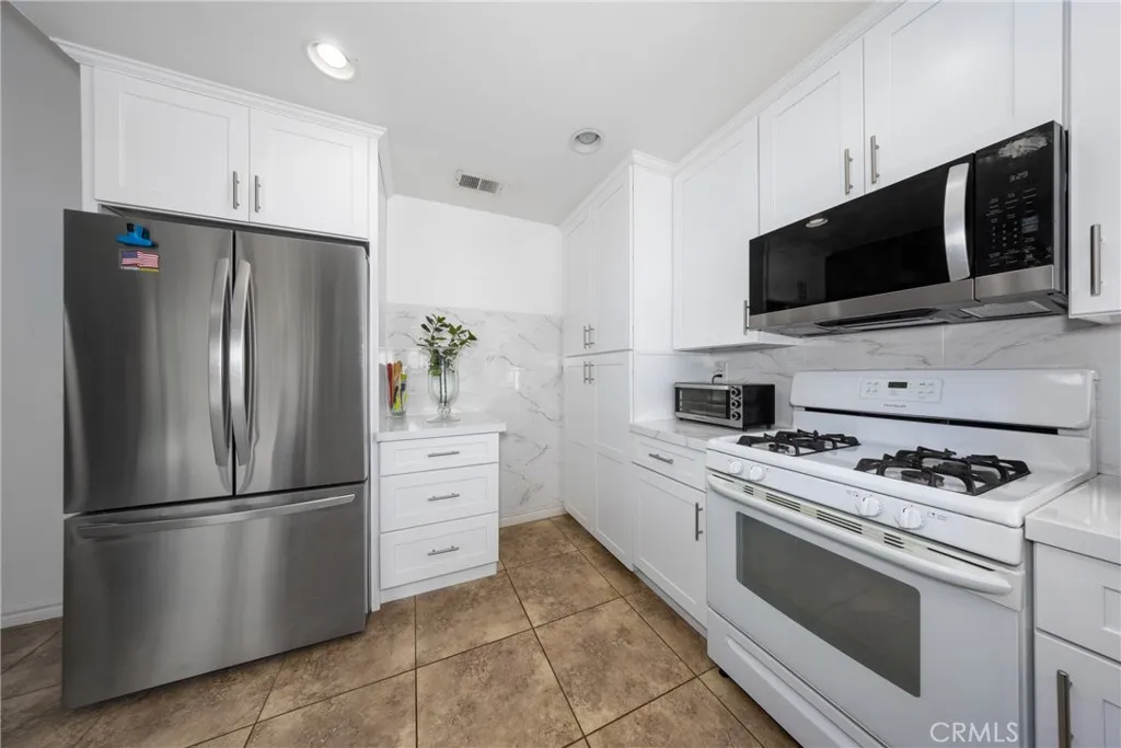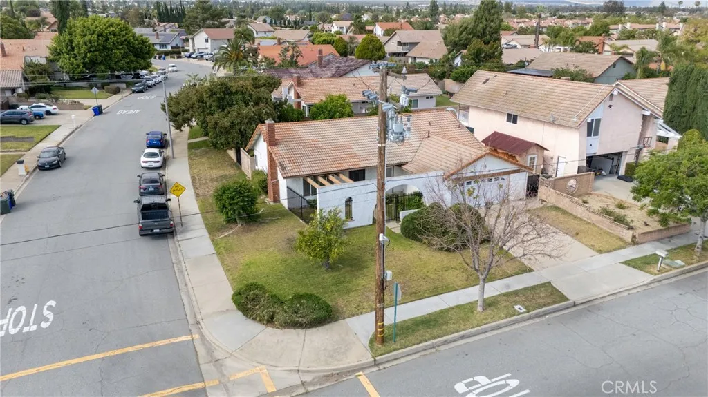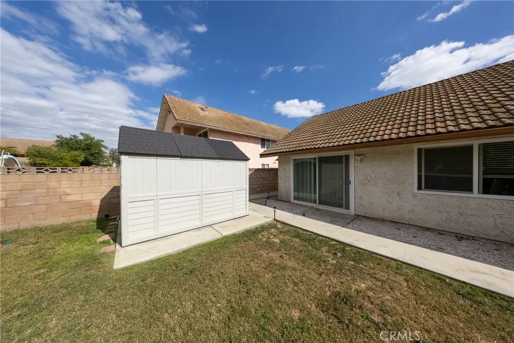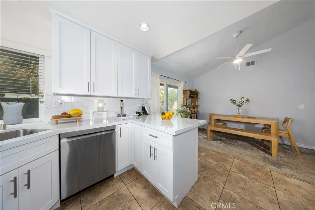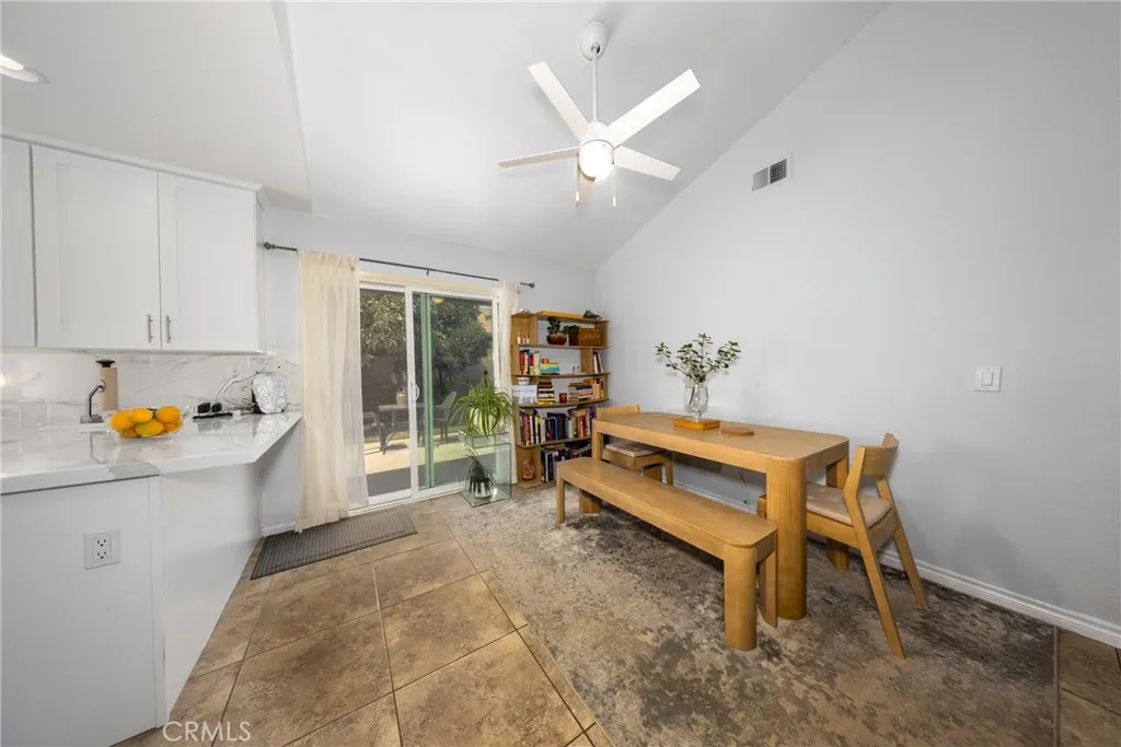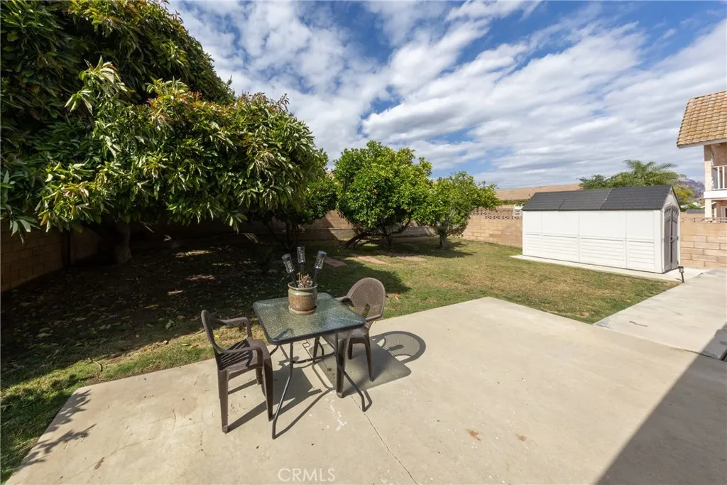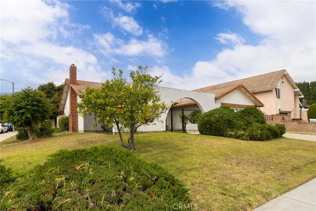 Desirable single-story home on a spacious corner lot, offering 3 bedrooms and 2 bathrooms with a bright, open-concept layout. The inviting living room features soaring ceilings and a cozy fireplace, creating a warm and welcoming ambiance. The upgraded kitchen is beautifully appointed with white quartz countertops, crisp white cabinetry, and both a breakfast bar and a sunny breakfast nook for casual dining. The private owner’s suite includes a sliding glass door with direct backyard access, while the en-suite bathroom features a granite vanity and a walk-in shower. Two additional bedrooms share a full bathroom with granite countertops and a shower/tub combination. Additional conveniences include an interior laundry room, a two-car attached garage, and an extended driveway for ample parking. Step outside to a generous backyard with lush landscaping and mature fruit trees—perfect for entertaining, relaxing, or cultivating your own garden. The gated front yard enhances privacy and offers a charming patio and garden space.