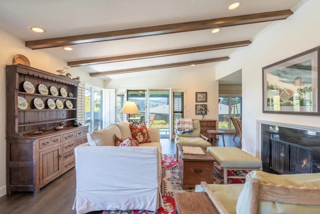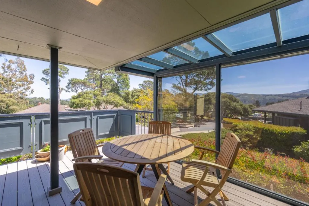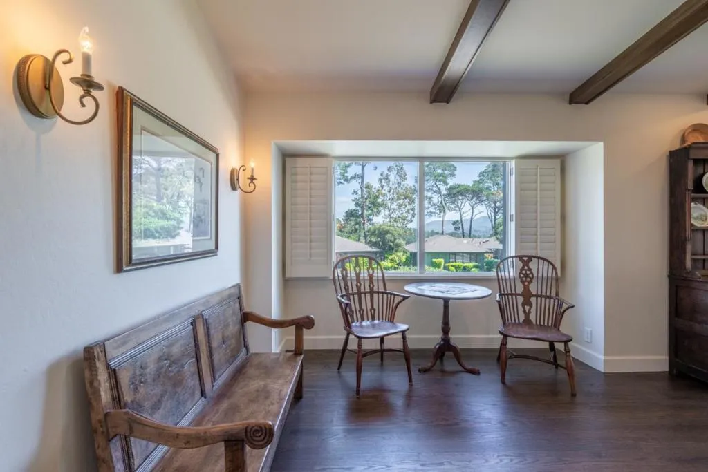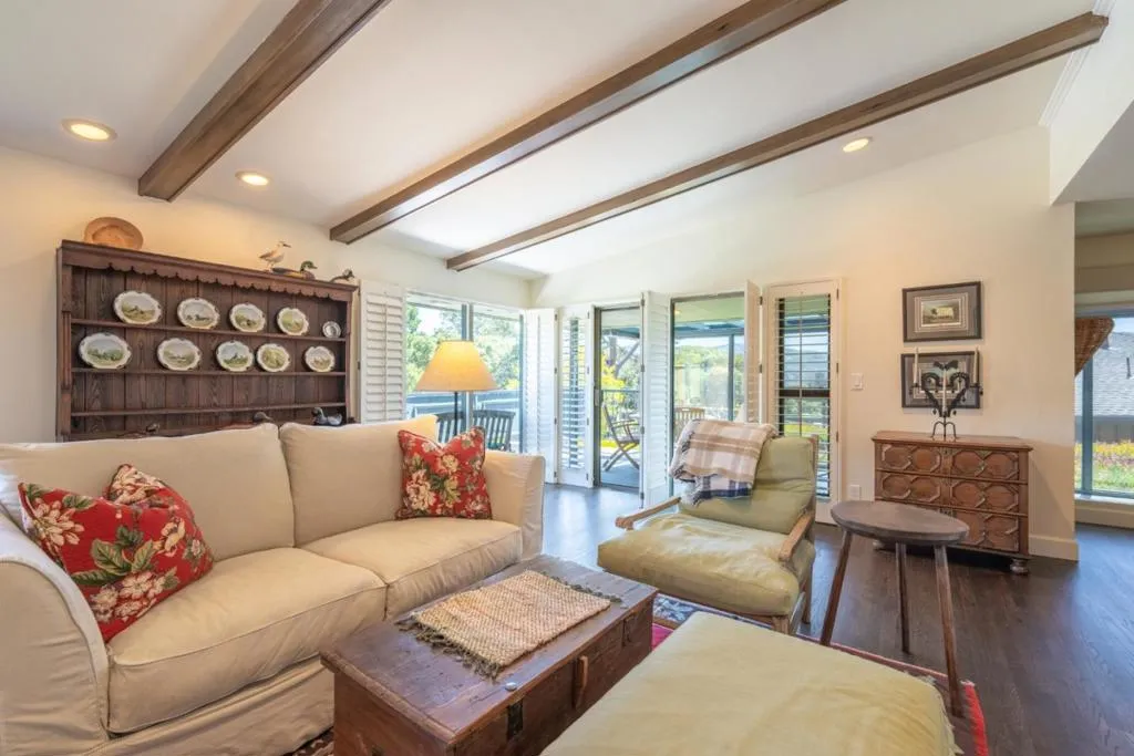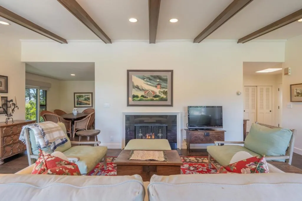 Tucked within the sought-after Del Mesa Carmel community, this south-facing 2-bedroom, 2-bath residence offers a warm blend of comfort and convenience in a serene setting. Thoughtfully updated, the home features new hardwood floors, fresh kitchen cabinetry, new appliances, and beautifully refinished exposed beams that add character to the living space. A gas-burning fireplace creates an inviting focal point, while radiant floor heating enhances everyday comfort. Natural light fills the home, with tinted windows in the dining area and primary suite providing added privacy. The mostly enclosed porch offers a versatile space to relax, read, or enjoy indoor-outdoor living year-round. Ideally positioned with parking just steps from the front door and a convenient carport, this home combines easy accessibility with low-maintenance living. Enjoy the peaceful surroundings and amenities of Del Mesa Carmel, all just moments from the charm of Carmel-by-the-Sea.