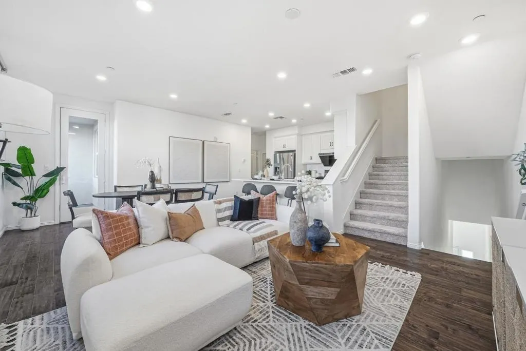 Contemporary corner unit in the desirable Onyx community. 3-story side-by-side townhome. Bright, open & spacious, this well maintained home is situated in a premium location of the complex w/ lots of privacy. Bright, open & spacious plan w/ plenty of upgrades. Formal living and dining areas w/ quality laminate wood floor. Open and functional kitchen w/ ample white cabinets, expansive marble counters & central island w/ convenient breakfast bar, completed w/ stainless steel appliances, Generous master suite w/ spacious ensuite bath featuring large shower & dual-sink vanity. Each bedroom has a good size and its own bathroom. Main floor has a bonus room/office. Special amenities in this community include BBQ/picnic area & dog park. Convenient location w/ short commute to downtown SJ, Japantown & shoppings including Costco, Ranch 99 & H-mart. Easy access to Bart, VTA & freeways 101/680. Walking distance to Google shuttle stop.