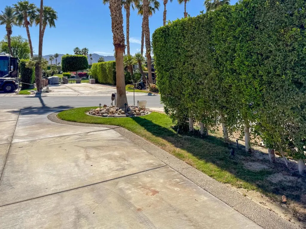 This beautiful luxury RV lot at Outdoor Resort Indio offers the perfect blend of comfort, privacy, and resort-style living. Located near the clubhouse yet tucked away against the resort entrance wall, the lot features a raised rear patio with pavers--ideal for entertaining or relaxing outdoors. Landscaping with extra palm trees and privacy hedges on both sides creates a serene, secluded atmosphere. Enjoy meals under the desert sky at a table with six chairs and two umbrellas, or fire up the BBQ for a perfect evening. The lot includes two convenient storage boxes, additional outdoor furniture, and a grassy pet area, making it both pet-friendly and practical. Whether you're looking for a personal retreat or an upscale home base for your RV lifestyle, this lot is a true gem.Outdoor Resort Indio is a Class A only RV park.