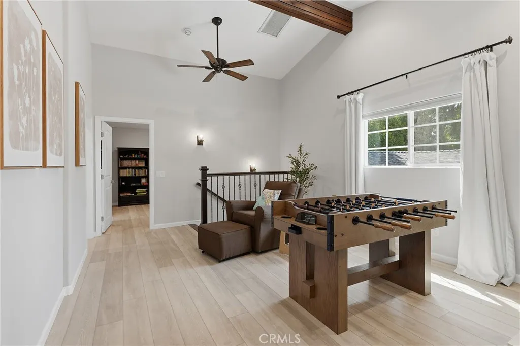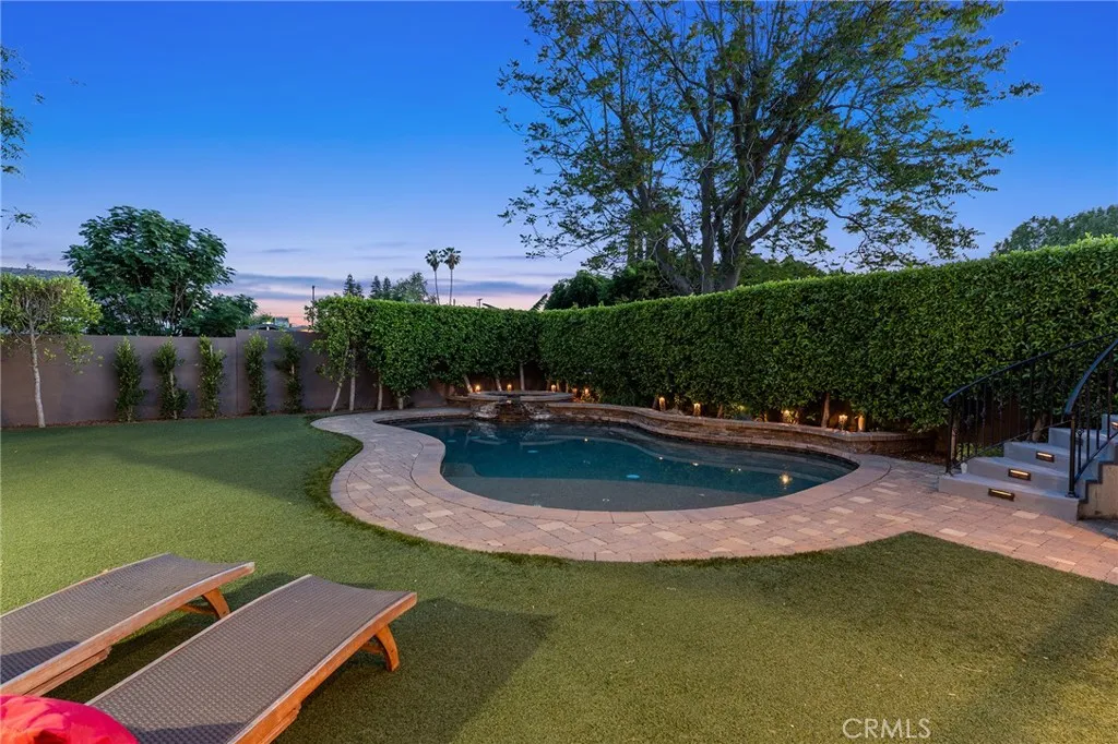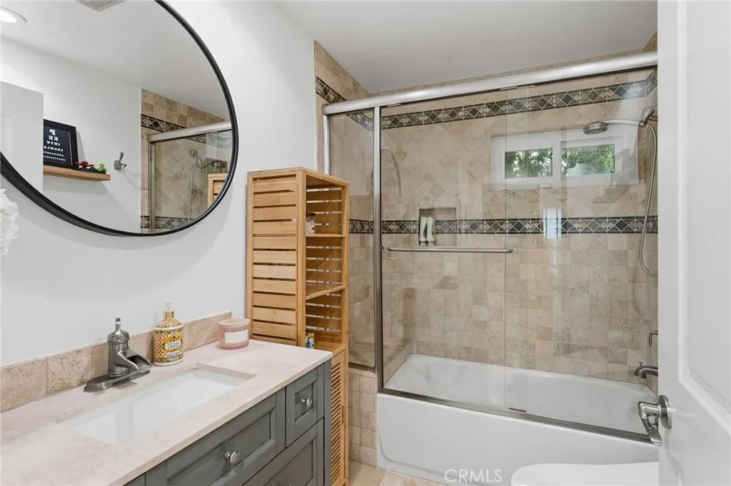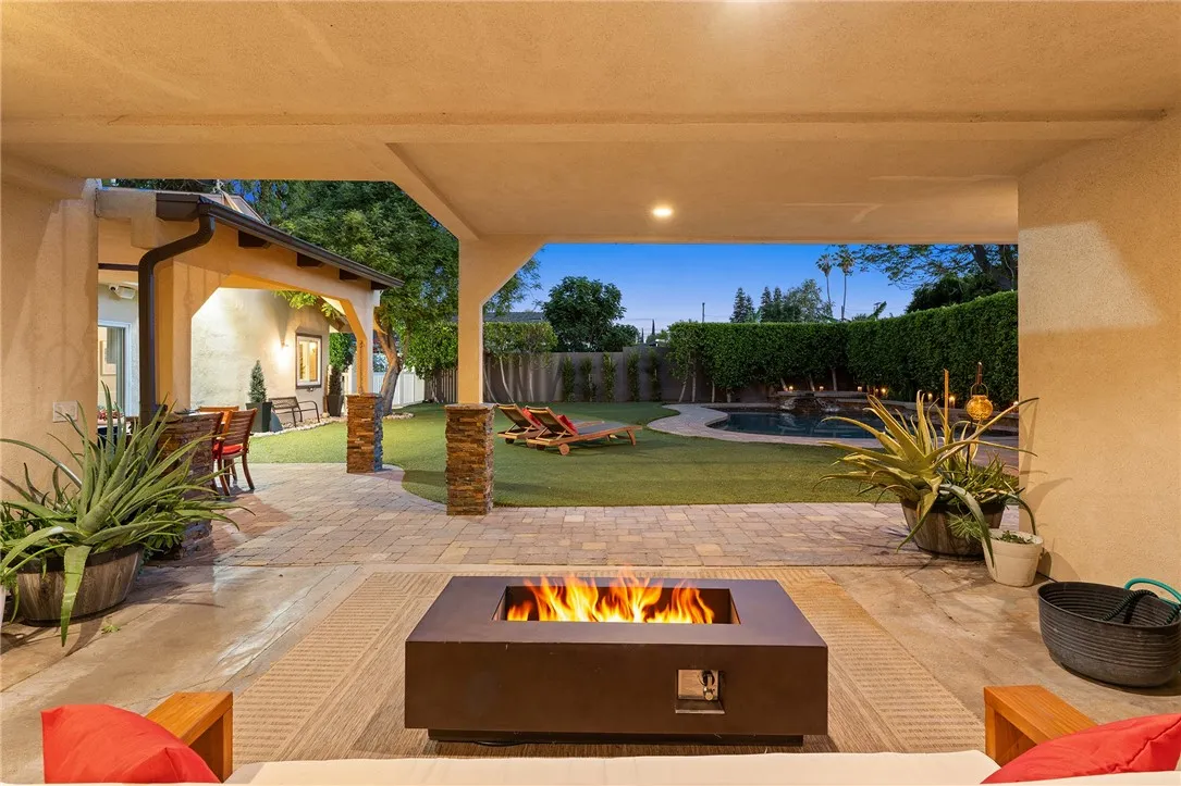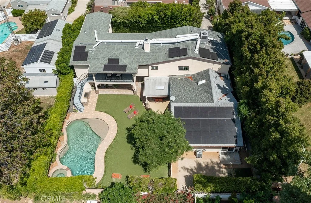 Walnut Acres remodeled estate with 466 SF guest house & incredible entertainer’s backyard situated 140 feet off the street behind an automatic security gate for ultimate privacy & seclusion. A long driveway flanked by mature hedging leads to expansive parking for large gatherings including 2-car attached garage & additional covered parking. Step inside to find an open floor plan flooded with natural light with upgraded flooring throughout. The spacious living room has stacked stone fireplace and wraparound picture windows. Gorgeous completely remodeled kitchen boasts large center island with second prep sink & quartz waterfall counters, stainless Thermador appliances including paneled refrigeration, double ovens & 5-burner cooktop, custom soft close cabinetry with incredible pantry space, & breakfast room with glass sliders that open to the backyard. Separate formal dining room features high vaulted ceiling & bar with display cabinetry, serving counter & fridge. A first floor bedroom is ideal for guests or office space with access to a full bathroom and a large side yard. Upstairs you will find four additional bedrooms, a versatile loft providing the perfect flex space for any need, and a convenient upstairs large laundry room with storage cabinetry. The massive approx. 1,000 SF primary suite has private covered balcony deck overlooking the yard, 2 large cedar-lined walk-in closets, separate sitting room currently used as gym, & luxurious en-suite bathroom with heated floors, fireplace, dual custom stone integrated sink vanities, makeup counter, spa tub, steam shower, & toilet room with bidet. Three upstairs secondary bedrooms each have high vaulted ceilings with custom closets & share two full bathrooms each with dual sinks, tubs, & showers. The expansive backyard is truly a private oasis featuring PebbleTec saltwater pool with baja ledge & waterfall spa, BBQ center, covered paver stone patio for outdoor dining, sprawling lawn for play, and mature landscaping with privacy hedging. The separate 466 SF guest house (included in total SF) has its own address/parking, kitchen, living room, & full bathroom. System upgrades per seller: solar panels for terrific energy savings, newer HVAC & water heater, Milgard windows/slider, security cameras, & speaker system. Adjacent to Westfield Mall/Village, Calabasas Commons, Warner Center with the new Rams Village in development, local parks/hiking trails, & zoned for award-winning El Camino & Hale charter schools.