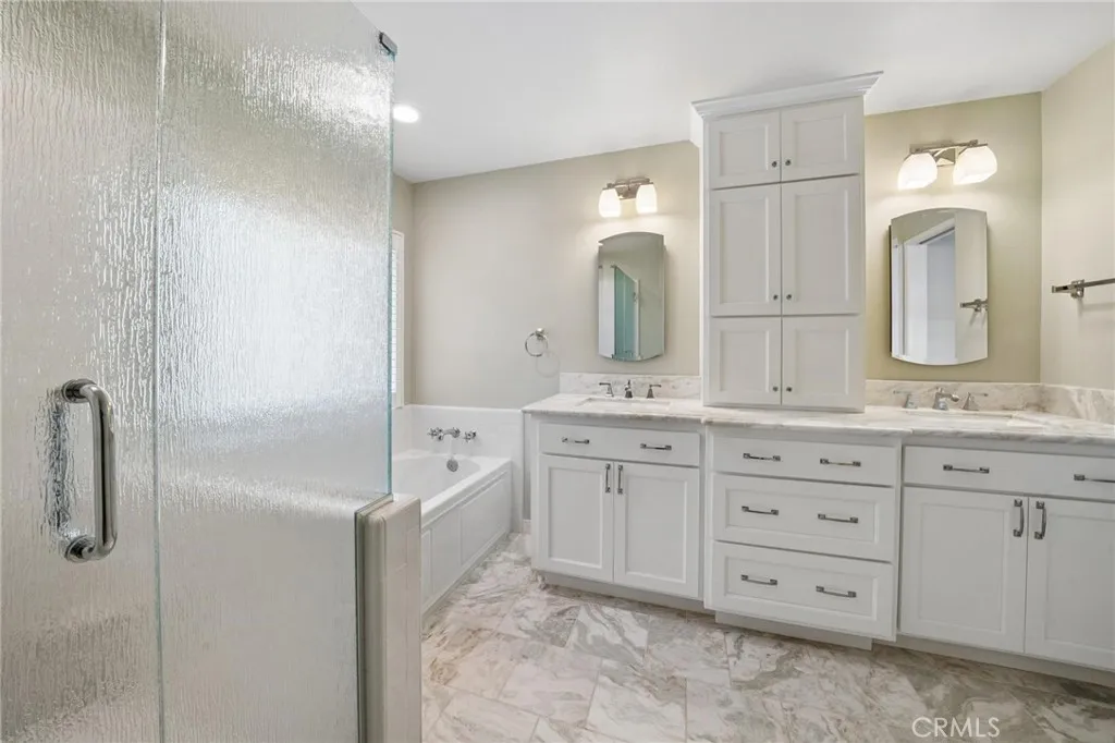 Welcome to this exceptional Plum Canyon residence offering the rare advantage of no HOA and no Mello Roos. Thoughtfully designed with both elegance and functionality in mind, this home features a desirable layout and high-quality upgrades throughout. A formal living room with soaring ceilings creates a grand first impression, while a main-level bedroom and full bathroom provide ideal flexibility for guests or multi-generational living. At the heart of the home, the fully renovated kitchen showcases custom white cabinetry with soft-close doors and pull-outs, Cambria quartz countertops, a sea glass subway tile backsplash, and stainless steel appliances—perfectly blending style and everyday convenience. The adjacent family room offers both comfort and style, featuring a custom built-in media unit and a beautifully updated fireplace with newer doors, tile, and mantel—each thoughtfully positioned on separate walls to create a balanced and functional living space. Porcelain tile flooring flows through the main living areas, complemented by plush carpeting on the stairs and in the bedrooms. Plantation shutters, custom drapery, and all-new windows elevate both the aesthetic and energy efficiency of the home. Upstairs, you’ll find four well-appointed bedrooms, including a spacious and inviting primary suite. Designed as a private retreat, the primary offers custom closet organizers and a beautifully remodeled en-suite bath featuring dual vanities with built-in storage, striking Lady Onyx countertops, tile flooring, a separate soaking tub, and a walk-in shower. The secondary bathroom serving the additional bedrooms is equally well-appointed, showcasing neutral gray tile and a crisp white vanity, creating a cohesive and refined feel throughout the upper level. Step outside to a private backyard designed for comfort and entertaining, featuring a covered patio, manicured grass area, and thoughtfully designed hardscape—creating a perfect balance of relaxation and outdoor enjoyment.