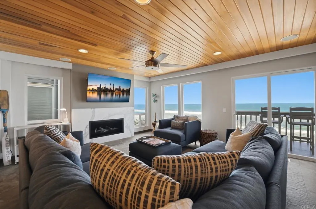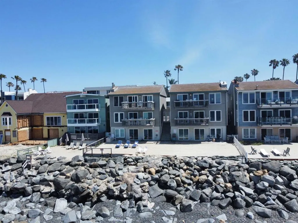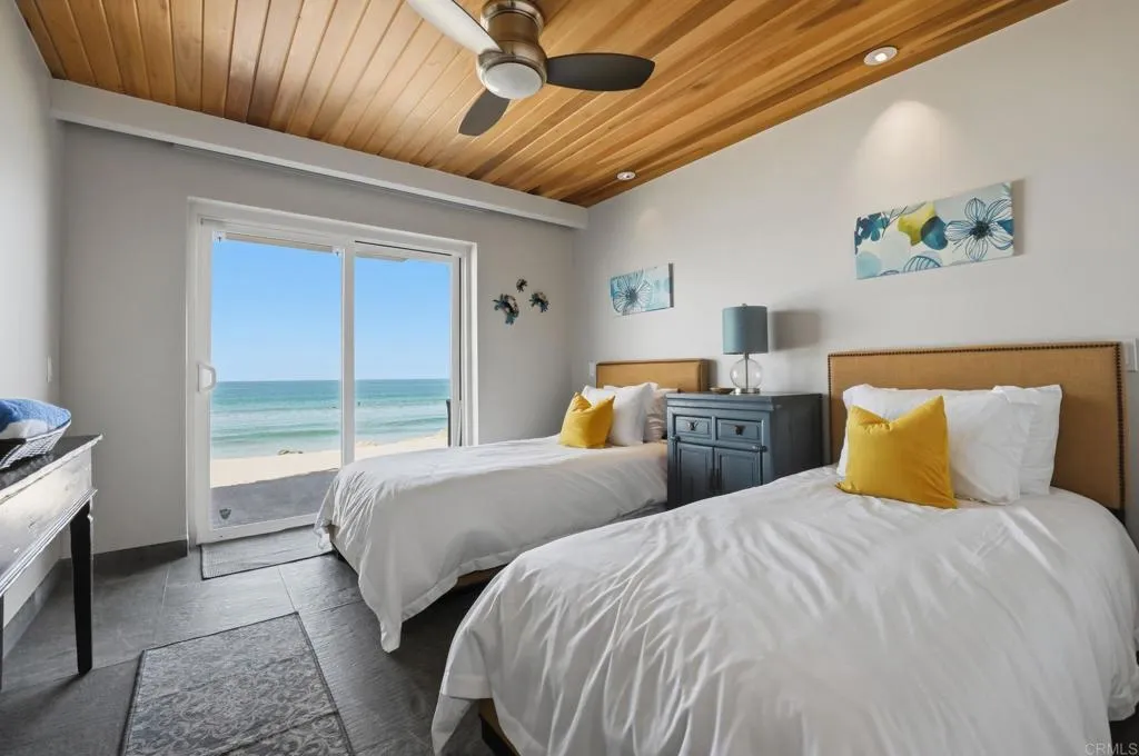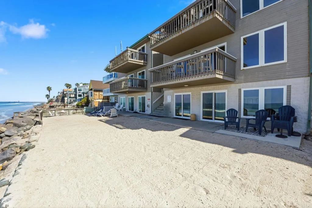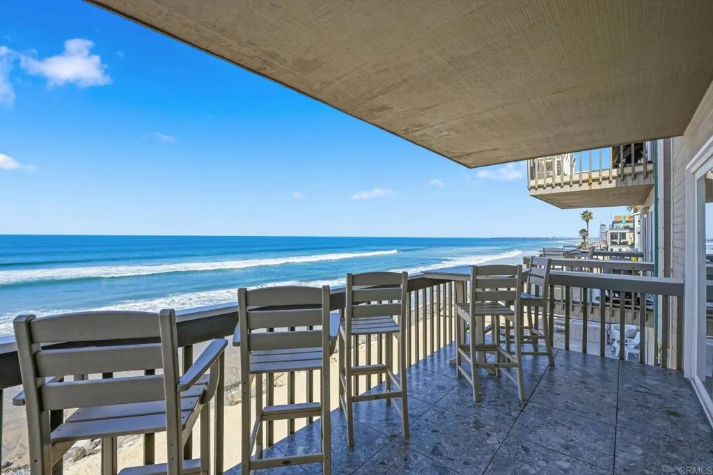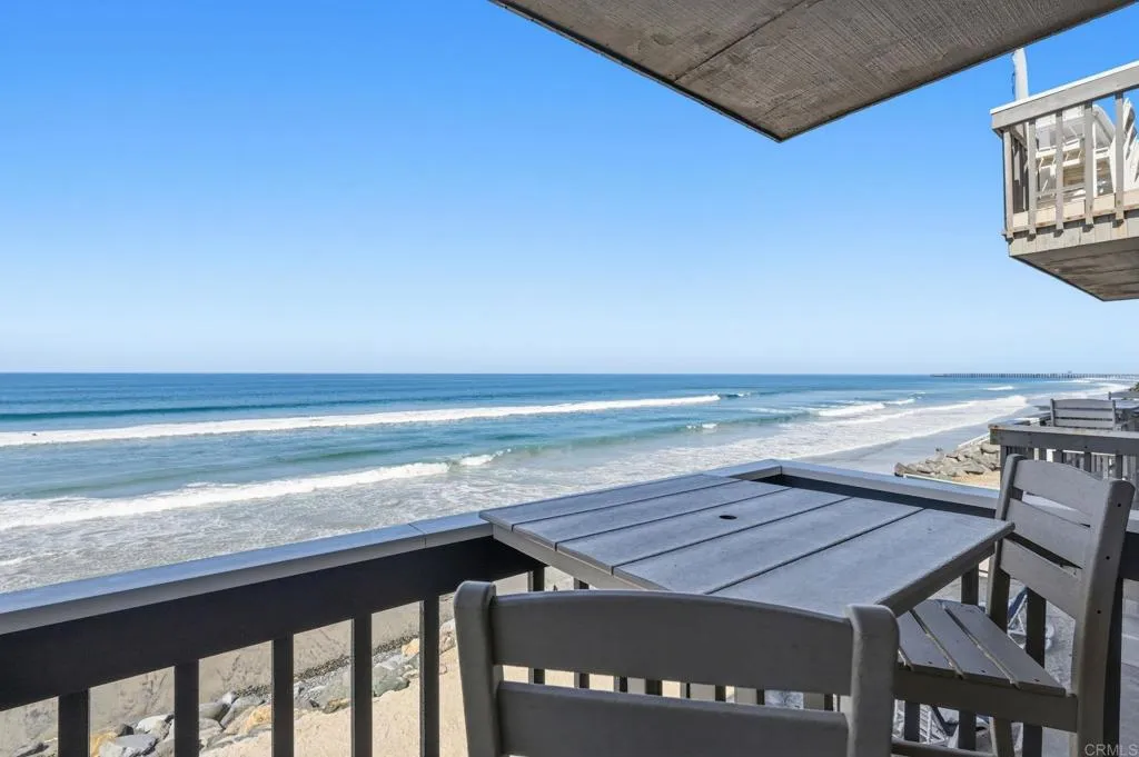 Oceanfront luxury with panoramic ocean views & direct access to a private beach. Step out your doors onto sand! Beautifully upgraded in a modern design with high end materials. Entry on the second floor to your oceanfront living room, beautiful open kitchen with custom cabinets, quartz counters, Thermador appliances & bar seating for 6, lava stone flooring, poplar wood ceilings, custom interior doors and curated accent art lighting. Step out onto the deck and see the surfers and dolphins play. There is a full bedroom and bathroom on the second floor allowing for guests that need no stairs. Down stairs you will find 2 bedrooms with sliders that open directly to a private beach and private patio. Large primary bedroom has lots of natural light flowing through the bedroom and bathroom. The primary shower has dual shower heads, a 3rd rain showerhead, quartz walls and river rock flooring, extensive built-in bamboo cabinets and a walk in closet with built ins. The private beach sits above the city beach below. The attached 2 car garage makes getting in and out a breeze and perfect for storing all your toys! Walk to popular coffee shops, restaurants and bars. Bike to the pier or harbor or just stay put on your private beach. Only 4 units in the complex. Weekly rentals are permitted.