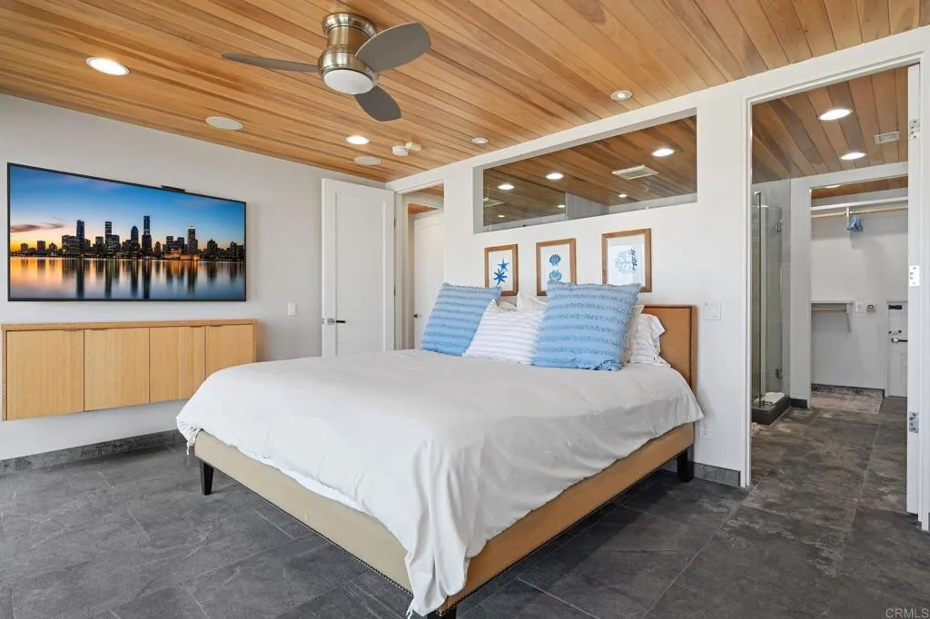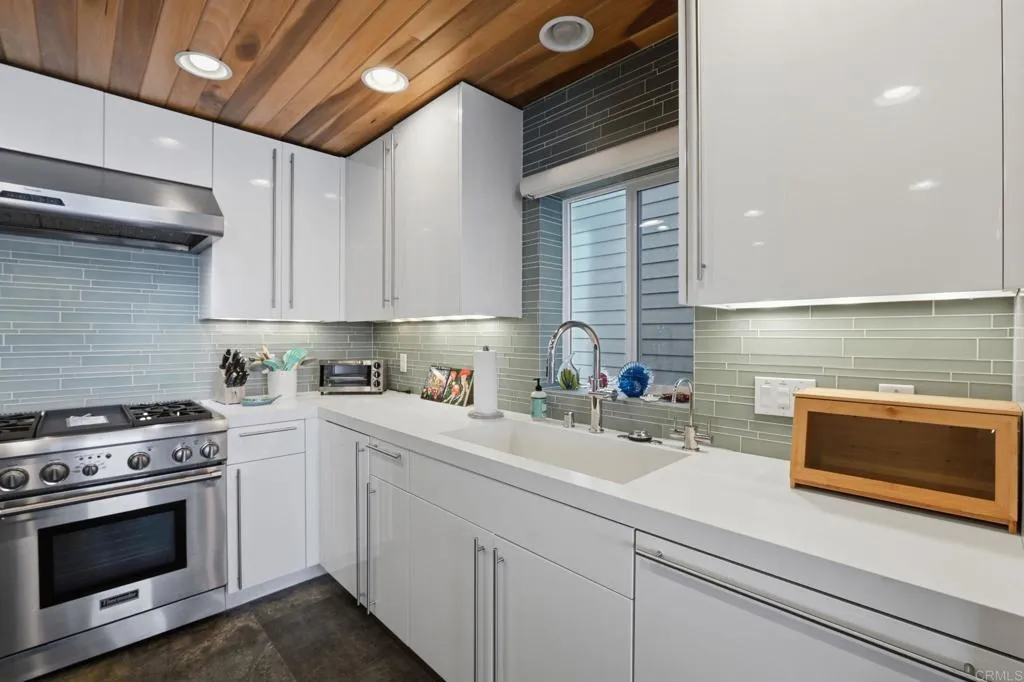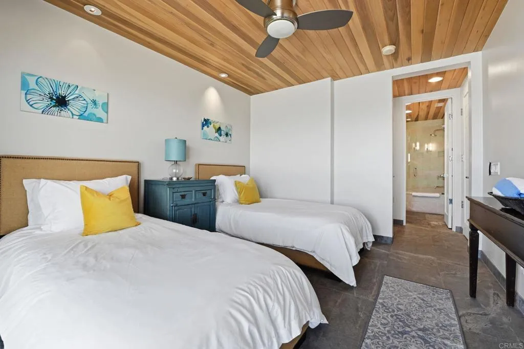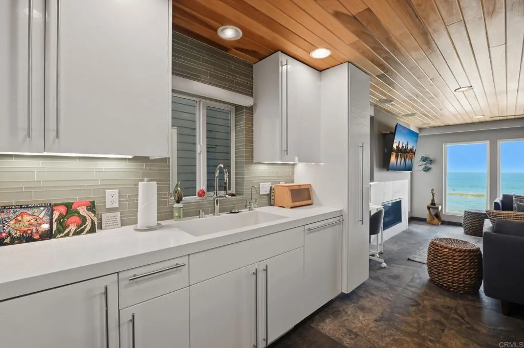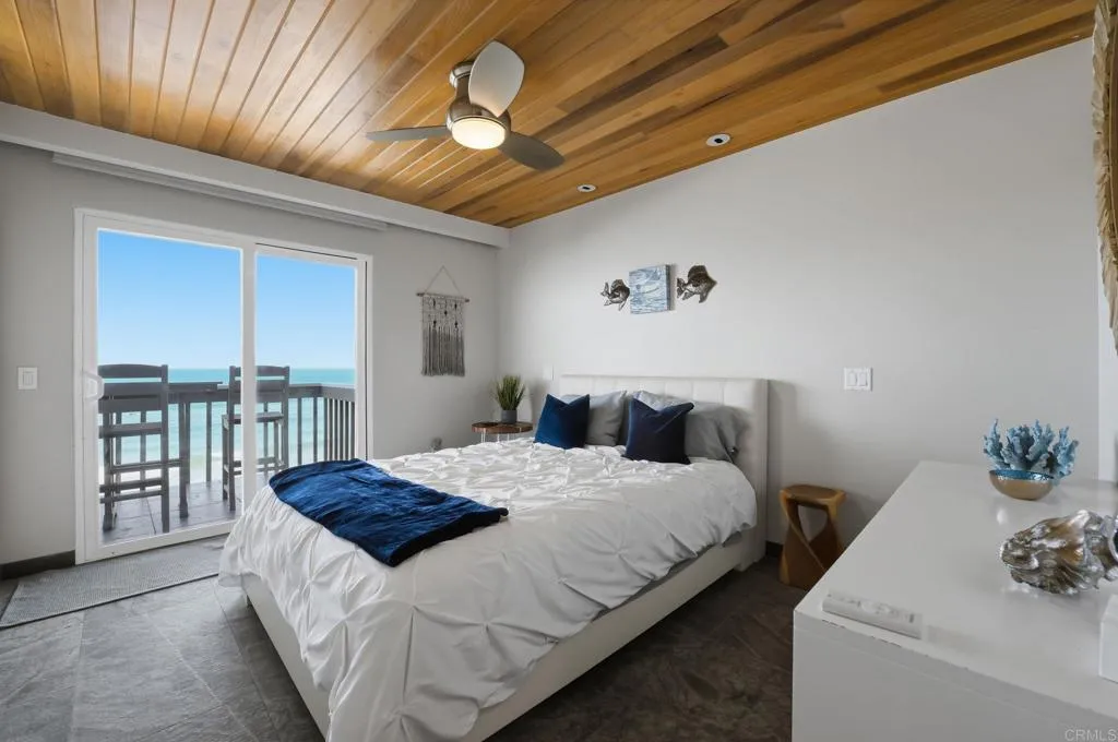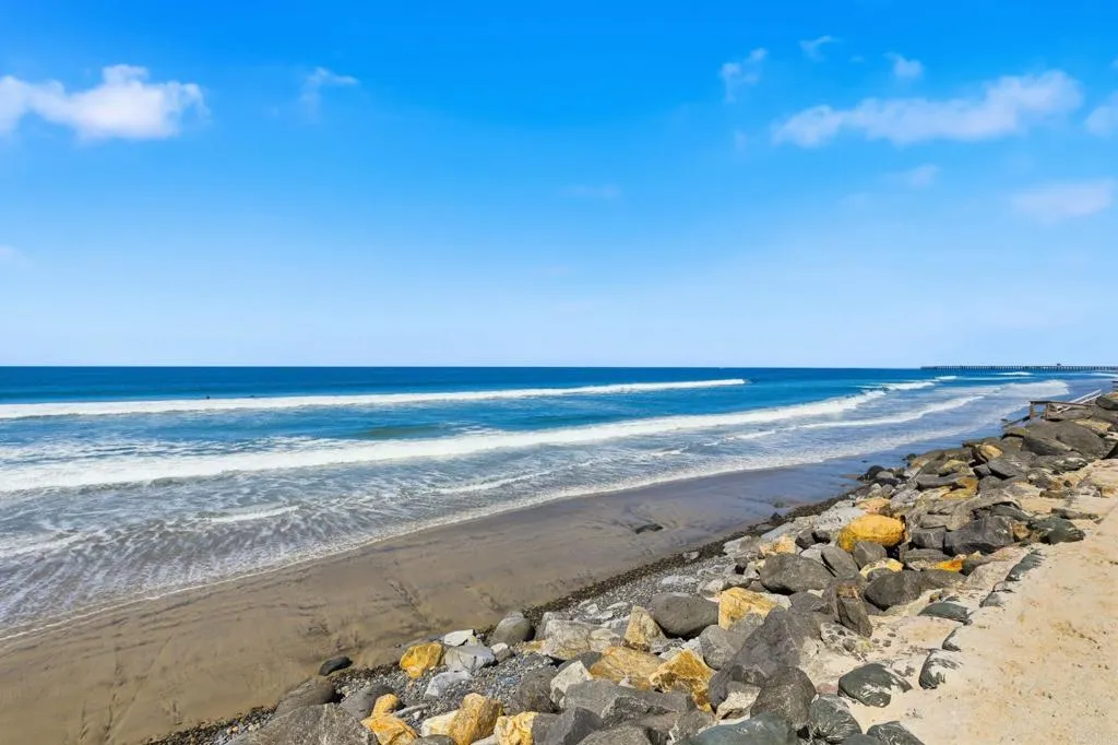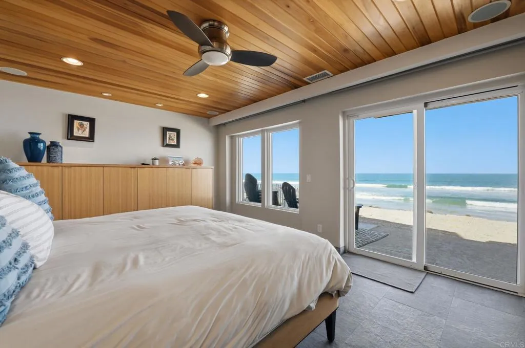 Oceanfront luxury with panoramic ocean views & direct access to a private beach. Step out your doors onto sand! Beautifully upgraded in a modern design with high end materials. Entry on the second floor to your oceanfront living room, beautiful open kitchen with custom cabinets, quartz counters, Thermador appliances & bar seating for 6, lava stone flooring, poplar wood ceilings, custom interior doors and curated accent art lighting. Step out onto the deck and see the surfers and dolphins play. There is a full bedroom and bathroom on the second floor allowing for guests that need no stairs. Down stairs you will find 2 bedrooms with sliders that open directly to a private beach and private patio. Large primary bedroom has lots of natural light flowing through the bedroom and bathroom. The primary shower has dual shower heads, a 3rd rain showerhead, quartz walls and river rock flooring, extensive built-in bamboo cabinets and a walk in closet with built ins. The private beach sits above the city beach below. The attached 2 car garage makes getting in and out a breeze and perfect for storing all your toys! Walk to popular coffee shops, restaurants and bars. Bike to the pier or harbor or just stay put on your private beach. Only 4 units in the complex. Weekly rentals are permitted.