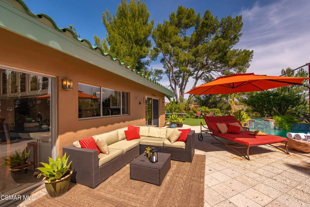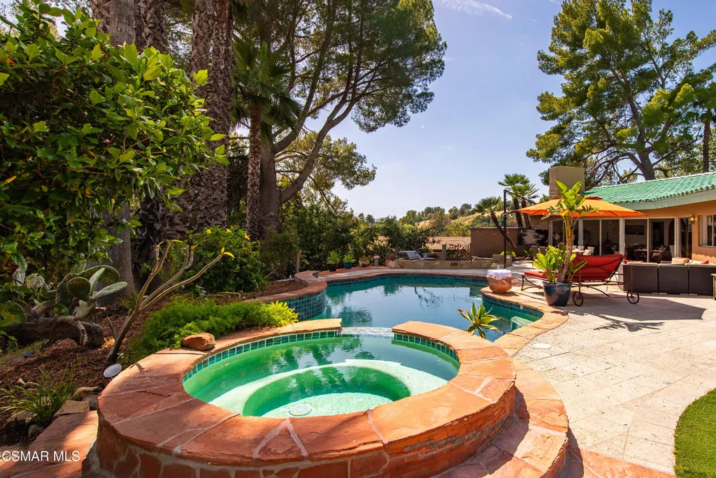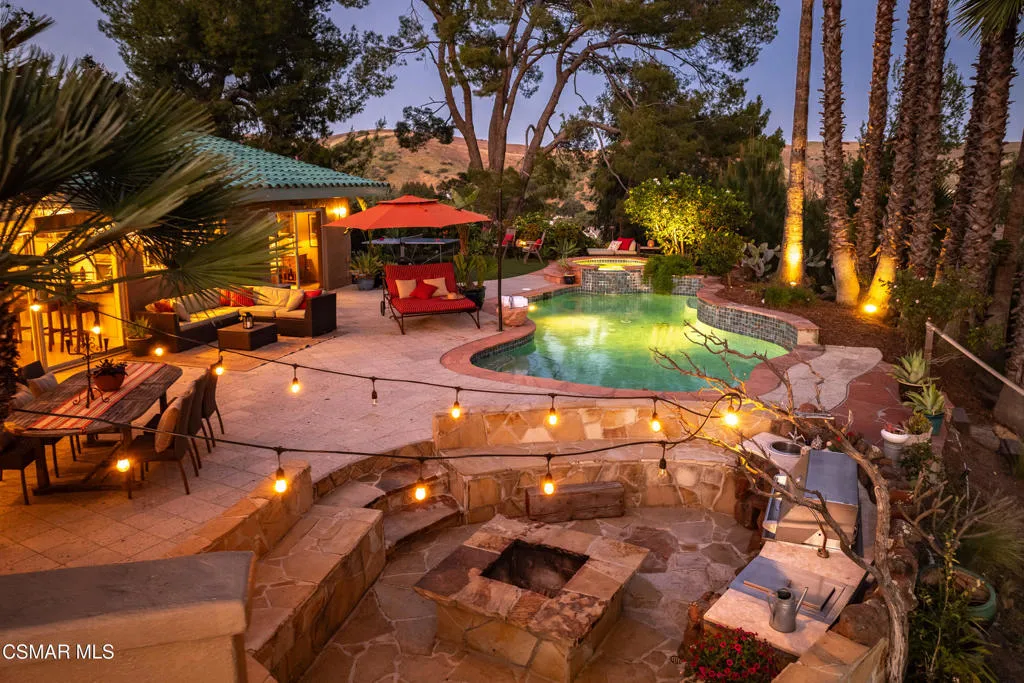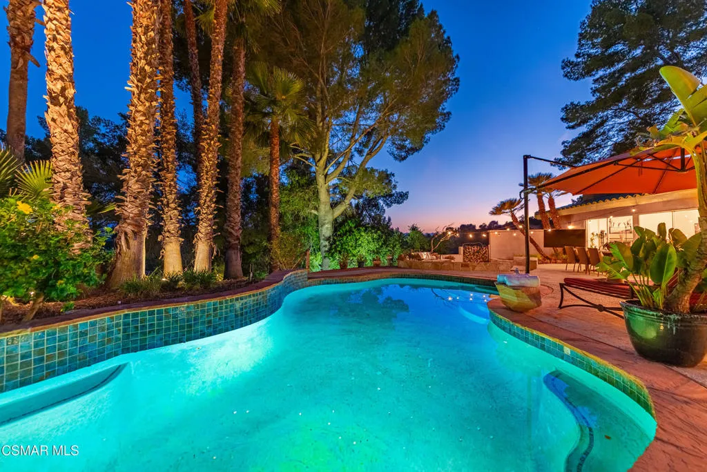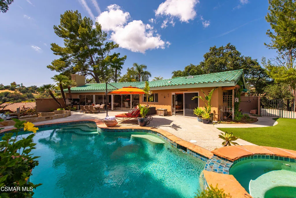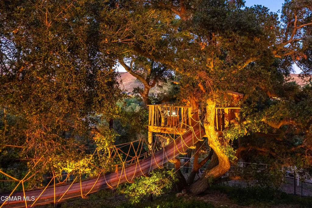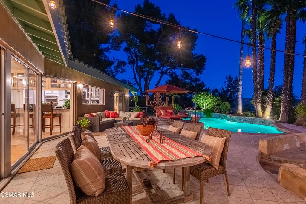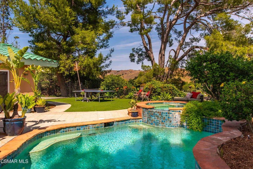 Sweeping, cinematic views stretch in every direction from this gated single-story home atop a rare, flat hilltop location. Rolling hills dotted with mature trees create a backdrop that feels both expansive and deeply serene. Welcome to ''Casa Tequila,'' where the resort-like atmosphere is relaxed, inviting, and effortlessly fun. Life here has an easy, vacation-like rhythm that makes it hard to leave. The residence is privately gated with a wide circular driveway. The property is ideal for those seeking an extremely private setting; the home and majority of the property cannot be seen from the street. The home itself has a versatile floor plan, featuring three en-suite bedrooms, a charming powder room and a great room with peaked wood ceiling. Tucked away at the far end of the home you'll find the primary suite, which not only offers an outdoor shower, it's also just steps from the pool and spa and the resort vibe you'll love. Just off the kitchen and great room is a long wall of sliding glass doors revealing a panorama of trees and hills, while the sprawling backyard patio beckons fun and relaxation. The outdoor BBQ area, complete with a sink, firepit, and built-in seating, sets the stage for lively gatherings and unhurried evenings under the stars. There's also a gate at the back of the parcel affording an additional way to access the property. Adding to the property's charisma is a delightful bunkhouse with a Dutch door and peaked wood ceiling. It makes for a fun hang out for kids or a creative office space where you can work while immersed in nature. Don't miss the whimsical treehouse reminiscent of Swiss Family Robinson. So much to explore tucked among magnificent oak trees in this storybook setting! (Neither structure is included in the square footage). Located just a few minutes to town, Old Agoura is city close but feels like a world away. The property is in the acclaimed Las Virgenes school system and near top private schools. Cheeseboro National Park with its 4,000 acres of horse, cycling and hiking trails is very close by and Malibu beaches are about 20 minutes away.