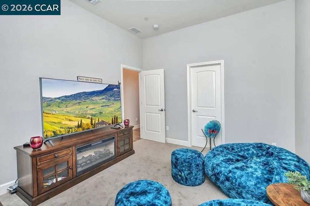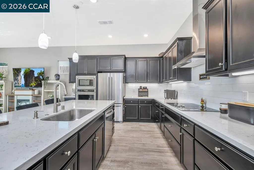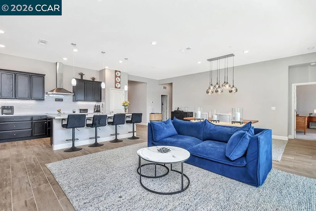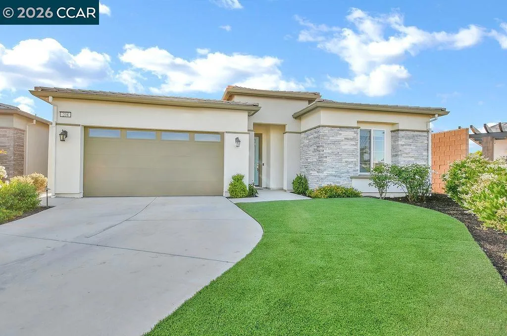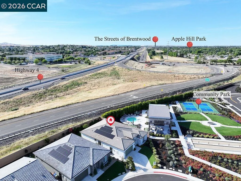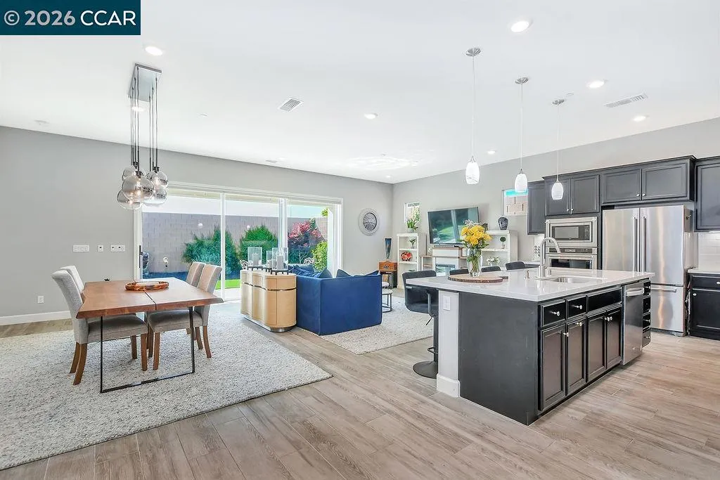 Welcome to 208 Chinook Dr., a beautifully maintained single-story home in the sought-after Kindred & Balfour community by Shea Homes — Brentwood's intimate 55+ neighborhood. Built in 2022, this 3-bedroom, 2-bath residence lives like a model, with custom lighting throughout and an open-concept layout designed for easy, elegant living. The chef's kitchen features espresso cabinetry paired with Silestone countertops, flowing seamlessly into the dining and living spaces. Step through the stunning 15-foot multi-panel sliding door and find yourself in a covered outdoor patio surrounded by lush, extensively landscaped front and back yards — designed for year-round entertaining or quiet evenings under the California sky. Wood-style tile floors run through main living areas, with carpet in the bedrooms for comfort. The primary bath includes solid surface countertops and a spa-style shower surround. Additional cabinetry in the laundry room keeps everything organized and out of sight, and solar panels to keep utility costs low. Residents enjoy access to a planned clubhouse with a community kitchen, indoor/outdoor social spaces, pool, spa, pickleball, and bocce courts. Just minutes from Brentwood's parks, trails, wine country, and everyday shopping. This is the low-maintenance lifestyle buyers in this community are looking for — fully realized and ready to go.