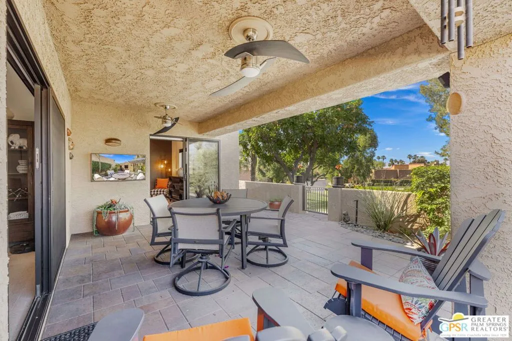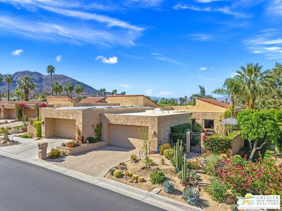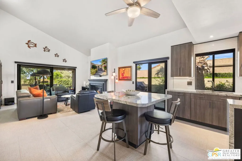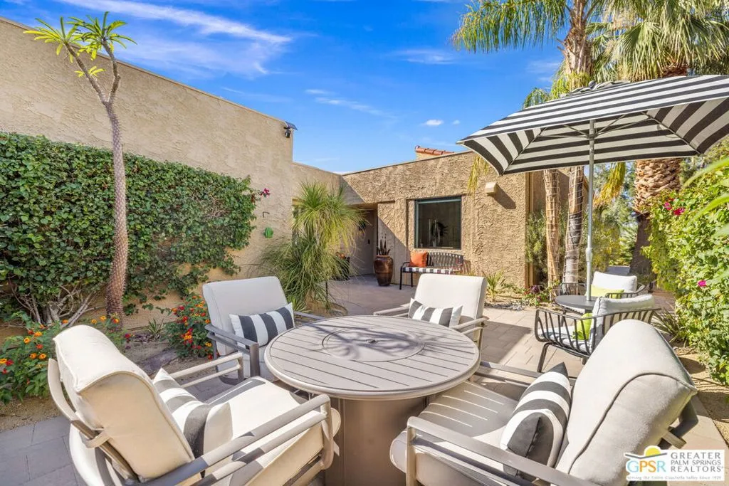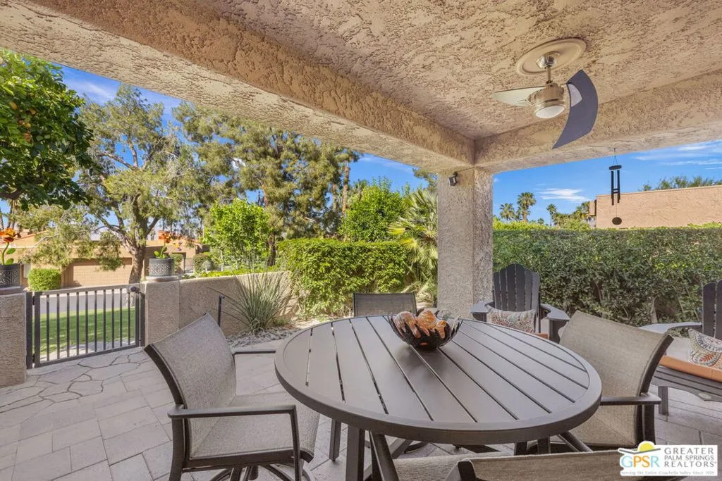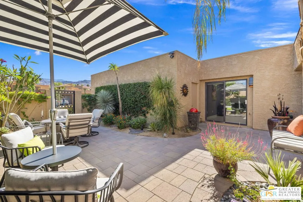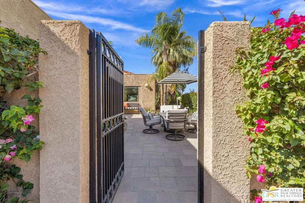 Polished and perfectly kept. A pride of ownership Ironwood villa that truly stands out. Offered TURNKEY FURNISHED with golf cart included, this extensively remodeled end unit on a quiet cul de sac delivers privacy, refined finishes, and a layout that truly lives well. A gated courtyard with mature landscaping and custom wrought iron entry sets a beautiful sense of arrival, opening to a light filled living room with vaulted ceilings and clerestory windows overhead. A sleek contemporary fireplace and a stylish wet bar with wine cooler anchor the space, creating an easy setting for entertaining. The expanded kitchen is a true focal point, finished with custom dark wood cabinetry, slab granite counters, waterfall edge island, glass tile backsplash, and stainless appliances, all connecting naturally to the surrounding outdoor spaces. The primary suite is a quiet retreat with a spa style bath, dual sink granite vanity, and an expansive open walk in shower. The guest suite has been thoughtfully reimagined to include a separate sitting area or office with its own private entrance, offering excellent flexibility. Outdoor living is a standout with multiple shaded conversation areas, a built in stainless BBQ, and a private back patio overlooking greenbelt space with no rear neighbors. Finished two car garage with epoxy floors, extensive built in storage, and dual workbenches. Lovely mountain views from the courtyard. Ideally located near two pools and spas, with optional Ironwood memberships available for golf, tennis, fitness, and dining, rounding out the best of desert club living.