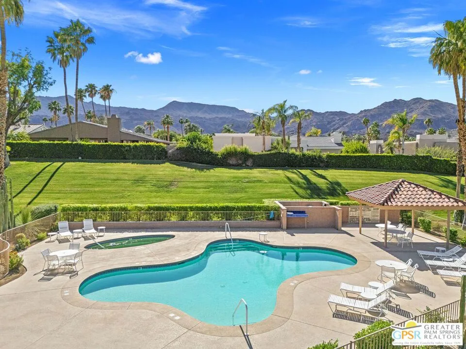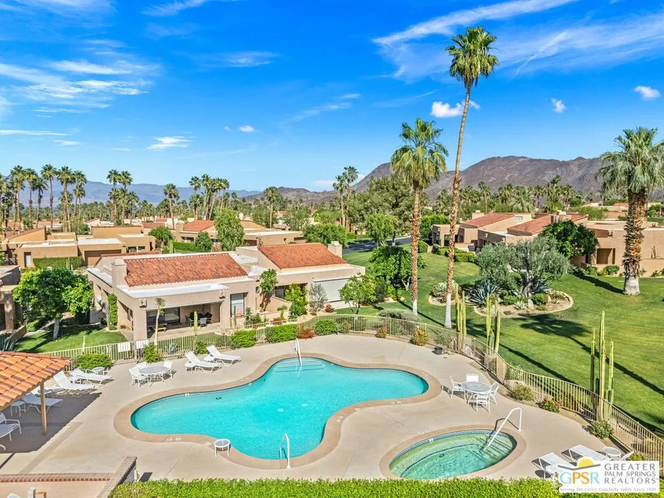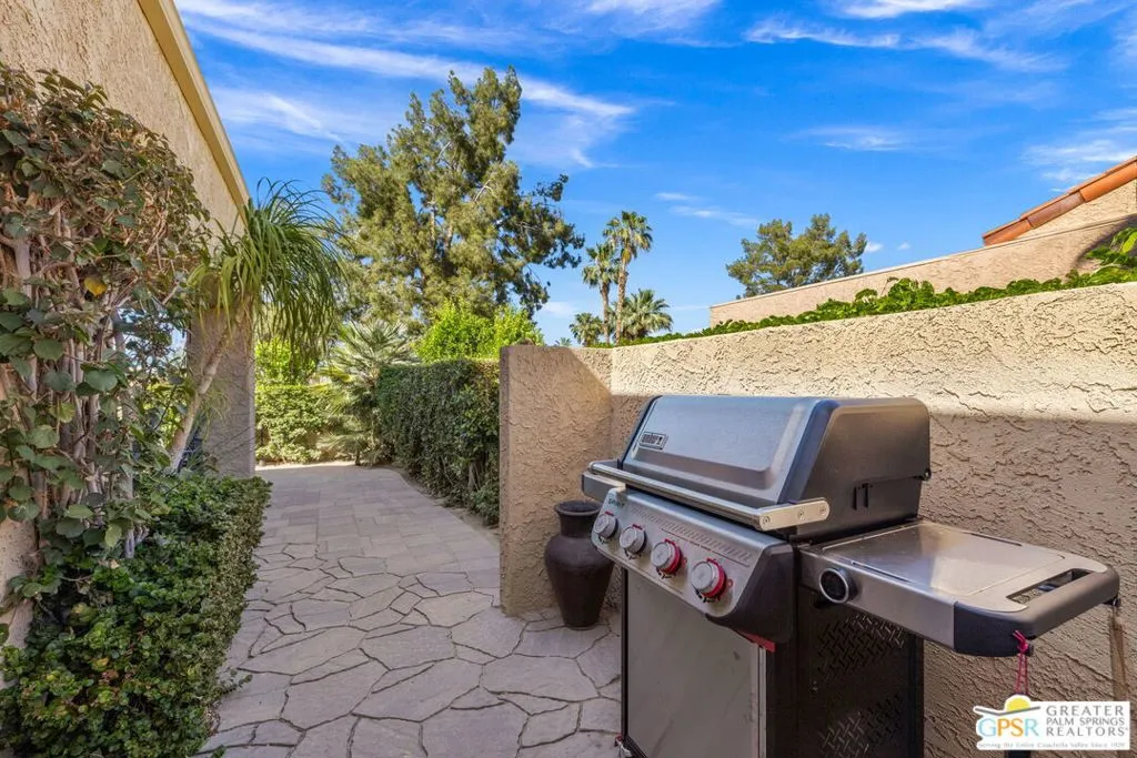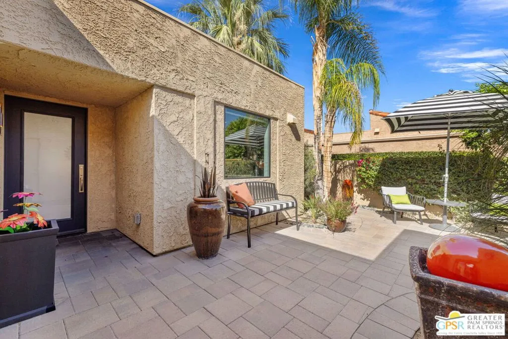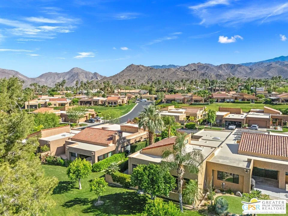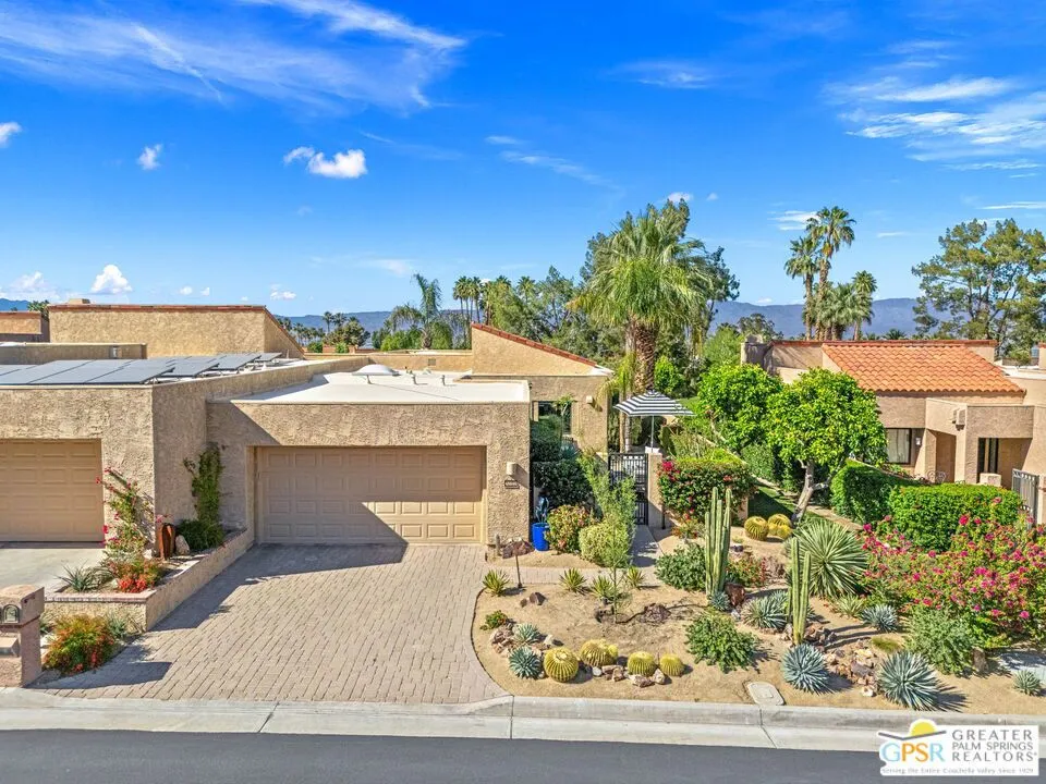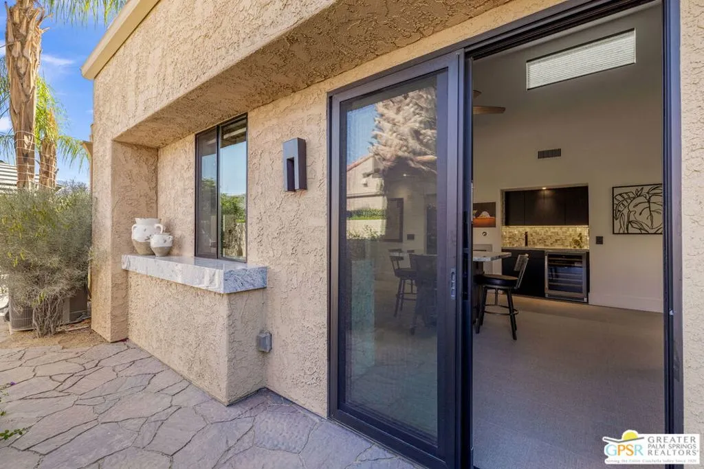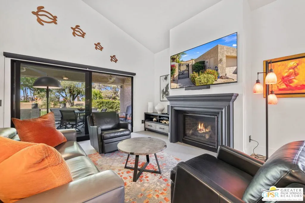 Polished and perfectly kept. A pride of ownership Ironwood villa that truly stands out. Offered TURNKEY FURNISHED with golf cart included, this extensively remodeled end unit on a quiet cul de sac delivers privacy, refined finishes, and a layout that truly lives well. A gated courtyard with mature landscaping and custom wrought iron entry sets a beautiful sense of arrival, opening to a light filled living room with vaulted ceilings and clerestory windows overhead. A sleek contemporary fireplace and a stylish wet bar with wine cooler anchor the space, creating an easy setting for entertaining. The expanded kitchen is a true focal point, finished with custom dark wood cabinetry, slab granite counters, waterfall edge island, glass tile backsplash, and stainless appliances, all connecting naturally to the surrounding outdoor spaces. The primary suite is a quiet retreat with a spa style bath, dual sink granite vanity, and an expansive open walk in shower. The guest suite has been thoughtfully reimagined to include a separate sitting area or office with its own private entrance, offering excellent flexibility. Outdoor living is a standout with multiple shaded conversation areas, a built in stainless BBQ, and a private back patio overlooking greenbelt space with no rear neighbors. Finished two car garage with epoxy floors, extensive built in storage, and dual workbenches. Lovely mountain views from the courtyard. Ideally located near two pools and spas, with optional Ironwood memberships available for golf, tennis, fitness, and dining, rounding out the best of desert club living.