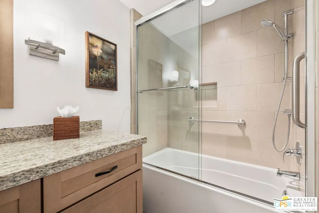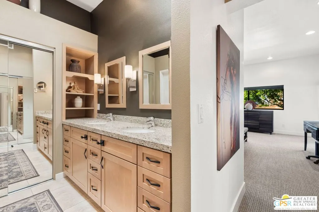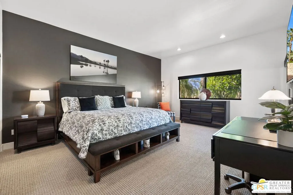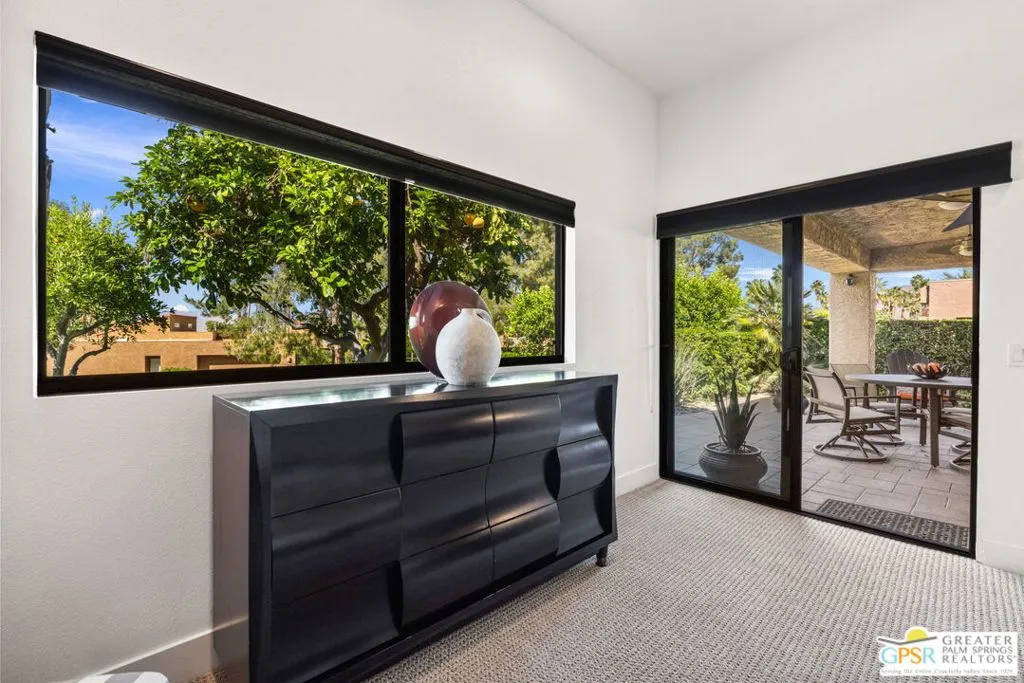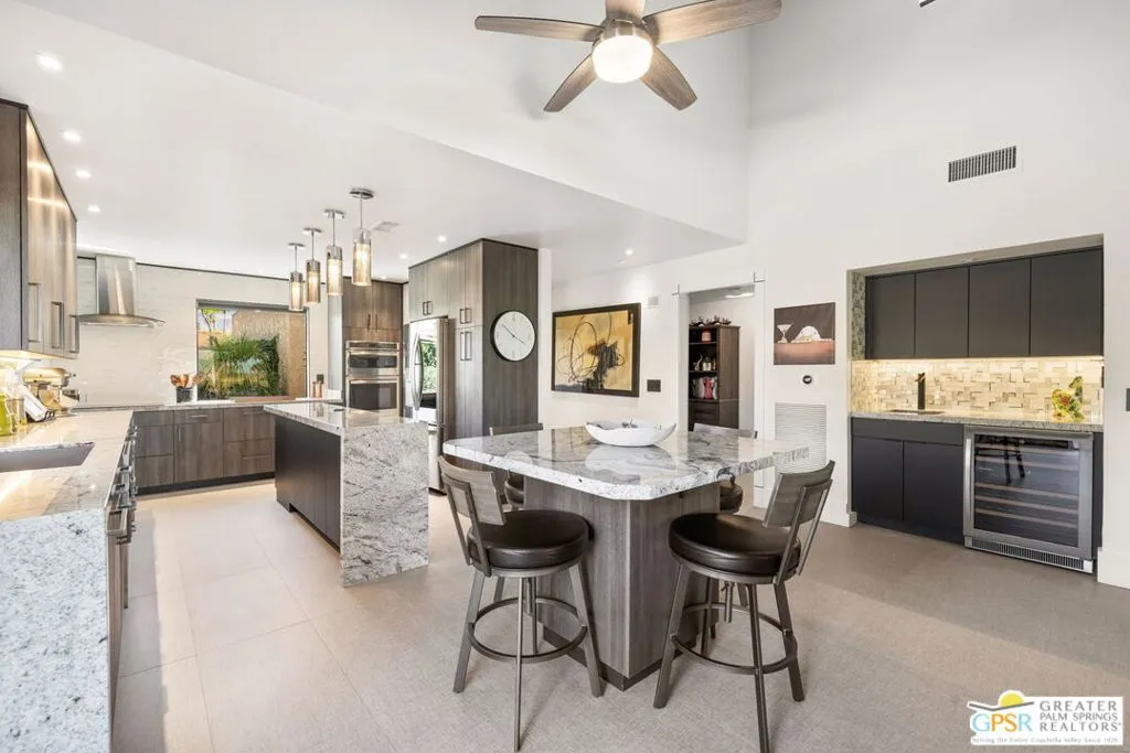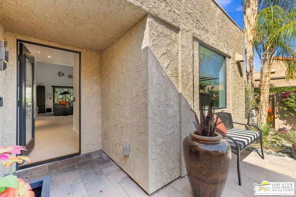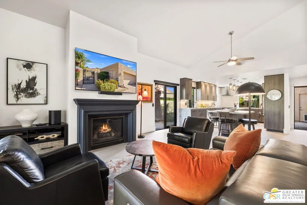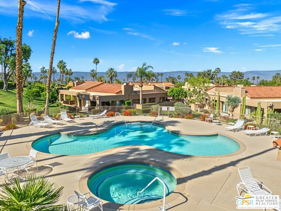 Polished and perfectly kept. A pride of ownership Ironwood villa that truly stands out. Offered TURNKEY FURNISHED with golf cart included, this extensively remodeled end unit on a quiet cul de sac delivers privacy, refined finishes, and a layout that truly lives well. A gated courtyard with mature landscaping and custom wrought iron entry sets a beautiful sense of arrival, opening to a light filled living room with vaulted ceilings and clerestory windows overhead. A sleek contemporary fireplace and a stylish wet bar with wine cooler anchor the space, creating an easy setting for entertaining. The expanded kitchen is a true focal point, finished with custom dark wood cabinetry, slab granite counters, waterfall edge island, glass tile backsplash, and stainless appliances, all connecting naturally to the surrounding outdoor spaces. The primary suite is a quiet retreat with a spa style bath, dual sink granite vanity, and an expansive open walk in shower. The guest suite has been thoughtfully reimagined to include a separate sitting area or office with its own private entrance, offering excellent flexibility. Outdoor living is a standout with multiple shaded conversation areas, a built in stainless BBQ, and a private back patio overlooking greenbelt space with no rear neighbors. Finished two car garage with epoxy floors, extensive built in storage, and dual workbenches. Lovely mountain views from the courtyard. Ideally located near two pools and spas, with optional Ironwood memberships available for golf, tennis, fitness, and dining, rounding out the best of desert club living.