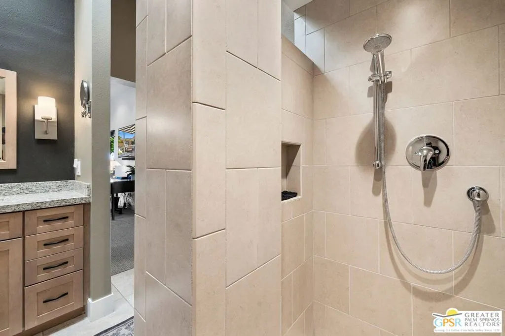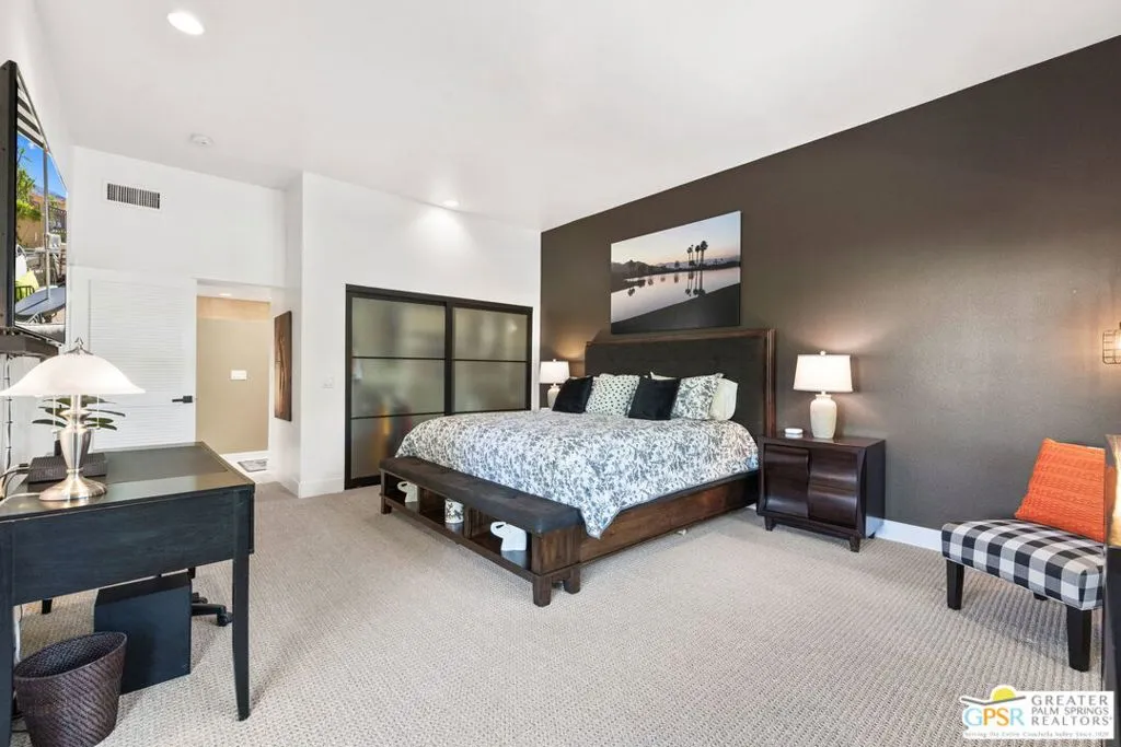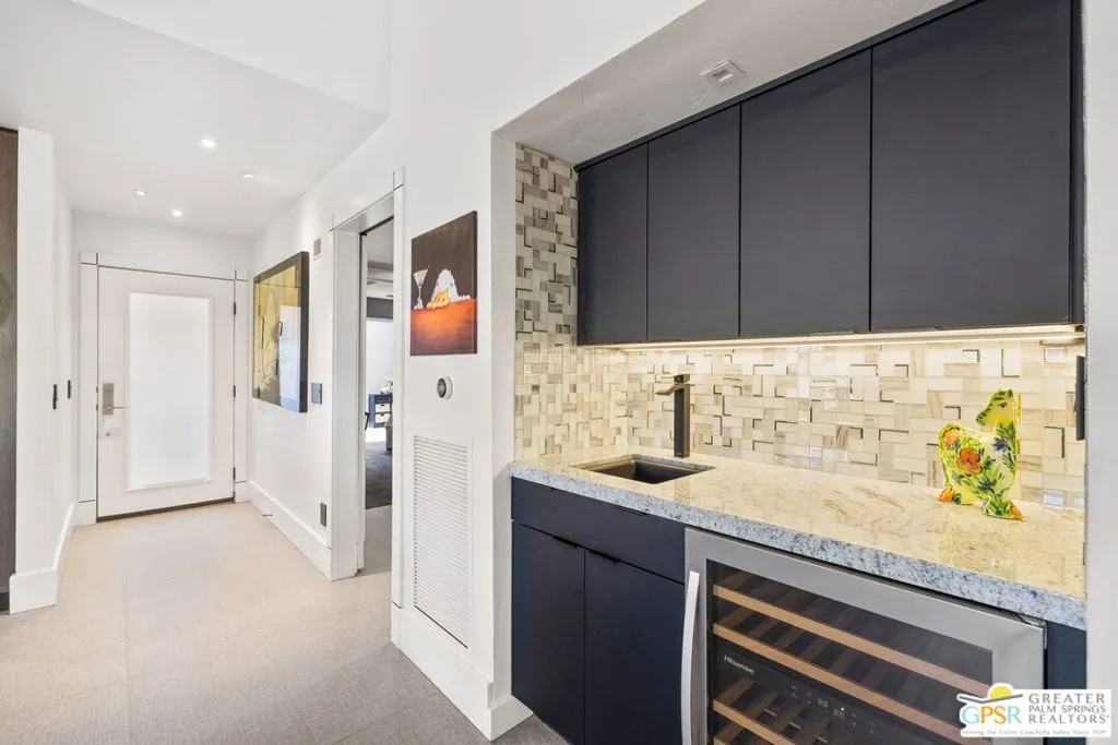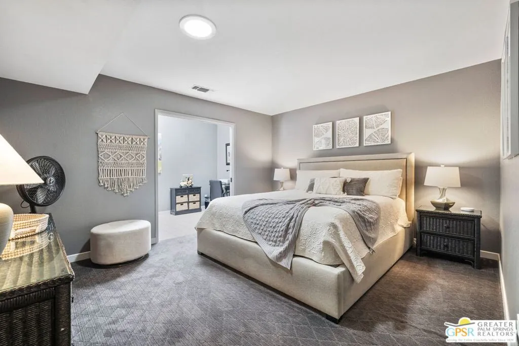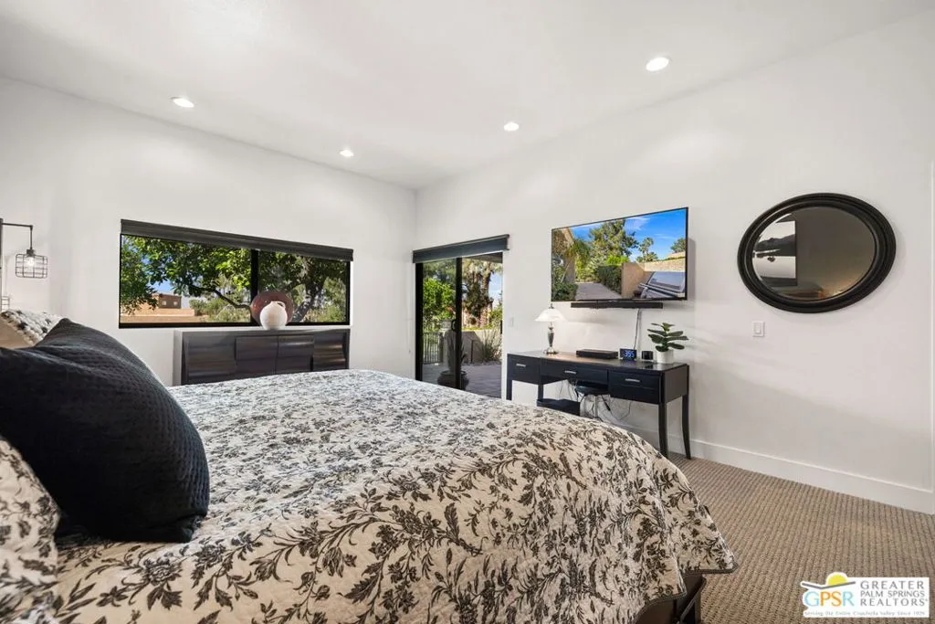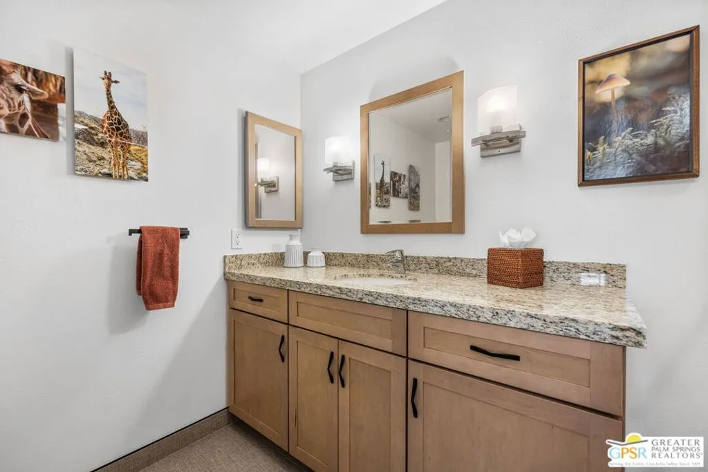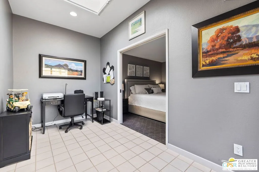 Polished and perfectly kept. A pride of ownership Ironwood villa that truly stands out. Offered TURNKEY FURNISHED with golf cart included, this extensively remodeled end unit on a quiet cul de sac delivers privacy, refined finishes, and a layout that truly lives well. A gated courtyard with mature landscaping and custom wrought iron entry sets a beautiful sense of arrival, opening to a light filled living room with vaulted ceilings and clerestory windows overhead. A sleek contemporary fireplace and a stylish wet bar with wine cooler anchor the space, creating an easy setting for entertaining. The expanded kitchen is a true focal point, finished with custom dark wood cabinetry, slab granite counters, waterfall edge island, glass tile backsplash, and stainless appliances, all connecting naturally to the surrounding outdoor spaces. The primary suite is a quiet retreat with a spa style bath, dual sink granite vanity, and an expansive open walk in shower. The guest suite has been thoughtfully reimagined to include a separate sitting area or office with its own private entrance, offering excellent flexibility. Outdoor living is a standout with multiple shaded conversation areas, a built in stainless BBQ, and a private back patio overlooking greenbelt space with no rear neighbors. Finished two car garage with epoxy floors, extensive built in storage, and dual workbenches. Lovely mountain views from the courtyard. Ideally located near two pools and spas, with optional Ironwood memberships available for golf, tennis, fitness, and dining, rounding out the best of desert club living.