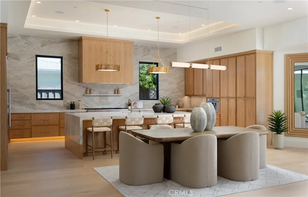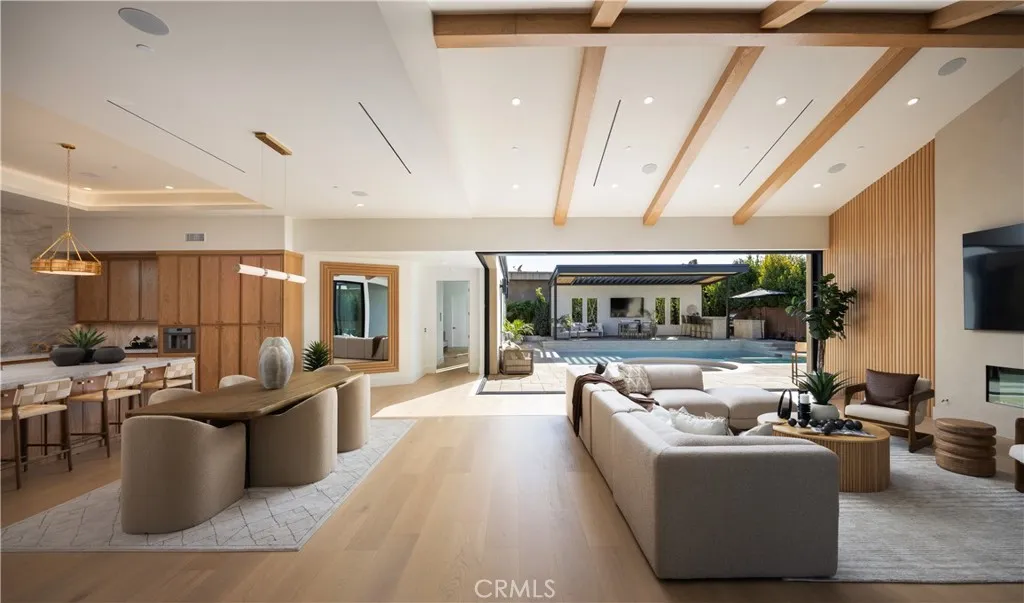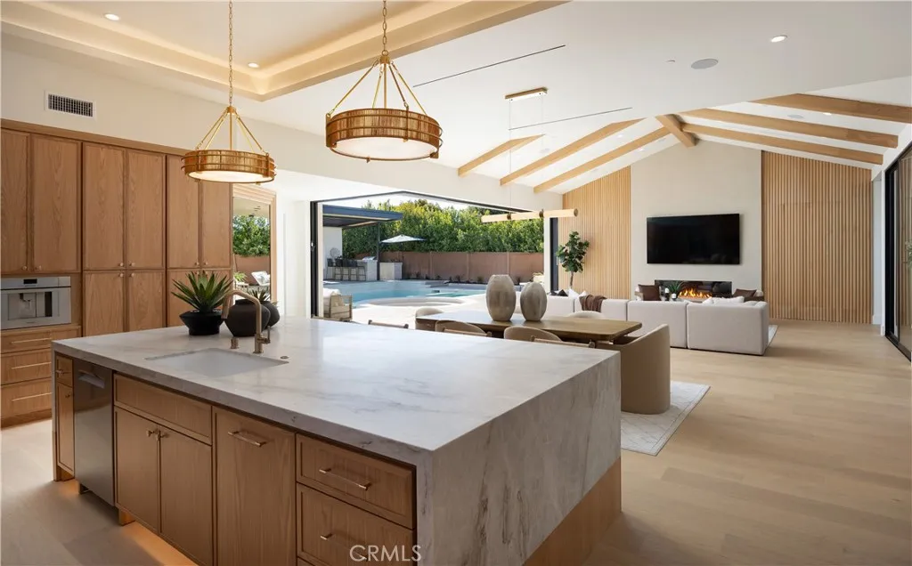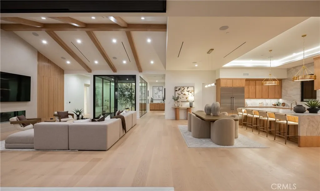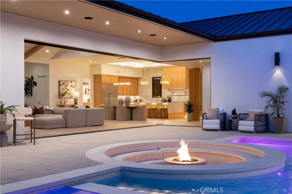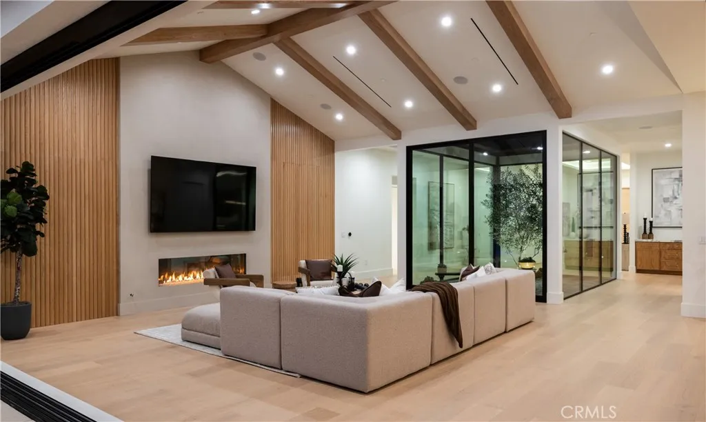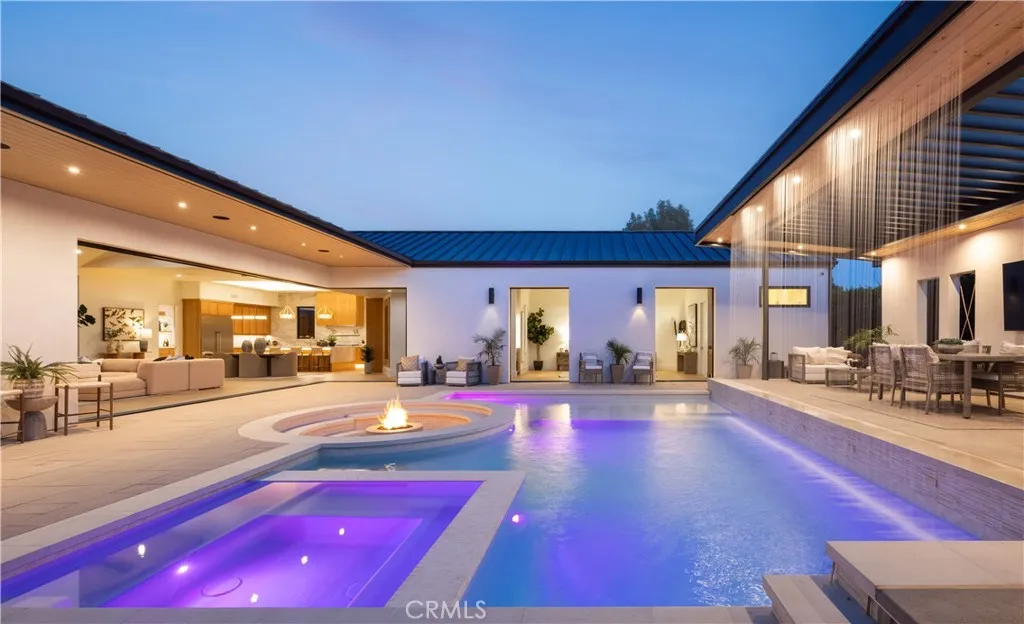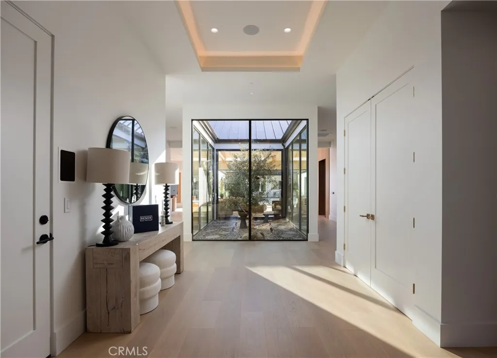 Brand-new in 2026, this architectural single-level estate in Dover Shores offers the rare combination of modern design, expansive scale, and seamless indoor–outdoor living. Privately set on an approximately 13,000 square foot lot, the home spans 5,755 square feet with 5 bedroom suites, 8 bathrooms, and a 3-car garage, blending sophisticated finishes with exceptional comfort. The thoughtfully designed layout is centered around a stunning private courtyard with a mature olive tree, creating a tranquil architectural focal point. Inside, wide-plank white oak floors and soaring 14 foot ceilings enhance the open-concept living spaces. The great room, dining area, and chef’s kitchen open effortlessly to the backyard through massive motorized sliding glass doors, delivering the ultimate indoor–outdoor lifestyle. The designer kitchen features striking quartzite countertops with a waterfall island, custom white oak cabinetry, and Thermador appliances. A fully equipped butler’s kitchen with an additional stove, freezer, and prep sink keeps entertaining effortless while maintaining a pristine main kitchen. Each of the five bedrooms is a private suite with its own ensuite bath and walk-in closet. The primary retreat offers separate his-and-hers bathrooms and walk-in closets, along with a dedicated laundry room for added convenience. Designed for entertaining, a hidden speakeasy-style game room includes a bar island, wine refrigerator, and pass-through window to the backyard. The resort-style backyard is equally impressive with a pool, spa, sunken firepit lounge, built-in BBQ, and covered patio with a dramatic waterfall feature cascading into the pool, creating a serene outdoor retreat. A Savant smart home system seamlessly controls lighting, music, security cameras, and motorized doors throughout the home. Offering a rare single-story layout, bespoke finishes, and resort-caliber amenities, 1453 Galaxy Drive represents an exceptional opportunity to own a newly built luxury residence in one of Newport Beach’s most desirable neighborhoods.