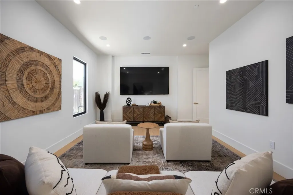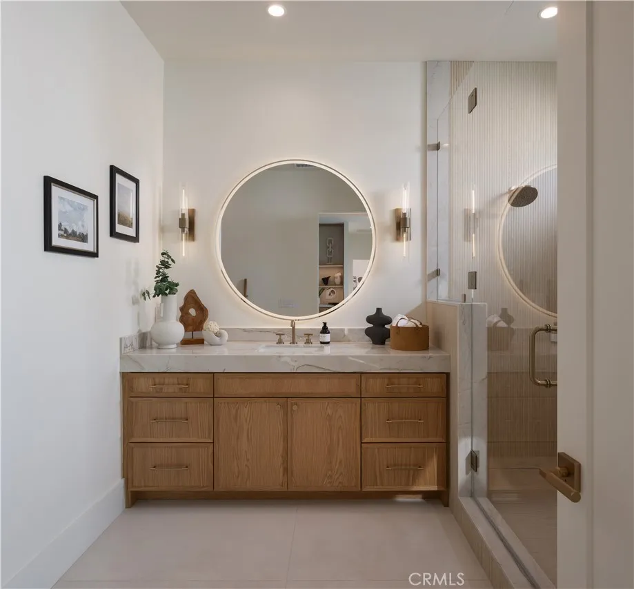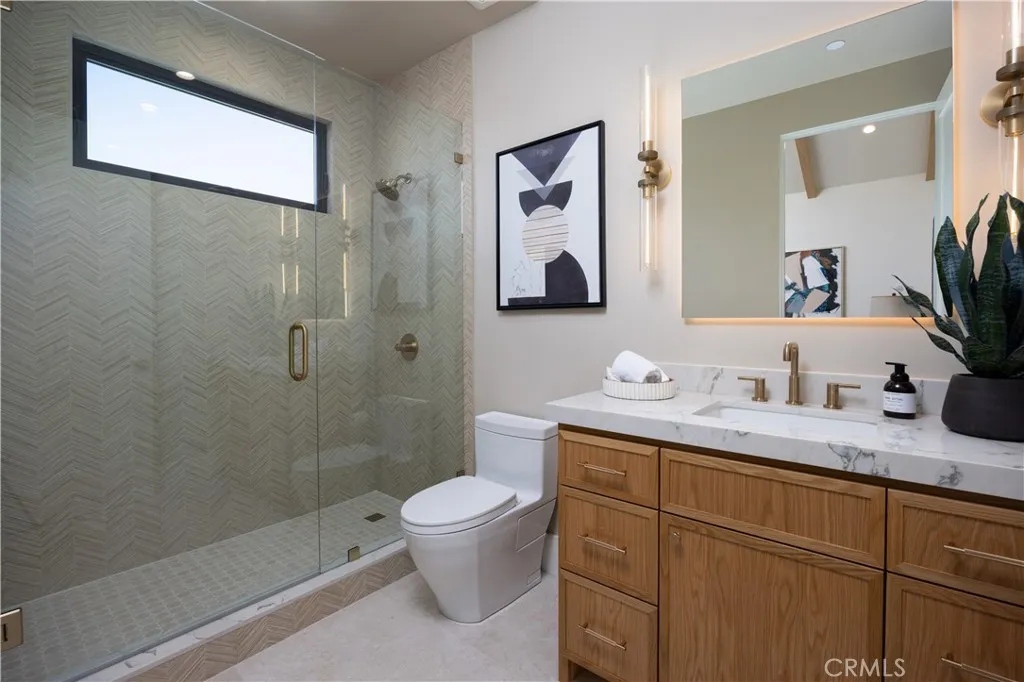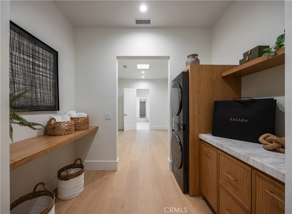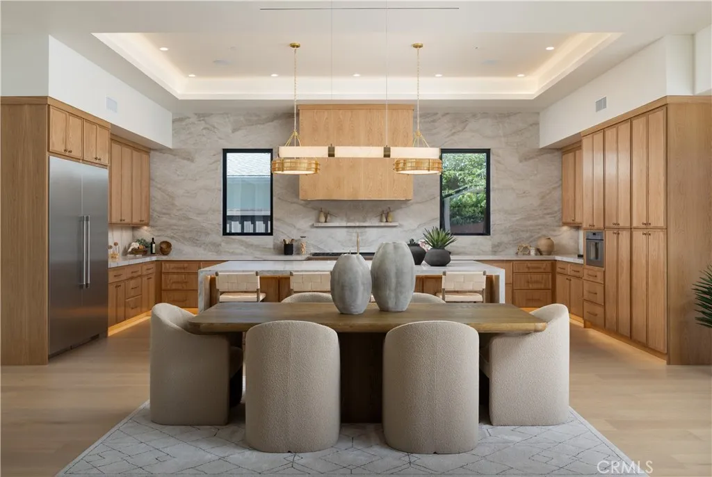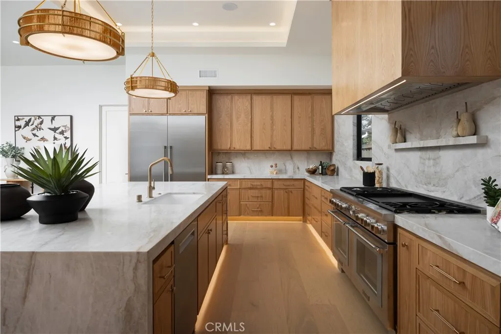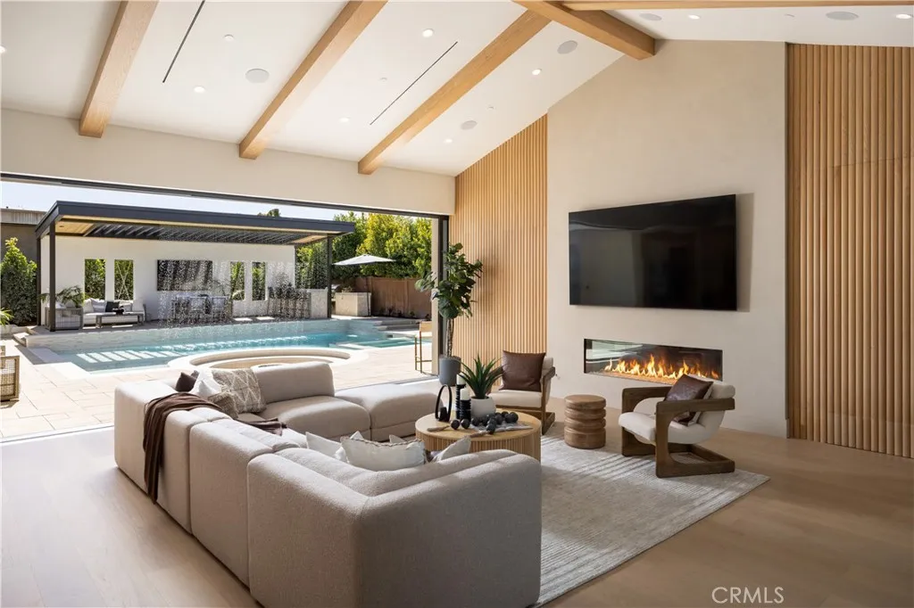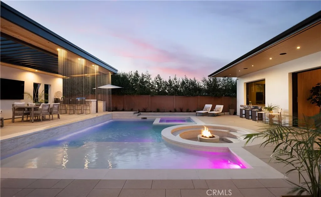 Brand-new in 2026, this architectural single-level estate in Dover Shores offers the rare combination of modern design, expansive scale, and seamless indoor–outdoor living. Privately set on an approximately 13,000 square foot lot, the home spans 5,755 square feet with 5 bedroom suites, 8 bathrooms, and a 3-car garage, blending sophisticated finishes with exceptional comfort. The thoughtfully designed layout is centered around a stunning private courtyard with a mature olive tree, creating a tranquil architectural focal point. Inside, wide-plank white oak floors and soaring 14 foot ceilings enhance the open-concept living spaces. The great room, dining area, and chef’s kitchen open effortlessly to the backyard through massive motorized sliding glass doors, delivering the ultimate indoor–outdoor lifestyle. The designer kitchen features striking quartzite countertops with a waterfall island, custom white oak cabinetry, and Thermador appliances. A fully equipped butler’s kitchen with an additional stove, freezer, and prep sink keeps entertaining effortless while maintaining a pristine main kitchen. Each of the five bedrooms is a private suite with its own ensuite bath and walk-in closet. The primary retreat offers separate his-and-hers bathrooms and walk-in closets, along with a dedicated laundry room for added convenience. Designed for entertaining, a hidden speakeasy-style game room includes a bar island, wine refrigerator, and pass-through window to the backyard. The resort-style backyard is equally impressive with a pool, spa, sunken firepit lounge, built-in BBQ, and covered patio with a dramatic waterfall feature cascading into the pool, creating a serene outdoor retreat. A Savant smart home system seamlessly controls lighting, music, security cameras, and motorized doors throughout the home. Offering a rare single-story layout, bespoke finishes, and resort-caliber amenities, 1453 Galaxy Drive represents an exceptional opportunity to own a newly built luxury residence in one of Newport Beach’s most desirable neighborhoods.