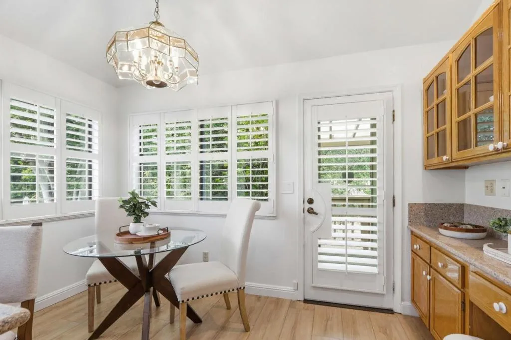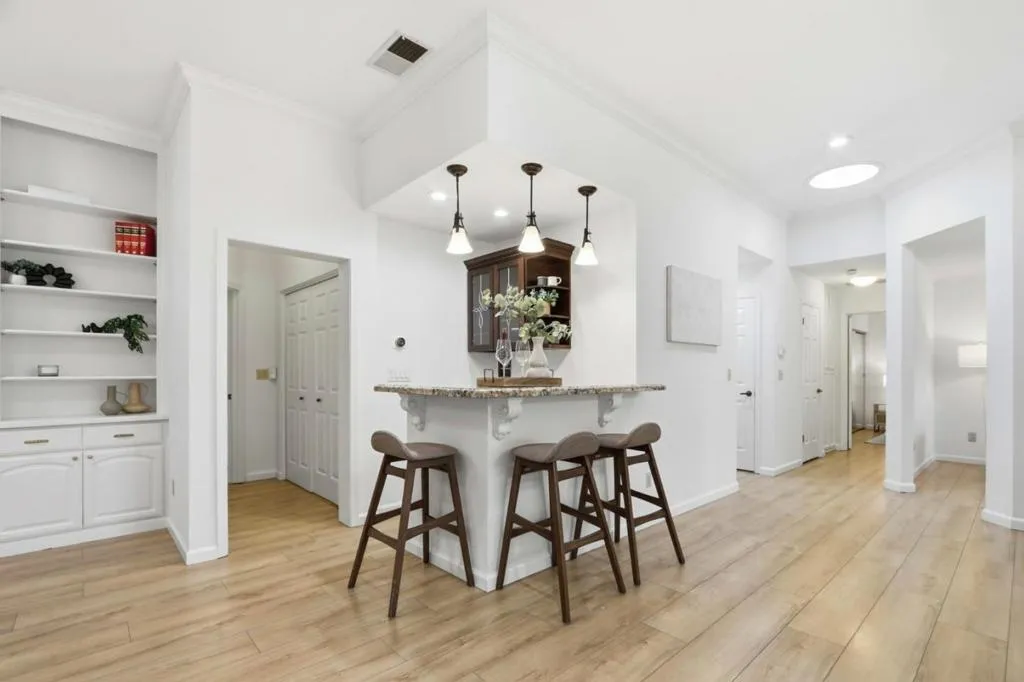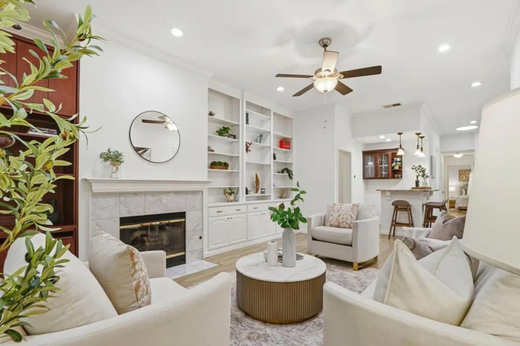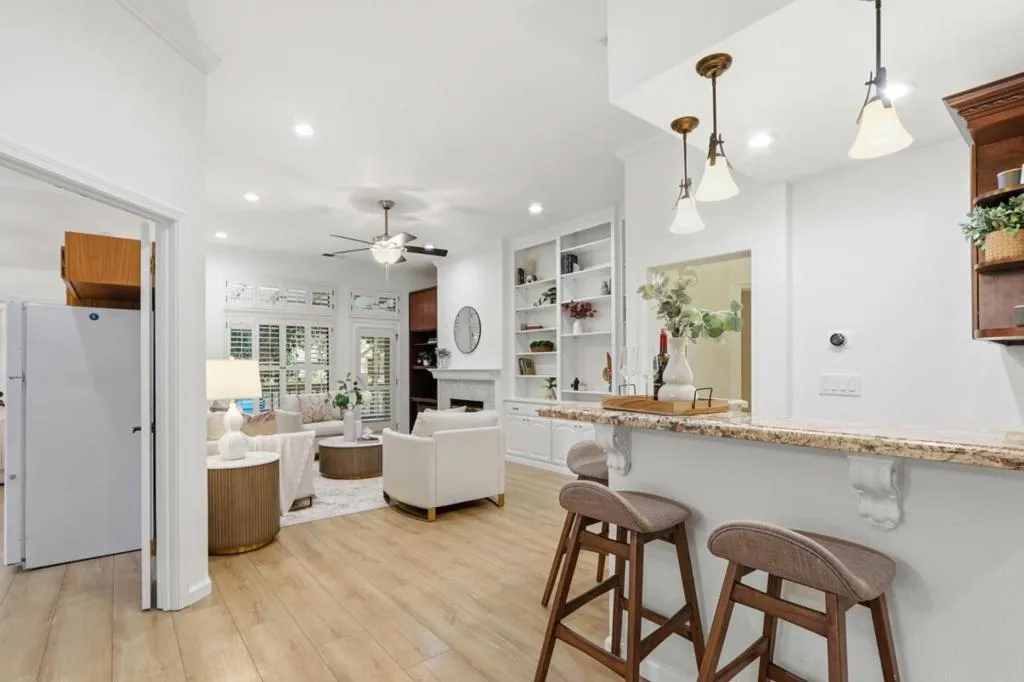 Located in The Villages, a premier gated 55+ community offering resort-style living with golf and exceptional amenities. Flexible layout with 2BR plus an office (easily a 3rd bedroom) and 2.5BA. Recently remodeled and thoughtfully updated. The interior showcases engineered flooring, fresh designer paint, soaring ceilings. The inviting family room features a cozy fireplace with custom-built bookshelves. The updated kitchen is appointed with SS appliances, while a separate formal dining area provides an ideal setting for entertaining. A wet bar with upgraded cabinetry adds an additional space for hosting. The primary suite offers private balcony access, a spacious walk-in closet, and a beautifully remodeled spa-inspired bath with heated floors, oversized walk-in shower. Additional highlights: a remote-controlled European rolling shutter on the west-facing wall. Shutters throughout, ceiling fans in every room, and central heating and A/C ensure year-round comfort. End unit with only one shared wall, the home delivers exceptional privacy and a true single-family feel. Attached 2-car garage, generous guest parking add everyday convenience. HOA includes golf membership, water, sewer, cable TV, pools, tennis, pickleball, fitness center, dining, over 60 clubs and social activities.