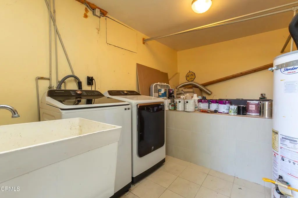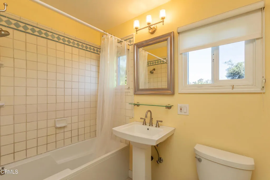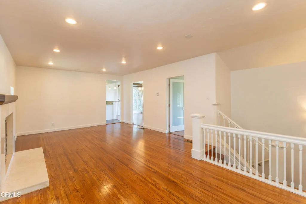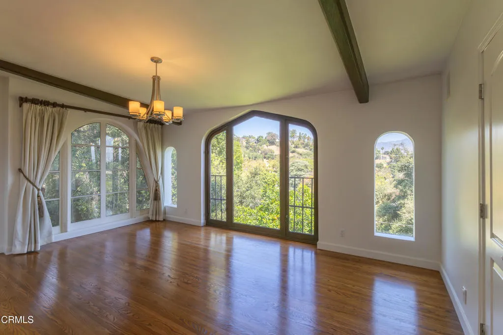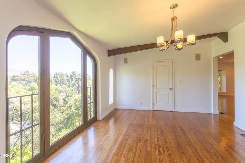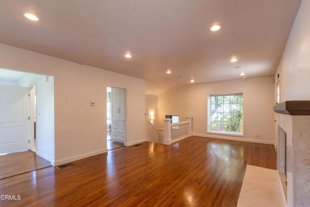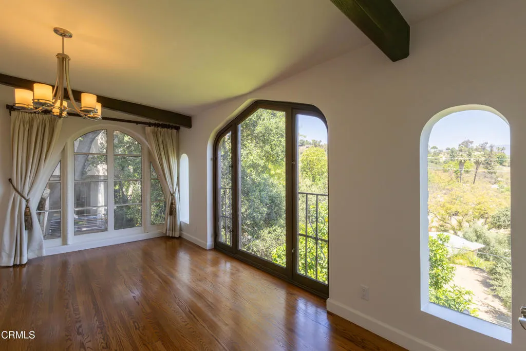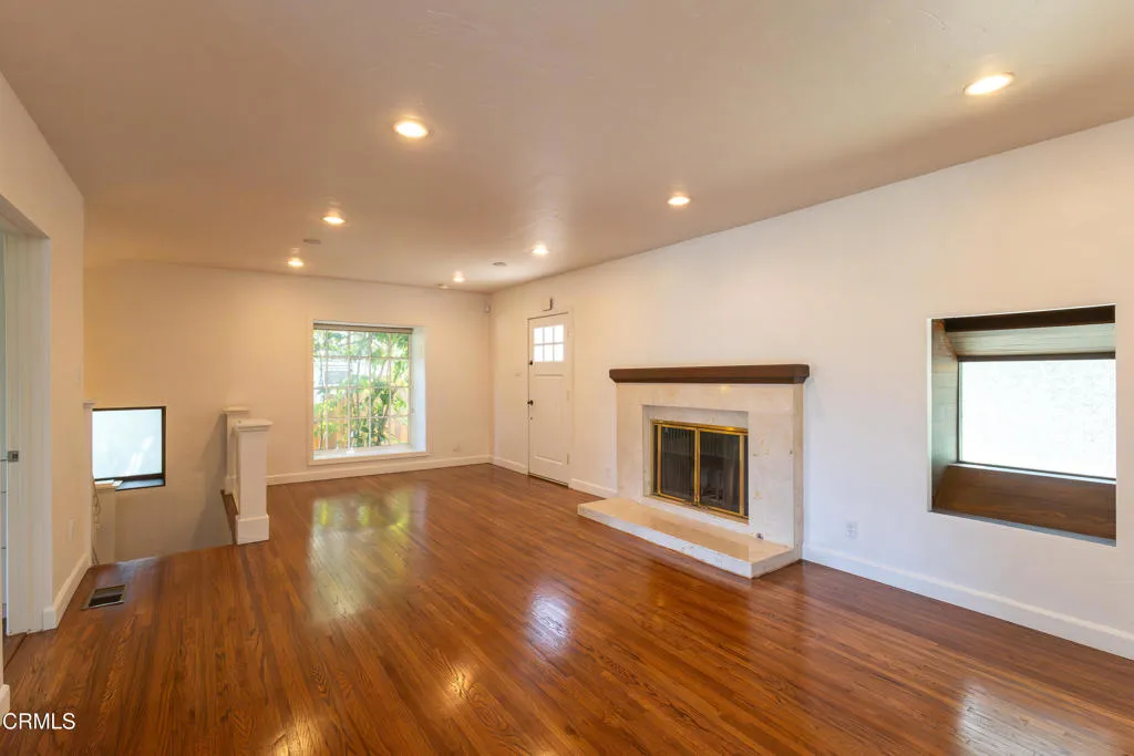 Perched in the hills of South Pasadena, this charming Spanish Colonial-style home offers character, warmth, and scenic views in a peaceful setting. Enter through the front door to beautifully refinished original hardwood floors, a welcoming bay window, and a stone slab fireplace with a classic wood mantel. Recessed lighting and a stylish frosted inset window bring in natural light while maintaining privacy. The living room flows seamlessly into a flexible dining or family room space, highlighted by wood-beamed ceilings and an array of character-rich windows, including arched accents and a picture window framing north-facing views. A casual eat-at bar connects the space to the kitchen, which features stone countertops, white cabinetry, a gas range, microwave, and stainless steel refrigerator. From the kitchen, you'll find access to the street as well as the attached one-car garage, complete with tile flooring, an automatic door, and a loft area for extra storage. Also on the main level is a well-appointed bedroom with hardwood flooring, recessed lighting, dual-pane windows, a picture window with views, and built-in cabinetry with dresser storage. The adjacent bathroom features stone tile flooring and walls, a glass-enclosed shower, and a floating vanity, with access from both the bedroom and main living area. Downstairs, the home offers a reverse floor plan with two additional bedrooms and a full bathroom. Wood-look flooring runs throughout this level. One bedroom features dual closets, while the second includes a walk-in closet and French doors that open to a private patio with terracotta pavers, wood fencing, and drought-tolerant landscaping, as well as a separate laundry room with a side-by-side washer and dryer, a utility sink, and additional storage. In between the two bedrooms, the bathroom includes a deep soaking tub with a shower, a pedestal sink, and a medicine cabinet. Additional features include in-ceiling speaker wiring in the living areas and a layout that balances charm with functionality. Located within an award-winning school district and just moments from South Pasadena's dining, shopping, and local amenities, this hillside lease offers a unique blend of architectural character, outdoor space, and everyday convenience.