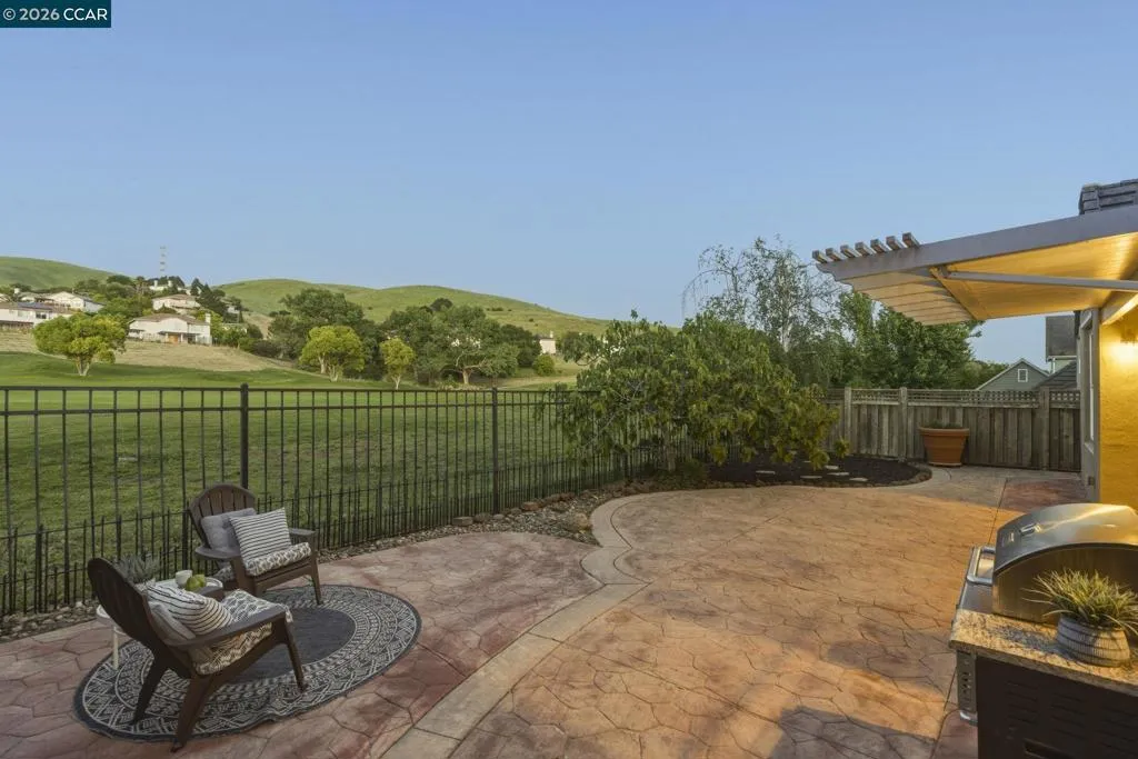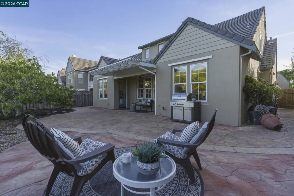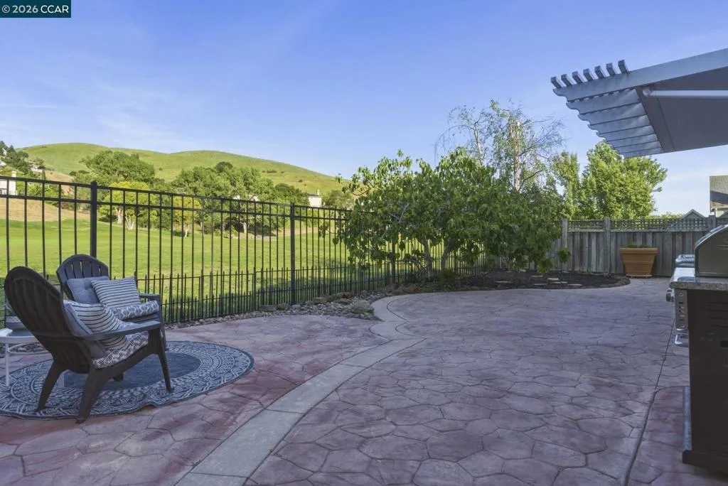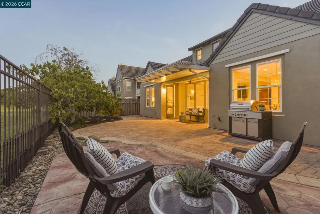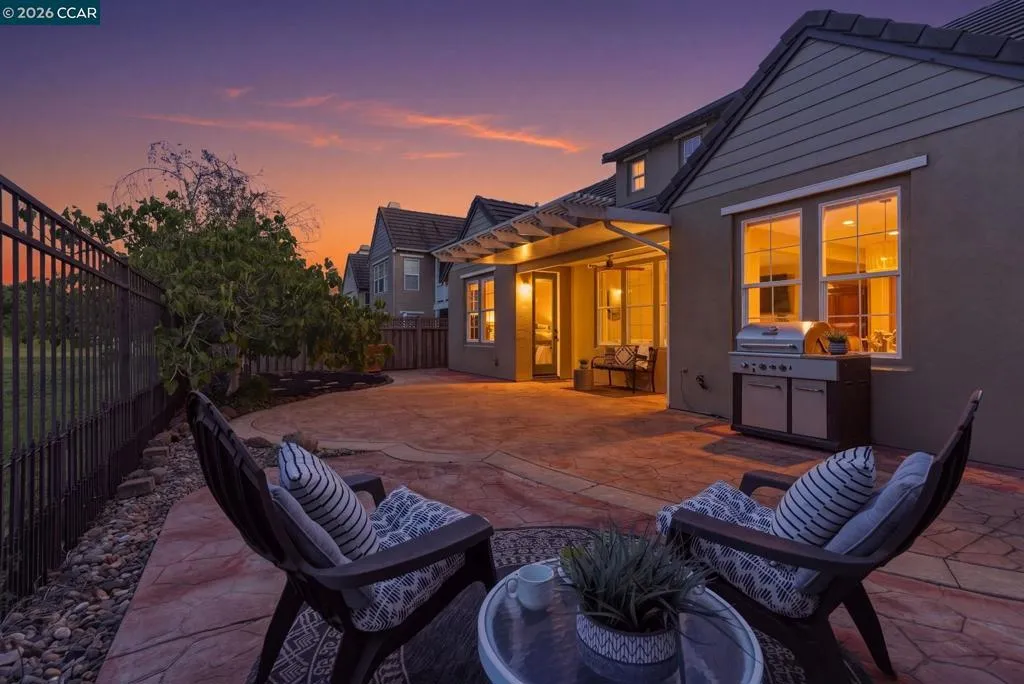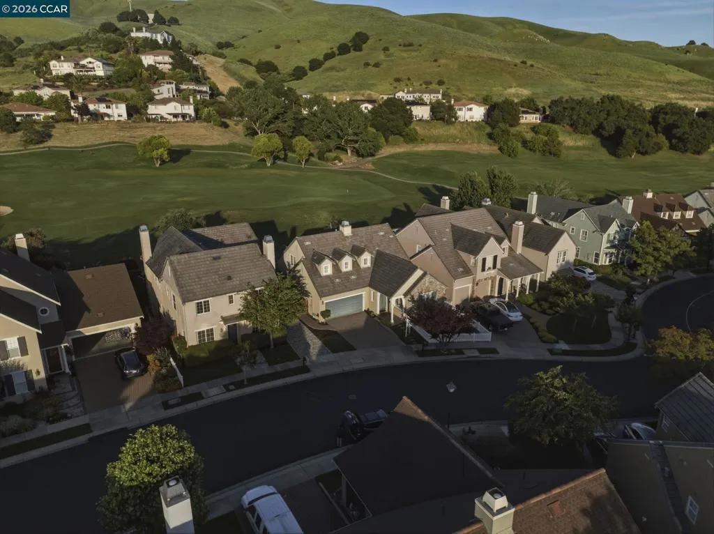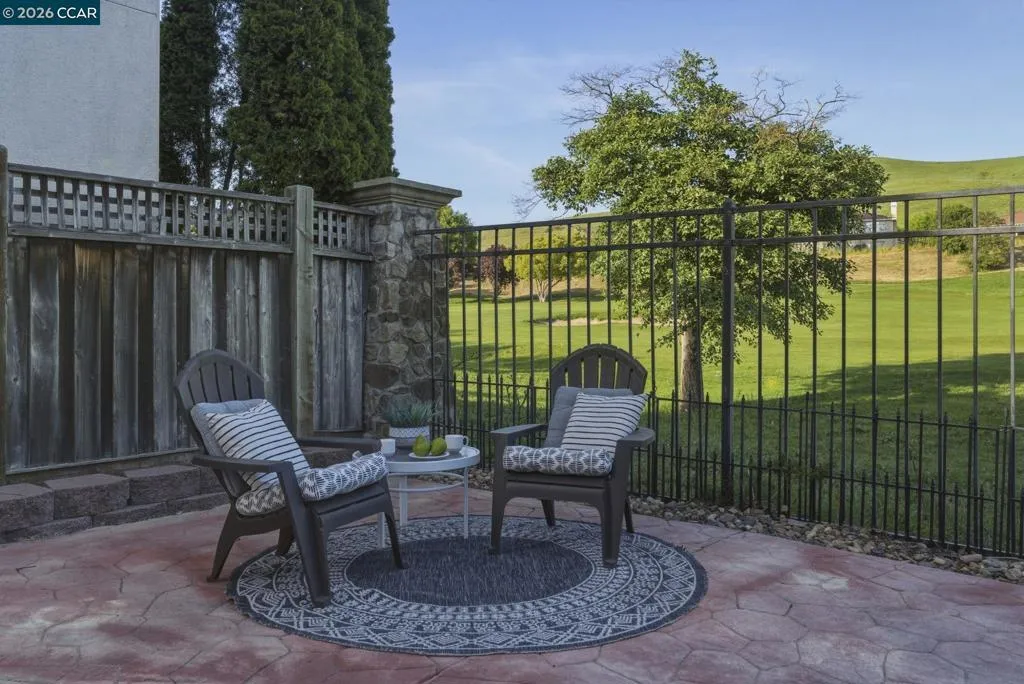 Located in the highly sought-after gated community of The Village at Hiddenbrooke, this storybook-inspired home offers a rare blend of charm, functionality, and golf course living. This unique enclave, inspired by the iconic paintings of Thomas Kinkade, is known for its picturesque, idyllic feel. Nestled along the American Canyon border and backing directly to the 10th hole of the Arnold Palmer designed Hiddenbrooke Golf Course, the setting feels peaceful, private, and truly special. Built in 2003, this spacious 4 bedroom, 4 bathroom home offers approximately 2,493 square feet with a highly desirable layout featuring en suite bathrooms in every bedroom. The main level includes a primary suite with a large walk-in closet and direct access to the backyard, along with an additional guest bedroom and full bathroom, ideal for multi-generational living or guests. The kitchen is designed for both everyday living and entertaining, featuring granite countertops, a large island with bar seating, a built-in 5 burner range, and an eat-in dining area. The adjacent living room is warm and inviting with a fireplace and expansive views of the golf course. Travertine tile flooring runs throughout much of the downstairs, complemented by wood flooring in the living room and primary suite. A downstairs laundry room with sink adds convenience. Upstairs offers a second primary suite with a spacious en suite bathroom and walk-in closet, along with an additional bedroom, also featuring its own en suite bathroom. The upper level is fully carpeted, creating a comfortable and private retreat. The backyard is designed to enjoy the setting, with stamped concrete, a charming pergola, and a fully fenced patio that overlooks the fairway. Whether relaxing or entertaining, this outdoor space captures the beauty of the surrounding golf course and hills. With its flexible layout, private setting, and distinctive architectural character, this property offers a rare opportunity in one of Hiddenbrooke’s most visually unique and charming communities.