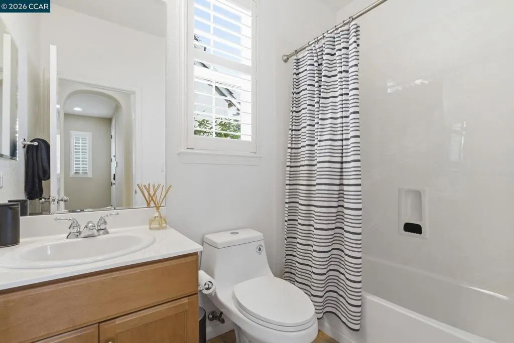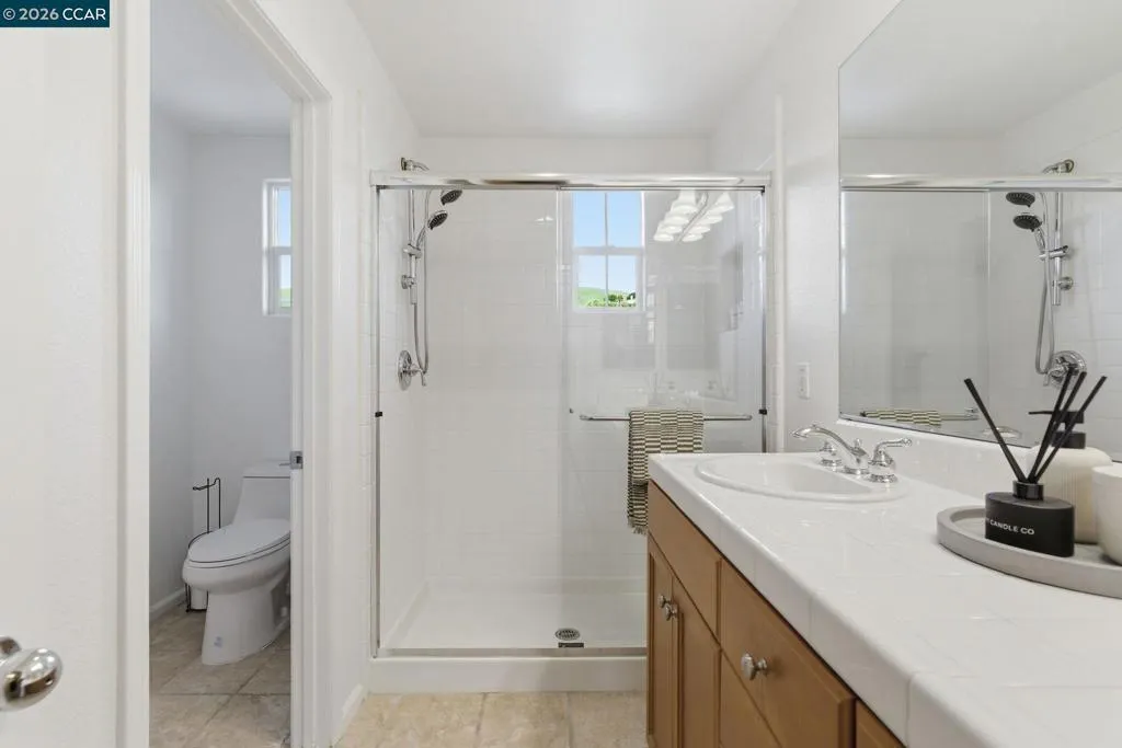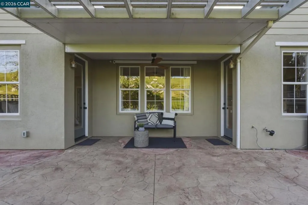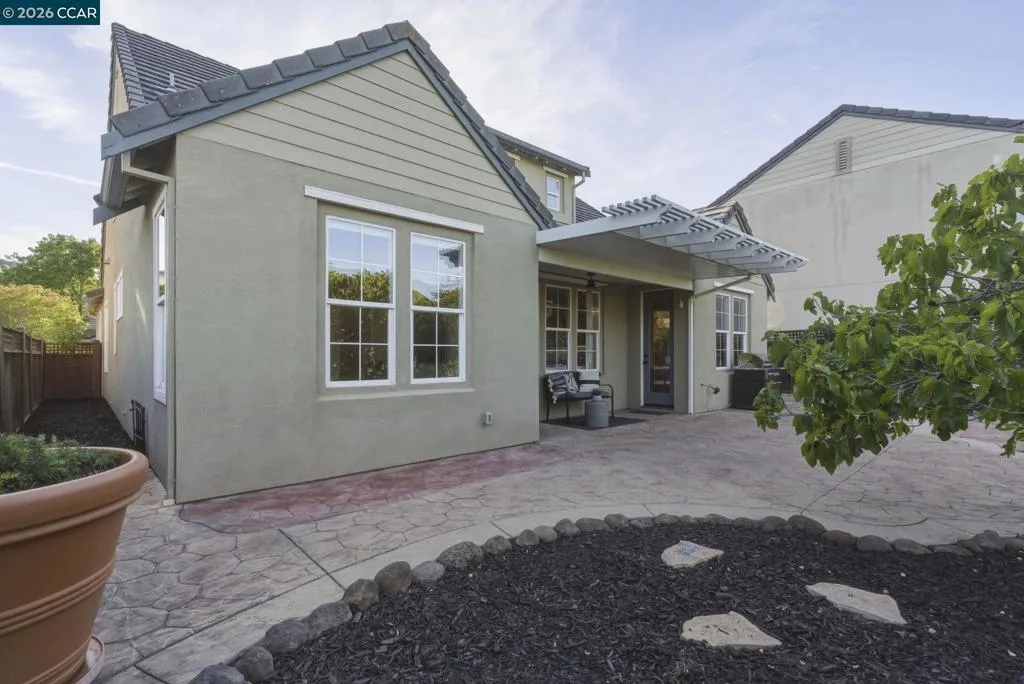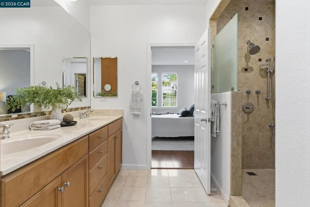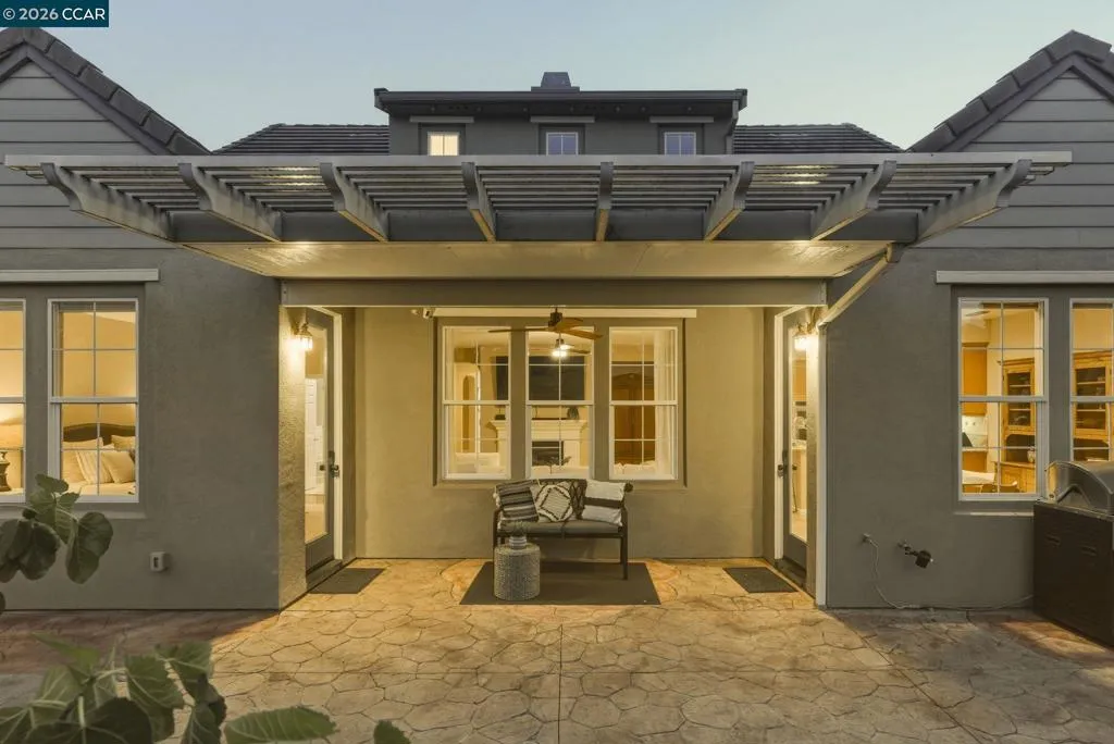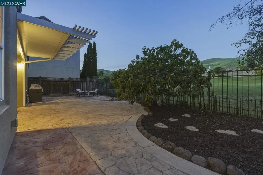 Located in the highly sought-after gated community of The Village at Hiddenbrooke, this storybook-inspired home offers a rare blend of charm, functionality, and golf course living. This unique enclave, inspired by the iconic paintings of Thomas Kinkade, is known for its picturesque, idyllic feel. Nestled along the American Canyon border and backing directly to the 10th hole of the Arnold Palmer designed Hiddenbrooke Golf Course, the setting feels peaceful, private, and truly special. Built in 2003, this spacious 4 bedroom, 4 bathroom home offers approximately 2,493 square feet with a highly desirable layout featuring en suite bathrooms in every bedroom. The main level includes a primary suite with a large walk-in closet and direct access to the backyard, along with an additional guest bedroom and full bathroom, ideal for multi-generational living or guests. The kitchen is designed for both everyday living and entertaining, featuring granite countertops, a large island with bar seating, a built-in 5 burner range, and an eat-in dining area. The adjacent living room is warm and inviting with a fireplace and expansive views of the golf course. Travertine tile flooring runs throughout much of the downstairs, complemented by wood flooring in the living room and primary suite. A downstairs laundry room with sink adds convenience. Upstairs offers a second primary suite with a spacious en suite bathroom and walk-in closet, along with an additional bedroom, also featuring its own en suite bathroom. The upper level is fully carpeted, creating a comfortable and private retreat. The backyard is designed to enjoy the setting, with stamped concrete, a charming pergola, and a fully fenced patio that overlooks the fairway. Whether relaxing or entertaining, this outdoor space captures the beauty of the surrounding golf course and hills. With its flexible layout, private setting, and distinctive architectural character, this property offers a rare opportunity in one of Hiddenbrooke’s most visually unique and charming communities.