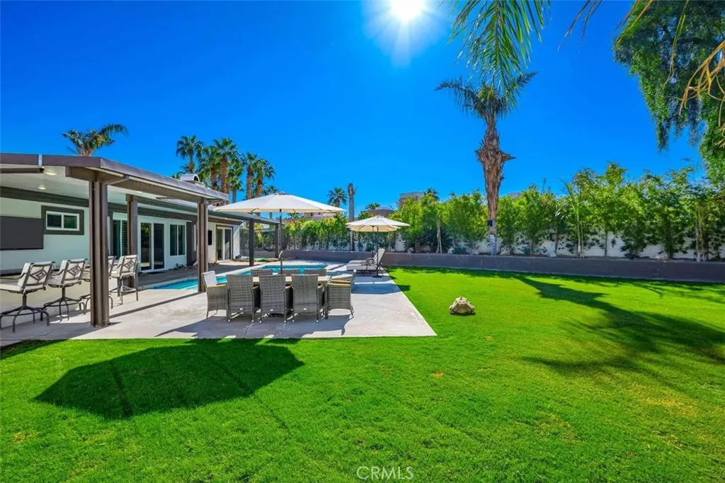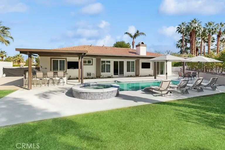 Located on a quiet cul-de-sac in the desirable Colony Cove community, this fully renovated and fully furnished home sits on a large 0.31-acre lot and offers easy, comfortable desert living. The home has been updated throughout with new flooring, fresh paint, upgraded windows, LED lighting, and a custom entertainment center with surround sound. The kitchen features new cabinets, countertops, and ZLINE appliances, and opens nicely to the main living space. The backyard is set up perfectly for entertaining with a Pebble Tec pool and spa, covered patio, and outdoor BBQ area with two 65” TVs—great for hosting or just relaxing outside. Additional upgrades include remodeled bathrooms, epoxy garage floors, and new garage doors. Offered fully furnished and move-in ready, all in a great Indian Wells location close to golf, dining, and resorts.