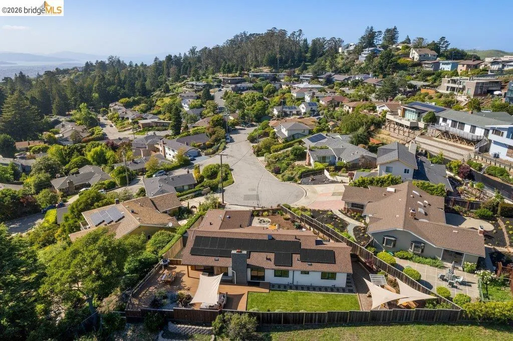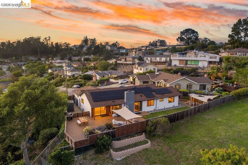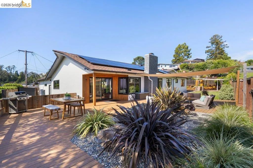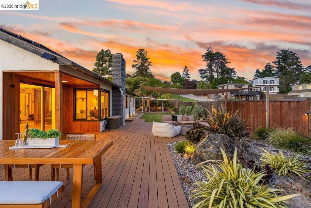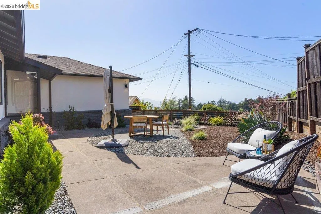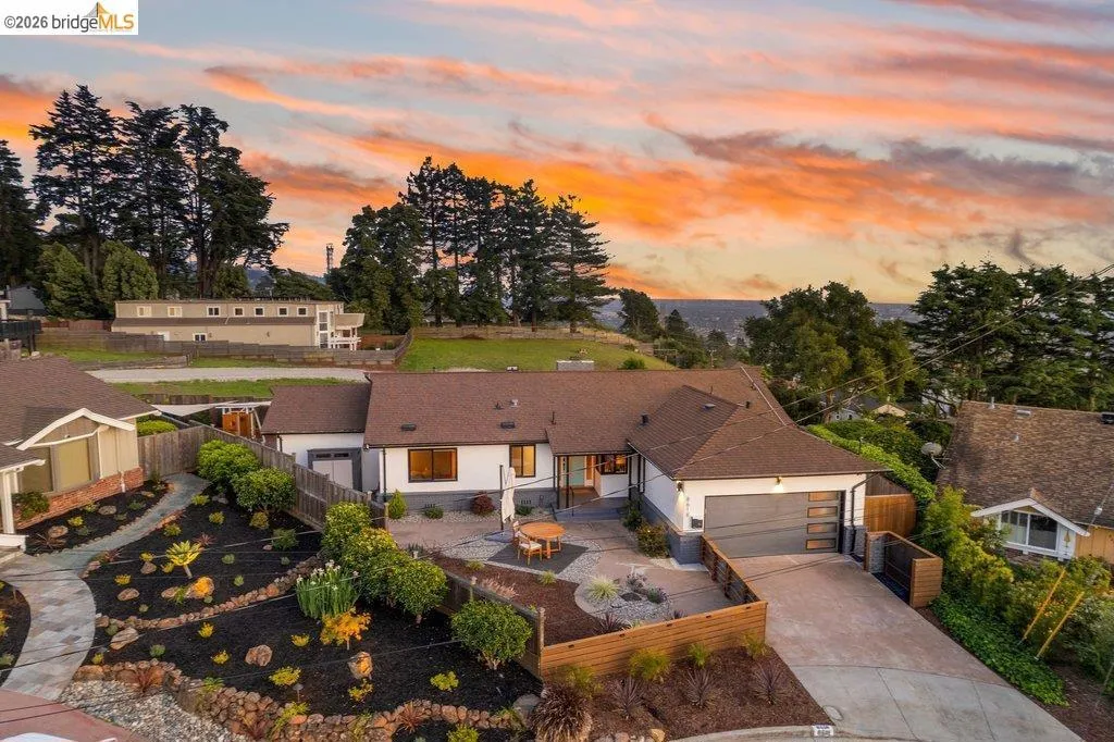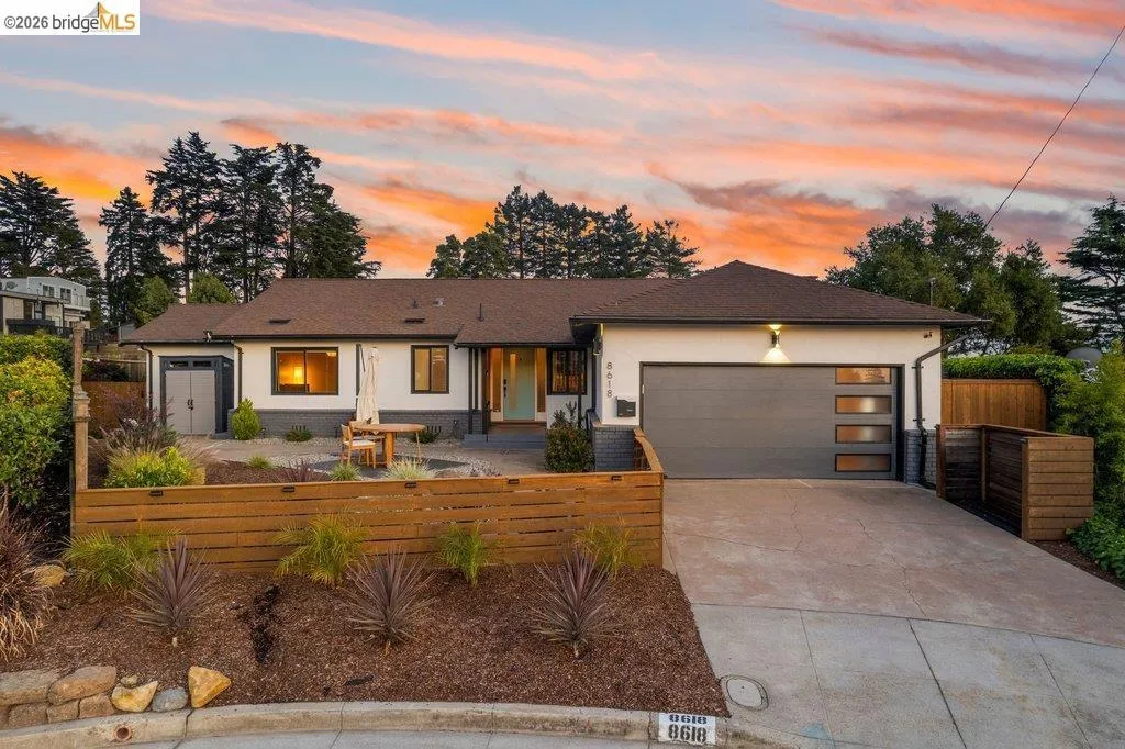 Welcome to 8618 Edgehill Court in El Cerrito, a beautifully remodeled level-entry home offering 1,648 square feet of bright, airy living space with three bedrooms and two bathrooms. Showcasing classic Mid-Century architecture and a flexible floor plan, this home features hardwood floors, two dining areas, and a stylishly updated kitchen and bathrooms designed for modern living. Enjoy sweeping four-bridge bay views that include the iconic Golden Gate Bridge and the skyline of San Francisco. The spacious backyards made for entertaining, with multiple areas perfect for family gatherings and celebrations- this home truly invites you to throw a party. Complete with a finished two-car garage and conveniently located near bus routes, Arlington Park, and scenic hiking trails, and zoned for Madera Elementary School. Twilight Open Friday 5/1 5-7pm and Saturday and Sunday open houses 5/2, 5/3, 5/9 ad 5/10 2-4:30pm. Views: Downtown