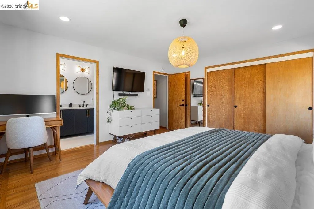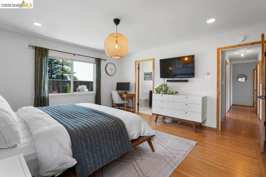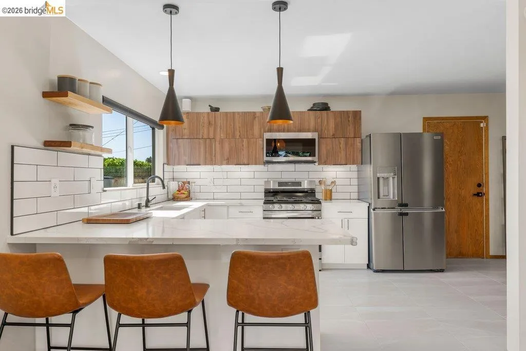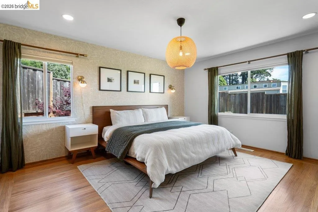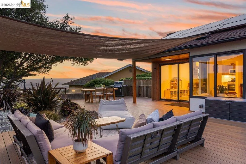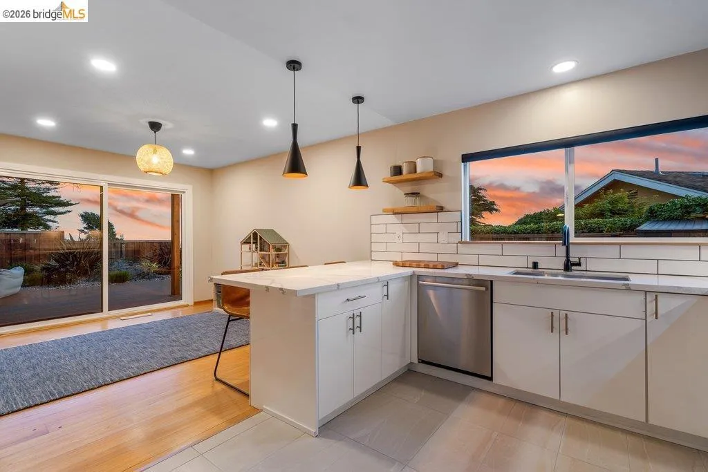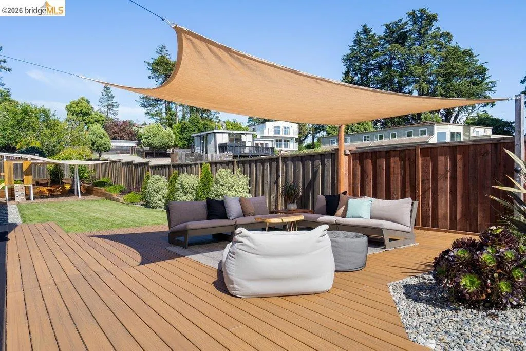 Welcome to 8618 Edgehill Court in El Cerrito, a beautifully remodeled level-entry home offering 1,648 square feet of bright, airy living space with three bedrooms and two bathrooms. Showcasing classic Mid-Century architecture and a flexible floor plan, this home features hardwood floors, two dining areas, and a stylishly updated kitchen and bathrooms designed for modern living. Enjoy sweeping four-bridge bay views that include the iconic Golden Gate Bridge and the skyline of San Francisco. The spacious backyards made for entertaining, with multiple areas perfect for family gatherings and celebrations- this home truly invites you to throw a party. Complete with a finished two-car garage and conveniently located near bus routes, Arlington Park, and scenic hiking trails, and zoned for Madera Elementary School. Twilight Open Friday 5/1 5-7pm and Saturday and Sunday open houses 5/2, 5/3, 5/9 ad 5/10 2-4:30pm. Views: Downtown