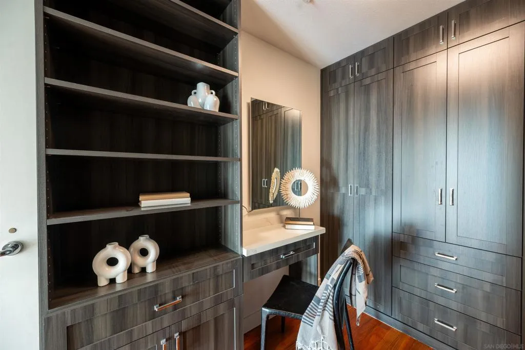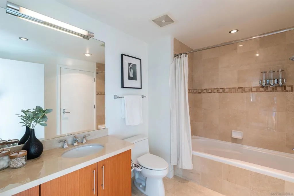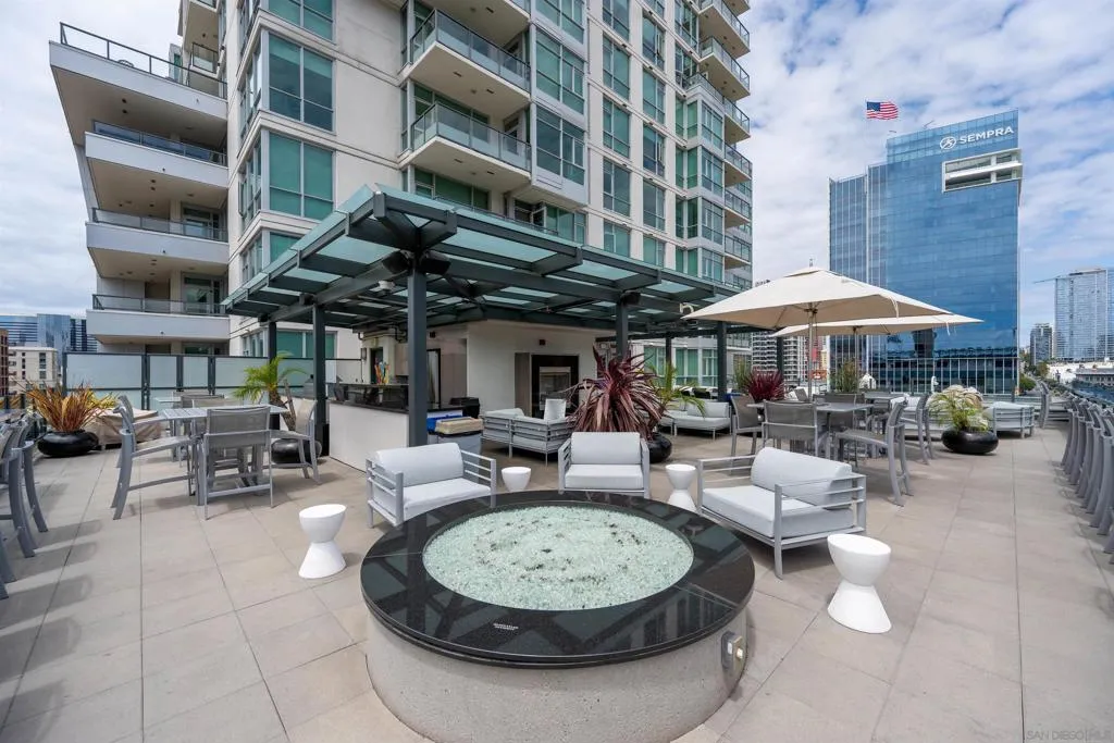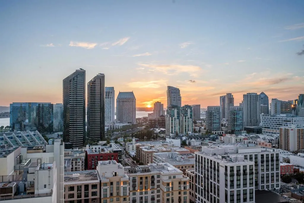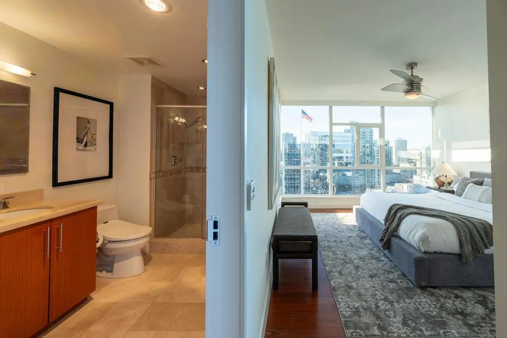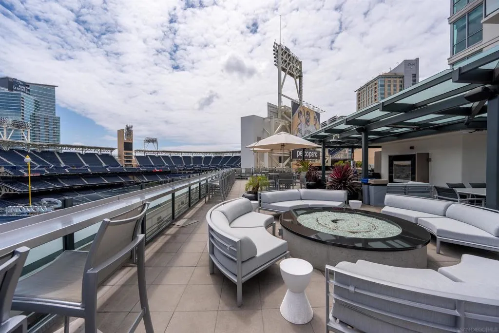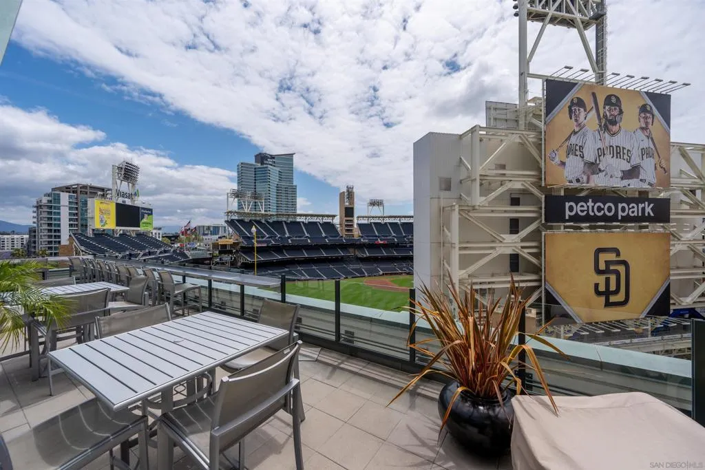 Penthouse living at its finest, where ships drift across the bay, and sweeping water views create a constantly changing backdrop. Enjoy panoramic views of the downtown skyline, Bay and Ocean from this highly sought-after northwest corner residence, perfectly positioned to capture both vibrant city energy and serene coastal beauty. The ideal open floor plan has been thoughtfully updated with refined, high-end finishes throughout, offering a seamless blend of style and functionality. The chef’s kitchen and spa-inspired bathrooms bring a sense of everyday luxury, while floor-to-ceiling windows fill the home with natural light and frame stunning sunset views. Rich wood flooring runs throughout, and custom lighting allows you to tailor the ambiance from day to night. The spacious primary suite is a peaceful retreat, filled with natural light and complemented by a beautifully designed custom walk-in closet. A rare third bonus room adds versatility—perfect for a home office, nursery or creative space. Additional conveniences include two side-by-side parking spaces near the elevator and a private storage room within the garage. The Legend offers an unmatched lifestyle as the only residential building located within an MLB ballpark. Residents enjoy exclusive access to the expansive 7th-floor rooftop deck and recreation level, complete with multiple entertaining areas, outdoor kitchens, fire pits, and lounge spaces overlooking Petco Park. The resort-style pool and fully equipped fitness center enhance everyday living, along with 24-hour security and concierge services.