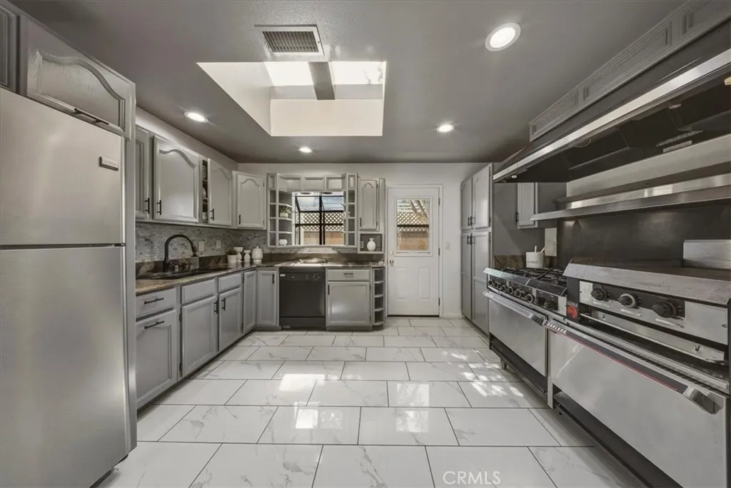 6352 Apache Road is a custom-built property in Westminster centered around one thing most homes don’t have...serious, usable garage space. At the front of the property is an approximately 850 square foot RV/boat garage with 12-foot clearance, built to handle oversized vehicles, equipment, or a full workspace. In addition, the rear features a detached 3-car garage/workshop with direct access. The property is further secured by a large wrought iron gate, adding an extra layer of privacy and protection for vehicles, tools, and equipment and the large driveway. The home itself offers almost 3,300 square feet with a 2.5-story split-level design, including 5 bedrooms, 3 full bathrooms, multiple living areas, and a vaulted entry. The kitchen is centered around a commercial-grade stove with ample storage, and the home is equipped with dual HVAC systems and an indoor laundry room designed for two dryers.