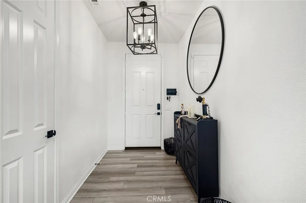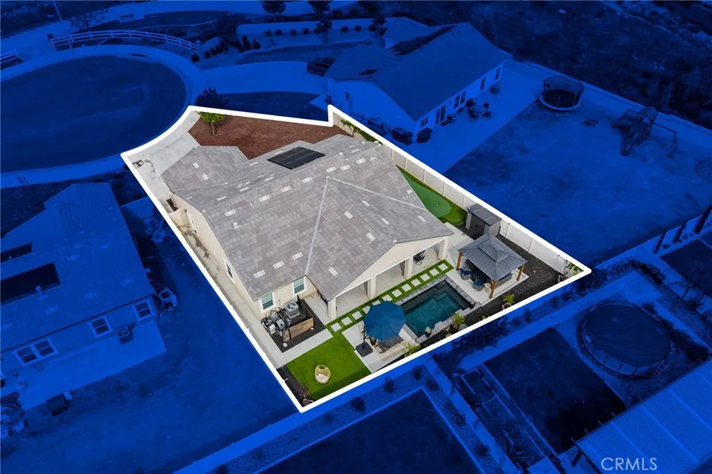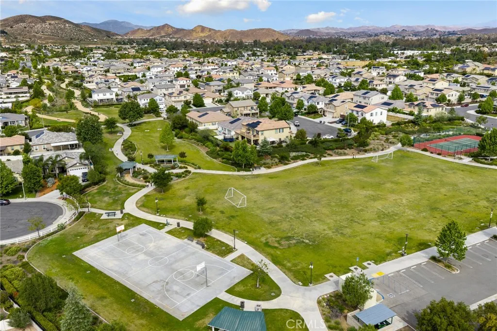 If you are looking for a private oasis and breathtaking views to call home, then be ready to fall in love! Welcome home to English Court featuring 3 bedrooms, 2 baths and just under 1700 sqft of designer living space complimented by a 7841 sqft lot offering a large spool, putting green, and solar. This stunning single-story property was built in 2021 and is located in the highly sought after community of Hidden Hills, in Menifee. The home is situated at the end of a cul-de-sac with no front neighbors allowing unobstructed mountain views. The front curb appeal features a blank canvas of mulch ready to be transformed into your dream yard, along with a wide driveway, potential RV parking and a charming porch perfect for enjoying the sunset. Upon entering the home, you are greeted by tall ceilings, LVP floors, high baseboards, recessed lighting, neutral paint, a large hall chandelier with plantation shutters throughout. The Great Room offers stunning views of the private yard, large windows allowing tons of natural light and a bold wall finished with wood accents. The dining nook flows into the gourmet kitchen appointed with quartz two toned counters, white cabinets and black finishes, herringbone subway tile backsplash, stainless steel appliances a wine/drink fridge and walk-in pantry with a glass front pantry door. The two secondary bedrooms boast plush carpet, standard closets, ceiling fans and share a secondary bath featuring a dual vanity, shower tub combo and linen closet. On the South wing of the home is the large laundry room with access to the two-car garage featuring storage and the primary bedroom which boasts plush carpet, views of the yard and an attached bath appointed with a large shower, dual vanity, linen and walk-in closet. The entertainers dream yard features a dual CA room with multiple ceiling fans, concrete for entertaining, a large 16' x 10' pebble tech spool (pool and spa in one) with seating all the way around featuring waterfalls and stone finishes. The property also boasts a large putting green, artificial turf, potted plants, a shed and gazebo that will stay. The community offers trails, a sports park, tot lot and is centrally located minutes to the 215 and 15 freeways, super close to shopping and zoned for Menifee Union school district. This is a home you don't want to miss!