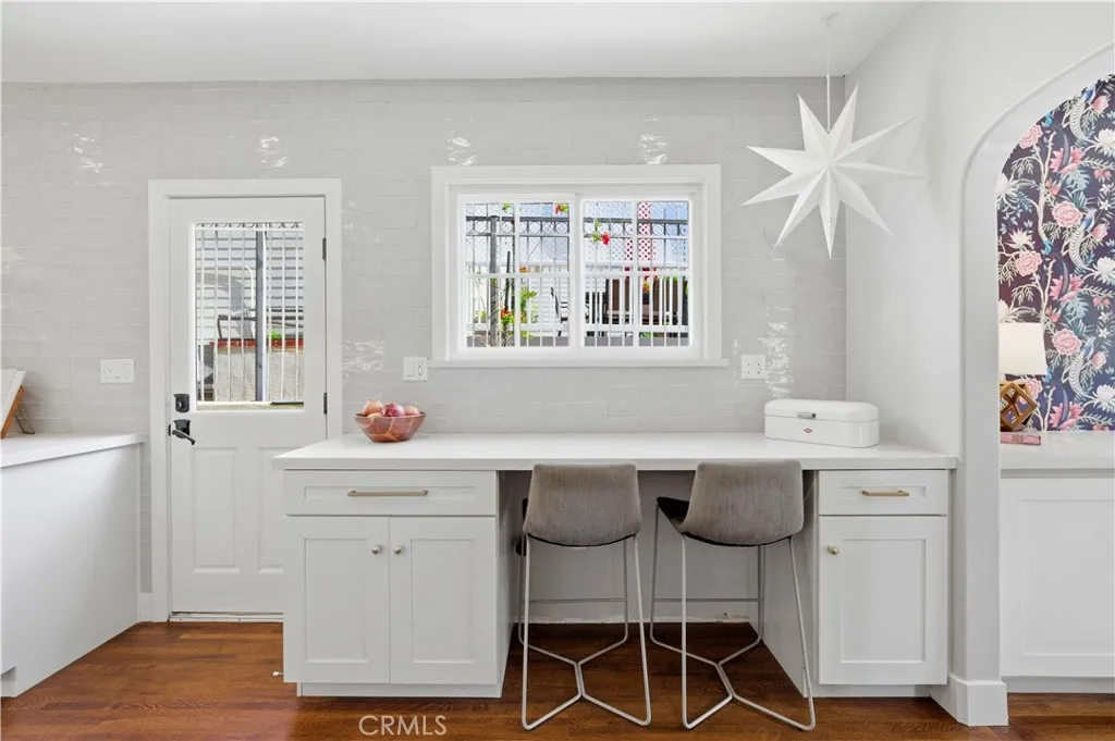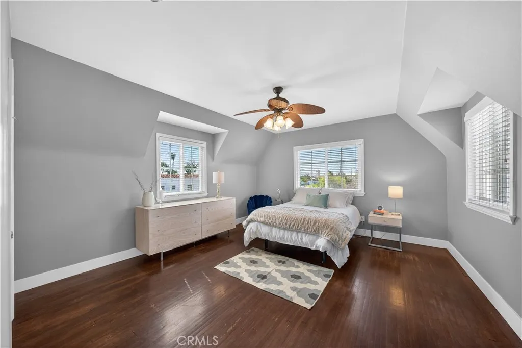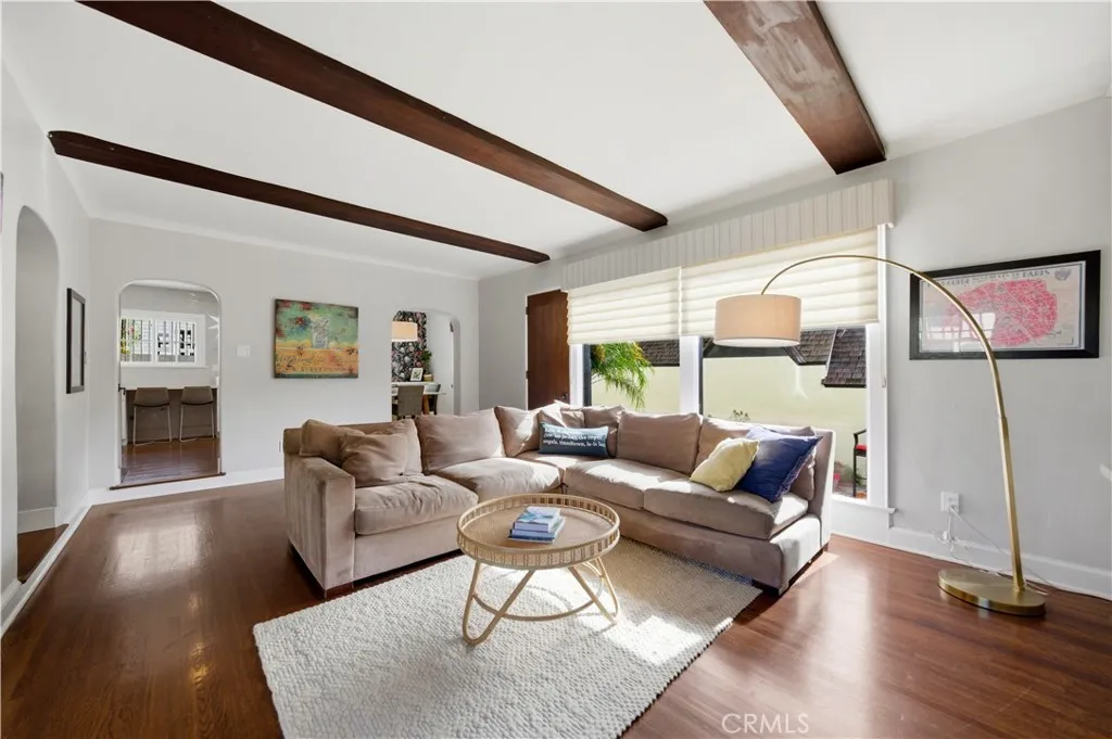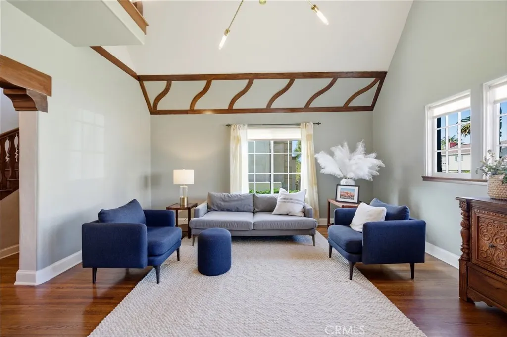 Rarely available, this beautiful Tudor Revival is located in the coveted Belmont Heights Estates. Built in 1928, this home spans over 3,000 square feet with 4 bedrooms and 3 bathrooms on a 6,361 square foot lot including a 4-car garage. An inviting entry with original wood detailing opens to a breathtaking living room defined by soaring ceilings, exposed decorative timber trusses, and an interior balcony. The remodeled kitchen blends modern amenities while maintaining a timeless design, featuring a Wolf range, stainless steel appliances, a walk-in pantry, abundant cabinetry and prep space, a peninsula with seating for casual dining, a dedicated coffee station, and the first of two washer/dryer locations. An arched opening leads to the sunlit dining room, complete with a custom buffet and elegant wallpaper. A separate family room with built-ins provides a comfortable space overlooking the front and back yards, while a dedicated office and a period-style three-quarter bath complete the first floor. Upstairs, natural light floods all 4 bedrooms, each with walk-in closets, and 2 vintage bathrooms. A central flex space—ideal as a playroom, teen lounge, or den—separates the bedrooms and adds versatility. Set back from the street, the home features a large front yard and a backyard patio perfect for entertaining or enjoying the wonderful Long Beach weather. The rear of the property provides access to the 4-car garage with parking for additional cars on the apron. This home’s amazing location places it just moments from the restaurants and shops in Belmont Shore, award-winning schools, the beach, the bike path, and the bay.