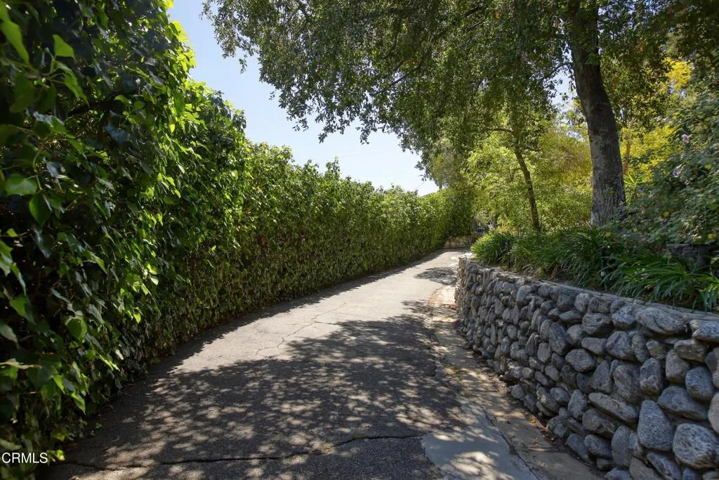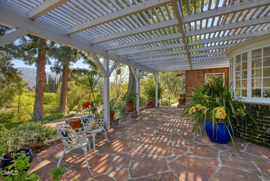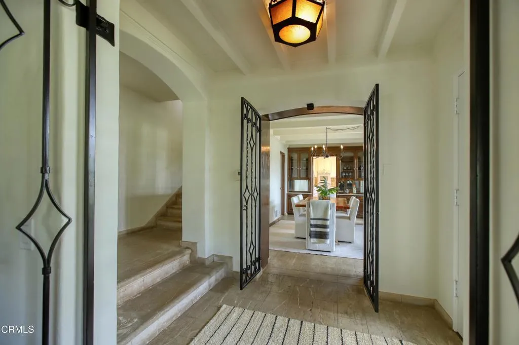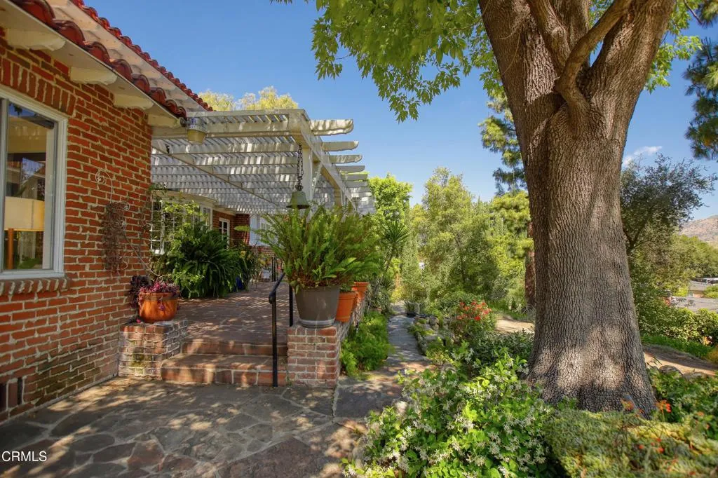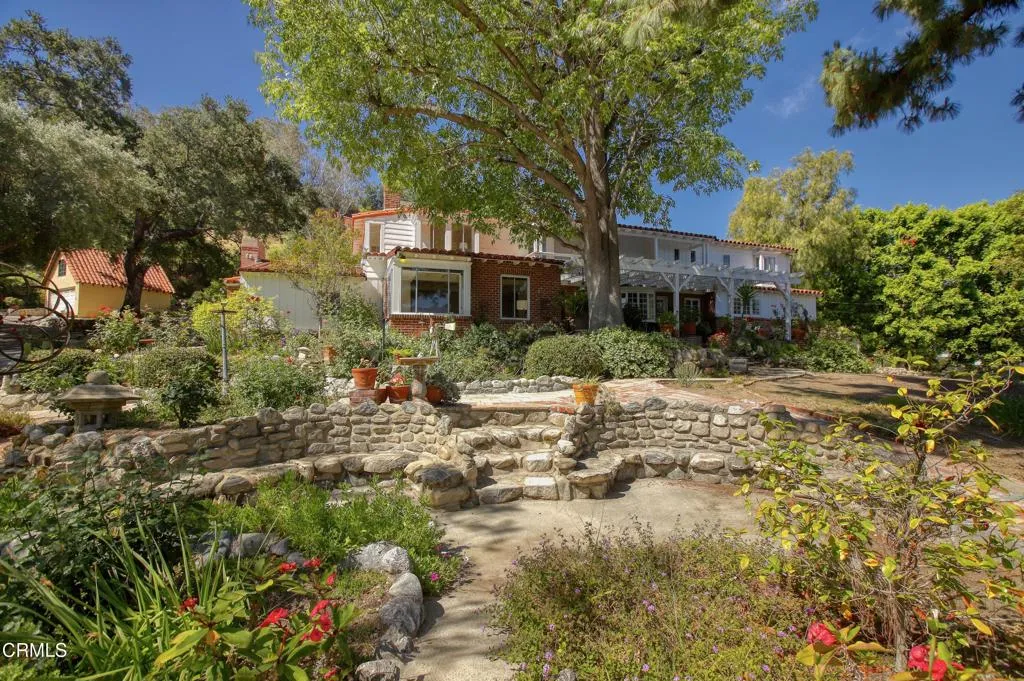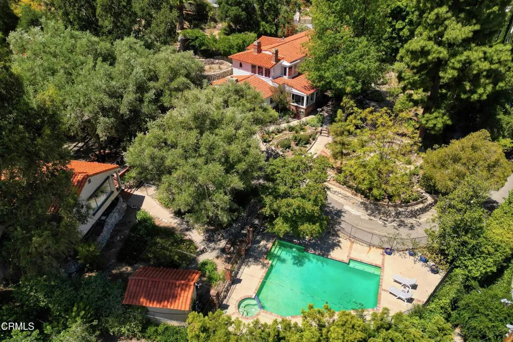 Tucked out of sight on over an acre of land bordering Shadow Hills, this 1935 estate feels like its own private world - layered, unexpected, and full of character. The grounds unfold in all directions, with a guest house, pool and spa, two-story garage, mature gardens, and even a stone chapel - each space offering something different to explore and make your own. Beyond the front gate at the street, a long, winding drive builds anticipation before revealing the house perched above, welcoming you to its stone porch and sunlit patio. Inside, the 4,301 sq ft main home retains its character with wood-beamed ceilings, stone and hardwood floors, wrought iron details, thoughtfully crafted built-ins and intimate seating nooks. Just off the kitchen, a wood-and-stone bar room feels like a hidden bonus space you didn't know you needed. The main level blends formal and relaxed living, with a bright living room, tiled family room, and formal dining space that flows into the kitchen, pantry, and laundry. A large bathroom off the living room is convenient for guests, and the additional bedroom and bath on this floor - likely used originally as a maid's quarters - adds more flexibility. Upstairs, the layout opens up with three more secondary bedrooms, a hall bath, sunroom, and a primary suite with fireplace seating area and a one-of-a-kind stained-glass dressing space - once used as an indoor chapel. The second floor offers plenty of room to reimagine: studio, office, library, or whatever fits your life, with mountain views as the backdrop. Outside, the grounds are designed for both entertaining and retreat. Lounge by the pool and spa, host dinners under the olive grove, set up a game on the sport court, or carve out your own creative corners across the patios and terraces. The detached 465 sq ft guest house is ideal for guests, multigenerational living, a home office, artistic space, recording studio, or future income potential. This is an incredibly unique, character-rich property with space to live, create, and grow into. Come experience a home that gives you room for a little more freedom and individuality.