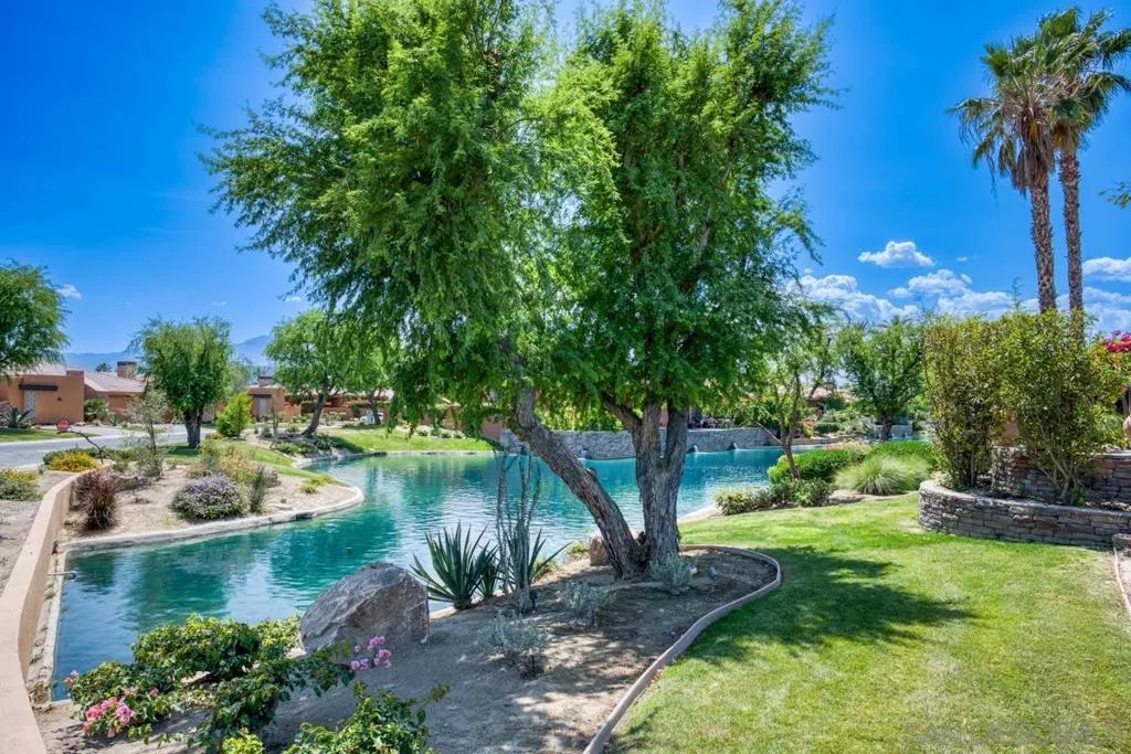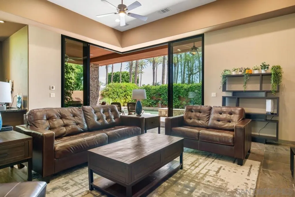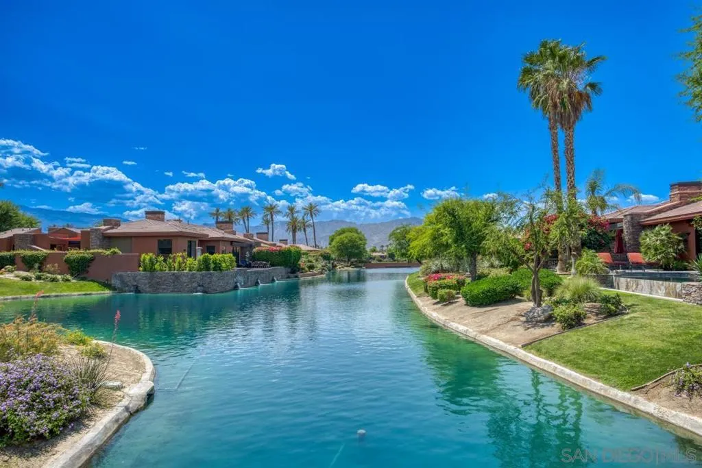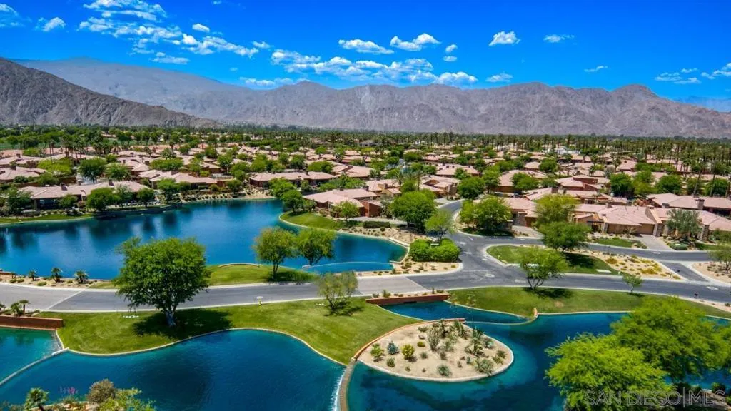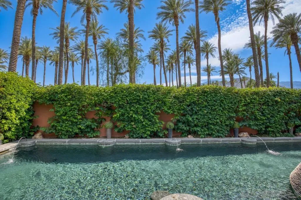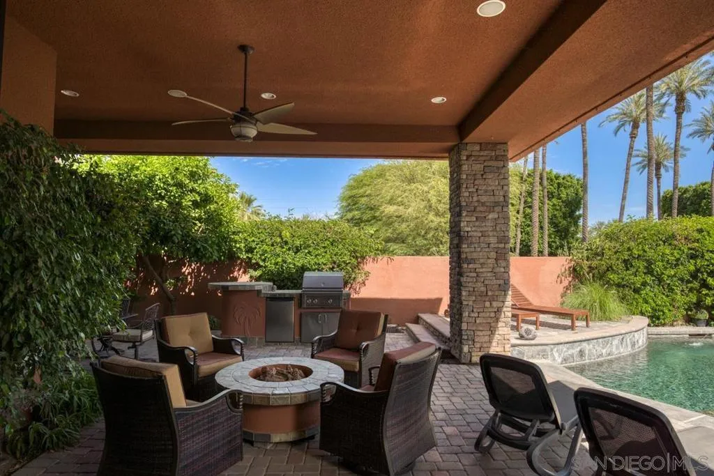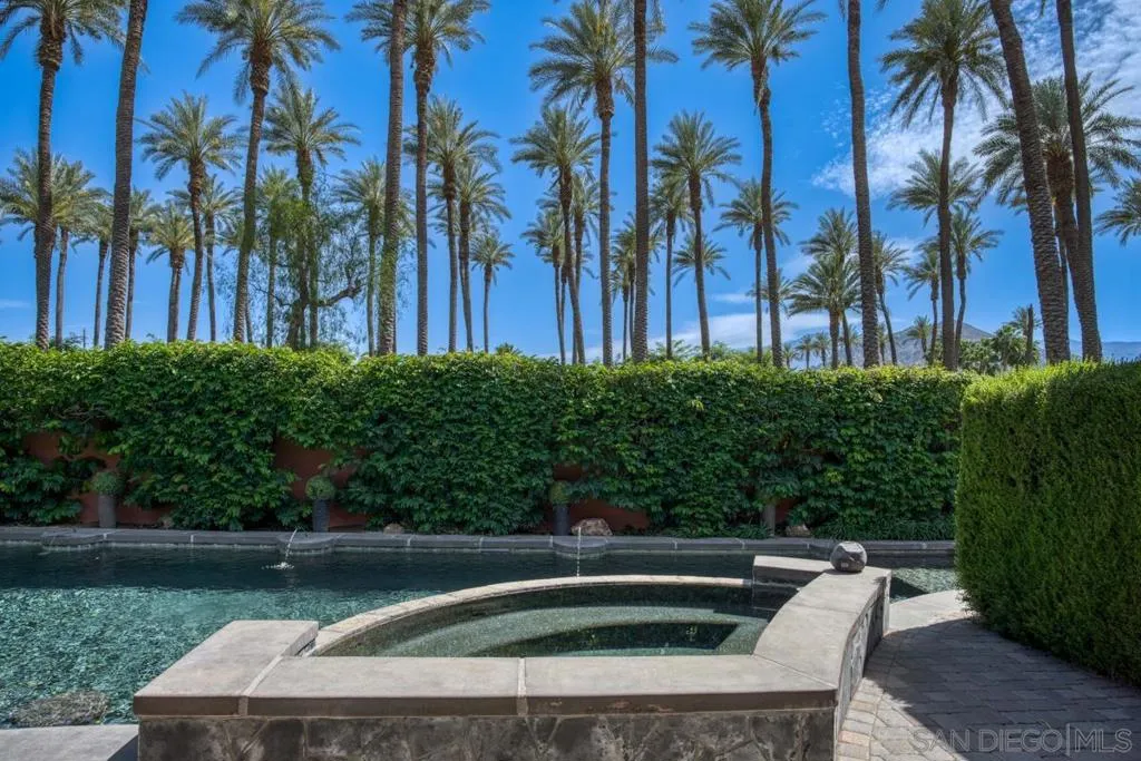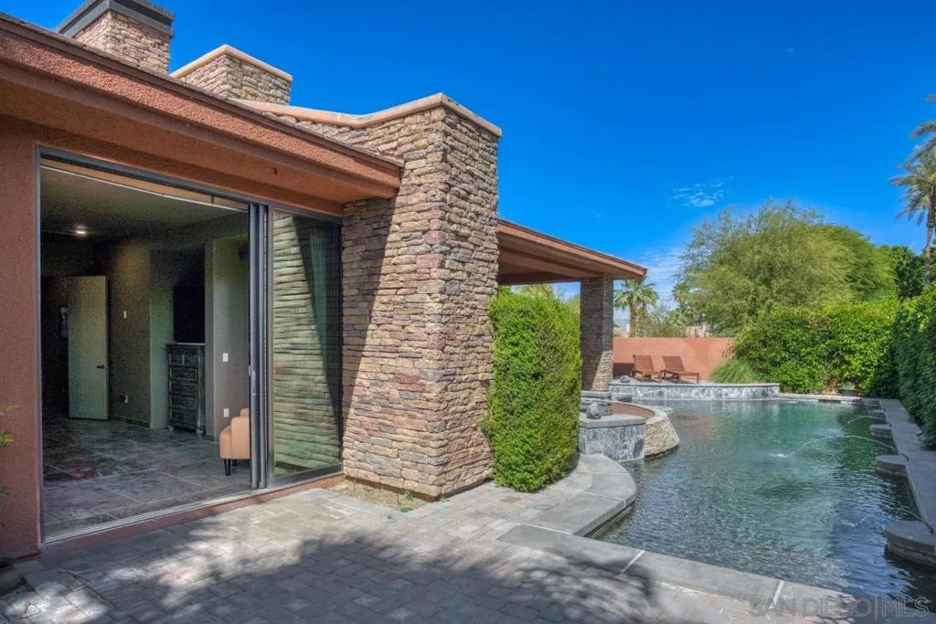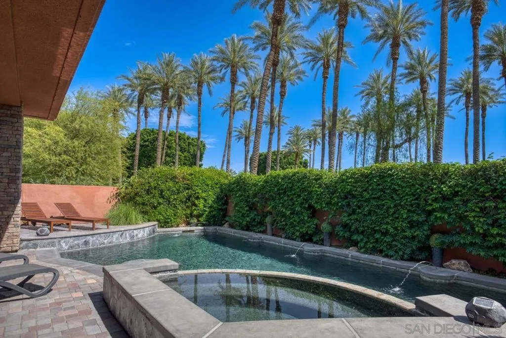 Nestled within the prestigious Palmilla community, this exceptional residence offers a rare blend of privacy, luxury, and breathtaking surroundings. Positioned on an expansive, secluded cul-de-sac lot, the home captures stunning views of the Santa Rosa Mountains and reflects true pride of ownership throughout. The chef’s kitchen is beautifully appointed with high-end stainless steel appliances, anchored by a generous center island—perfect for entertaining and everyday living. The open-concept living room impresses with soaring ceilings, a striking fireplace framed by custom built-in cabinetry, and a stylish bar area that enhances the home’s inviting atmosphere. Adding to the home’s versatility is a dedicated home theater, thoughtfully designed to also function as a potential third bedroom or private office if desired—ideal for evolving lifestyle needs. The thoughtfully designed layout places the primary suite at the rear of the home for added privacy, complete with direct backyard access. An additional en-suite bedroom provides comfort for guests, while the den and secondary bedroom each open to their own private courtyards, creating tranquil indoor-outdoor retreats. The backyard is an entertainer’s dream, featuring a meticulously designed pool and spa area with a covered patio, lush landscaping, and ambient lighting that creates multiple spaces for relaxing and gathering. Recent upgrades include new pool equipment and pumps, as well as a rebuilt spa. Dual water heaters with a recirculating system add to the home’s efficiency. Truly a must see! Residents enjoy the benefits of a well-maintained HOA, including 24-hour guard-gated security, trash service, front landscaping, and common area maintenance. The HOA also maintains the community’s scenic lakes and provides exterior painting every eight years, ensuring lasting beauty and peace of mind in this sought-after neighborhood.