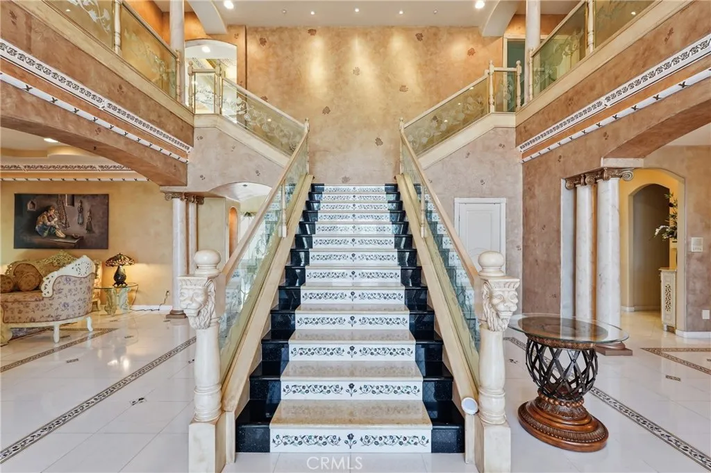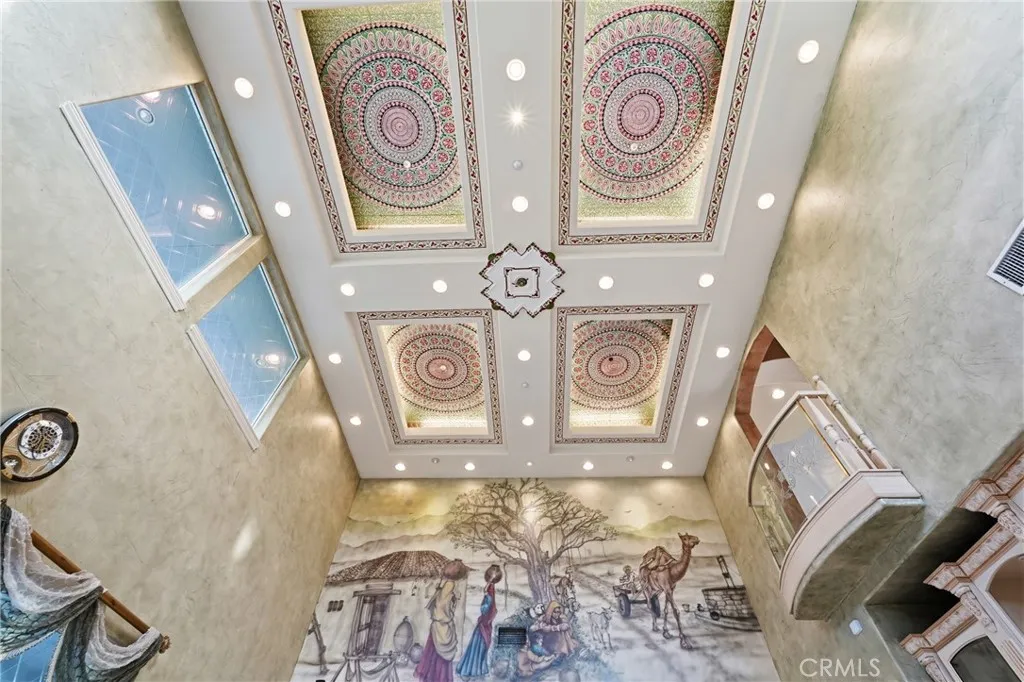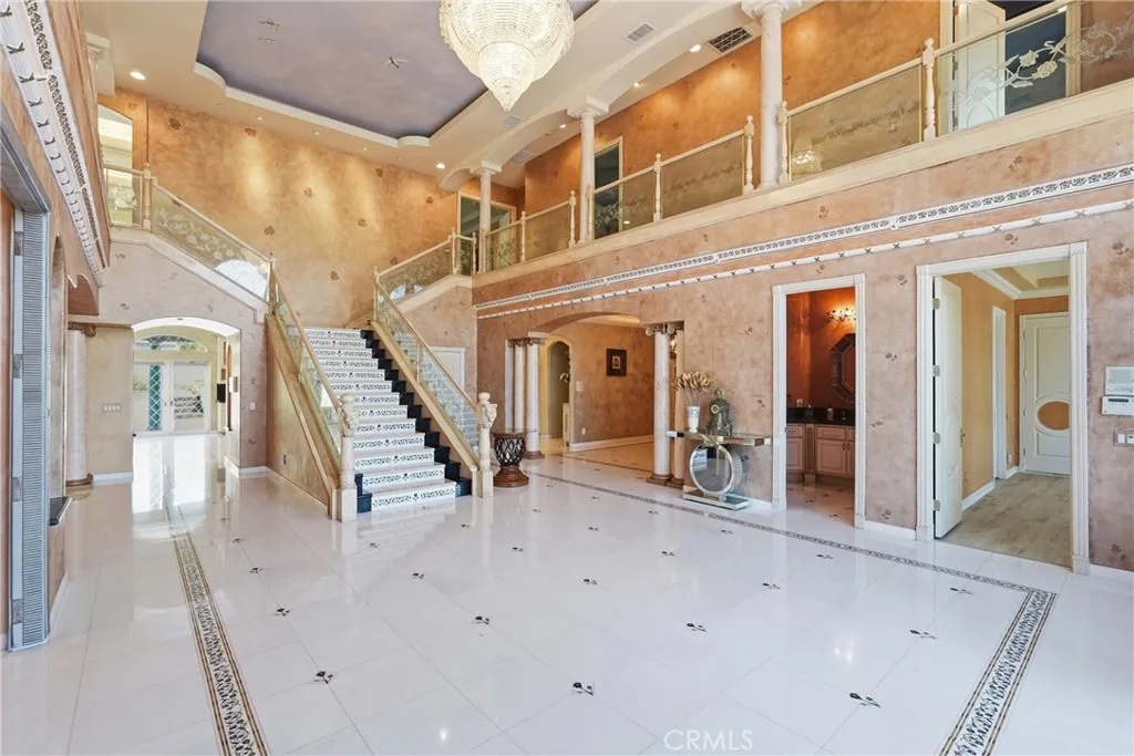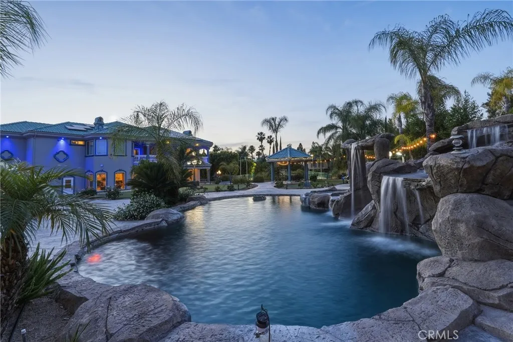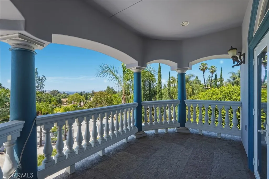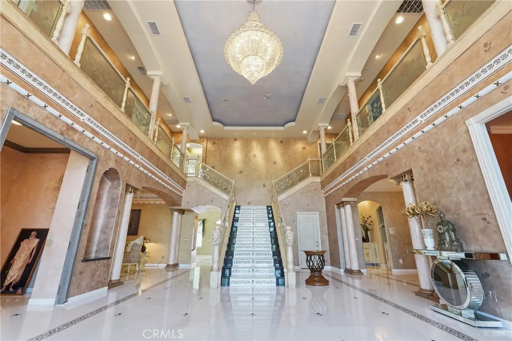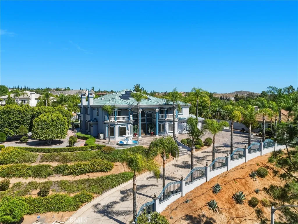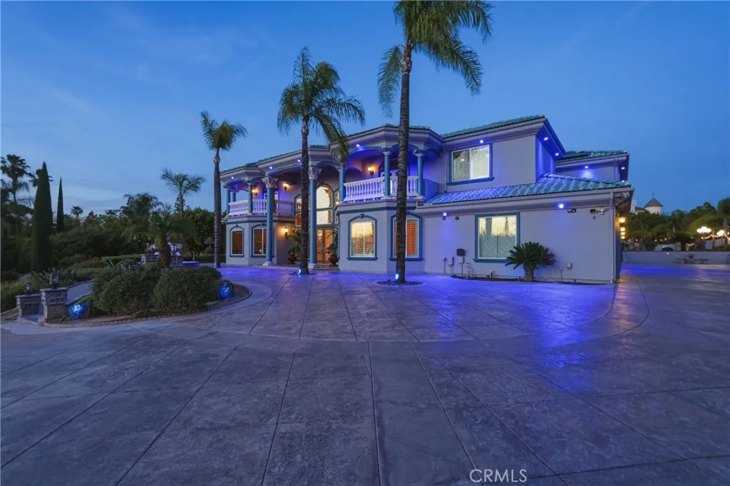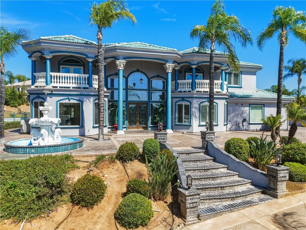 Welcome to one of Alessandro Heights’ premier custom estates, widely regarded as the “Beverly Hills of the Inland Empire”—an exclusive enclave known for estate-sized homes, privacy, and commanding views. For buyers coming from the coast, this is the moment of clarity: what if you could have significantly more home, more land, and more privacy—without compromising on luxury? This custom-built cul-de-sac residence showcases top-tier materials, craftsmanship, and one-of-a-kind design throughout. From the moment you enter, you’re greeted by a dramatic two-story foyer with gorgeous architecture and soaring ceilings that create an immediate sense of grandeur. Designed for both everyday living and large-scale entertaining, the home flows seamlessly through formal living and dining areas with a true chef’s dream kitchen—complete with butler’s pantry, separate cooking areas, heating drawers, and ample space to host gatherings of 150+ guests with ease. Inside, the home is nothing short of striking—featuring gold-accented finishes and custom paint throughout, hand-painted murals, intricate marble flooring with custom inlays incorporating real stone and mother-of-pearl, and a stunning mahogany wood fireplace with marble detail anchoring the formal living room. 6 generously sized bedrooms, including a main-level suite ideal for guests or multigenerational living, along with a dedicated office and multiple flexible-use spaces. Upstairs, enjoy a private theater room and multiple balconies capturing breathtaking panoramic views. The primary suite upstairs is a true retreat, complete with a its own seating area, fireplace, dual walk-in closets, and a private balcony overlooking unobstructed vistas. Additional highlights include two garage structures, paid off solar and a long private automatic gated driveway with parking capacity for over a dozen vehicles—ideal for collectors or large gatherings. The outdoor experience rivals a private resort. The backyard is designed for both relaxation and entertainment, featuring a full sports court (basketball, volleyball, pickleball, and tennis), a resort-style pool and spa with slide, waterfall, and heating, and an expansive outdoor kitchen with wraparound bar seating. Lush palm trees create a true paradise setting, complemented by a variety of fruit trees including pomegranate, persimmon, orange, lemon, avocado, and guava. A private courtyard offers peaceful seating areas with stunning views and ambiance. Extremely low tax rate!