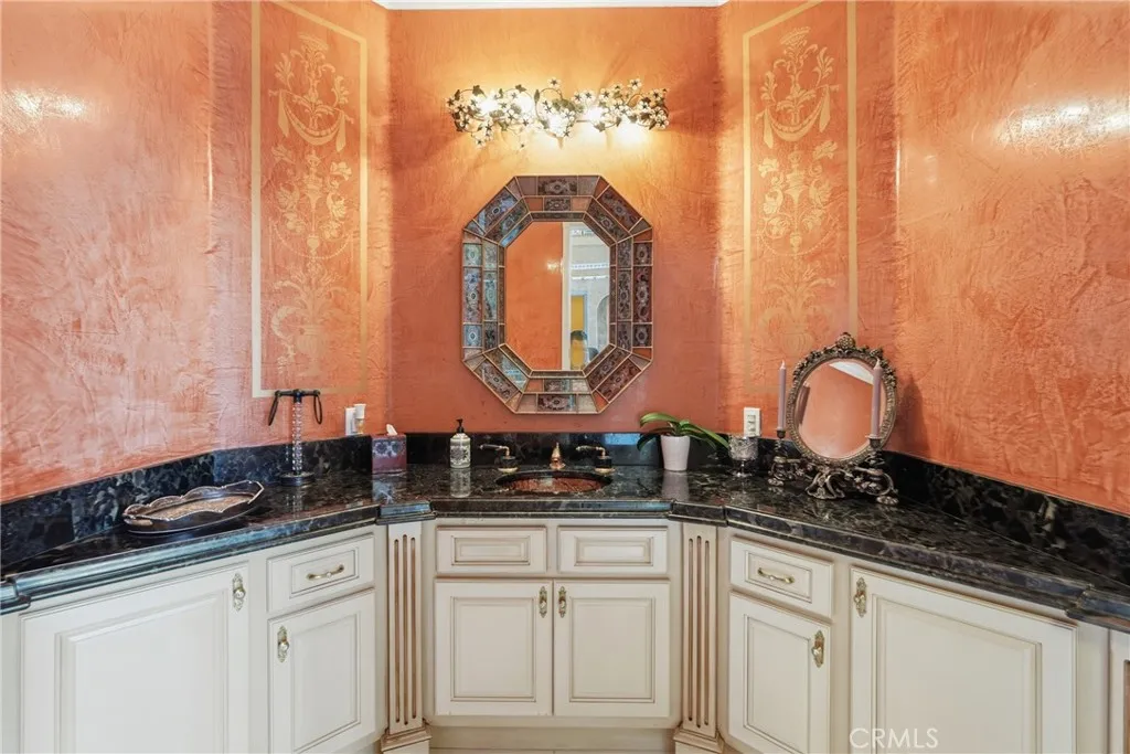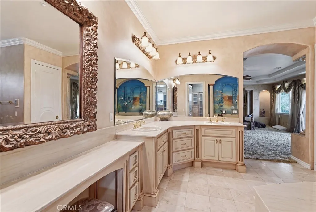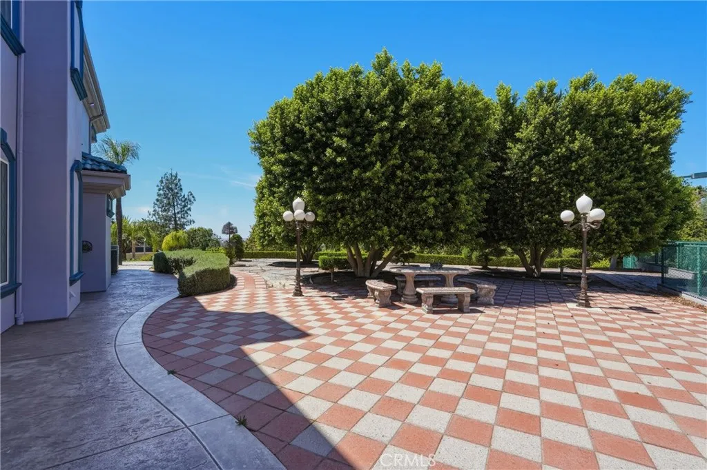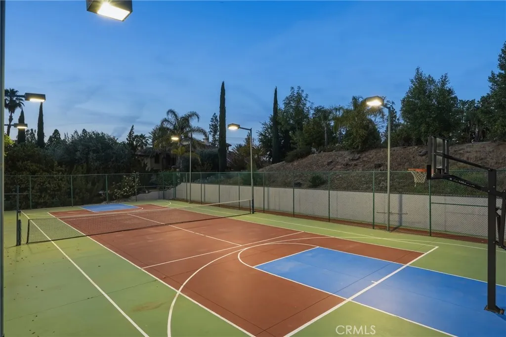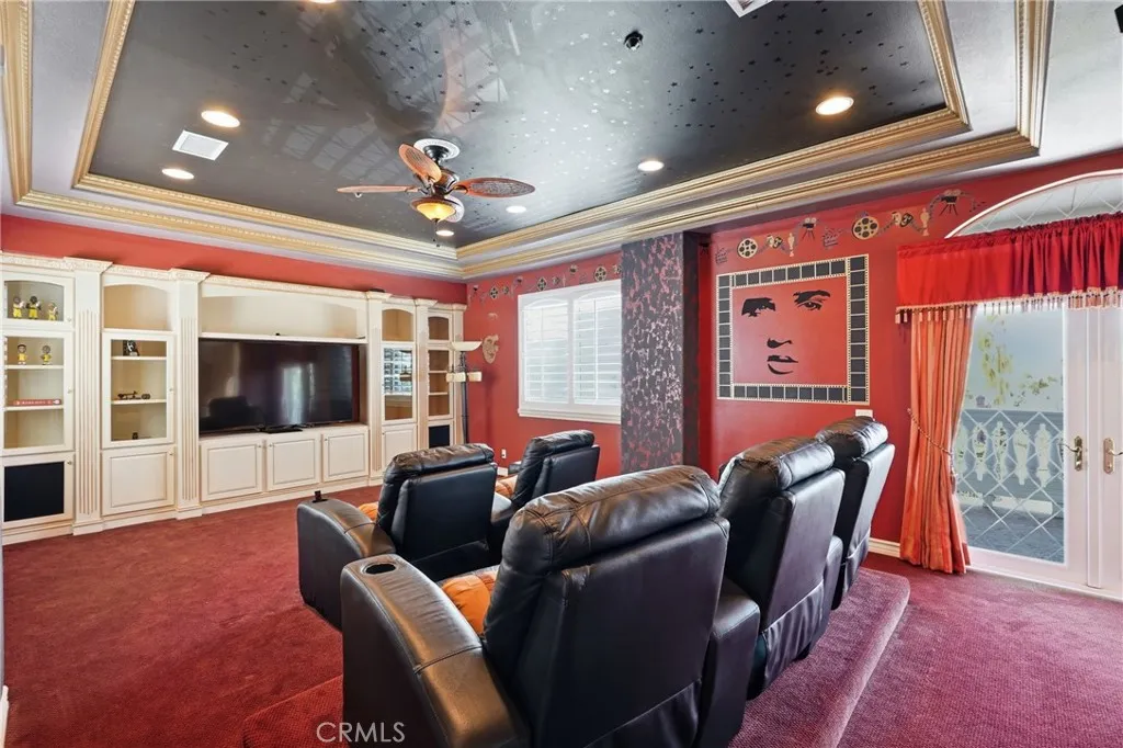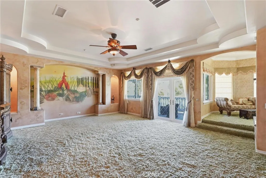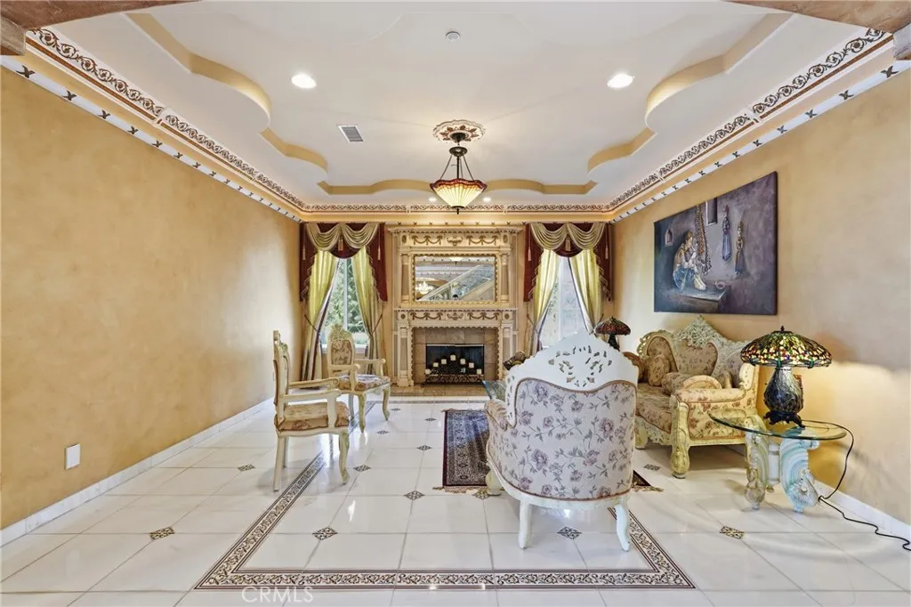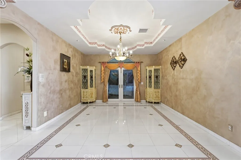Welcome to one of Alessandro Heights’ premier custom estates, widely regarded as the “Beverly Hills of the Inland Empire”—an exclusive enclave known for estate-sized homes, privacy, and commanding views. For buyers coming from the coast, this is the moment of clarity: what if you could have significantly more home, more land, and more privacy—without compromising on luxury? This custom-built cul-de-sac residence showcases top-tier materials, craftsmanship, and one-of-a-kind design throughout. From the moment you enter, you’re greeted by a dramatic two-story foyer with gorgeous architecture and soaring ceilings that create an immediate sense of grandeur. Designed for both everyday living and large-scale entertaining, the home flows seamlessly through formal living and dining areas with a true chef’s dream kitchen—complete with butler’s pantry, separate cooking areas, heating drawers, and ample space to host gatherings of 150+ guests with ease. Inside, the home is nothing short of striking—featuring gold-accented finishes and custom paint throughout, hand-painted murals, intricate marble flooring with custom inlays incorporating real stone and mother-of-pearl, and a stunning mahogany wood fireplace with marble detail anchoring the formal living room. 6 generously sized bedrooms, including a main-level suite ideal for guests or multigenerational living, along with a dedicated office and multiple flexible-use spaces. Upstairs, enjoy a private theater room and multiple balconies capturing breathtaking panoramic views. The primary suite upstairs is a true retreat, complete with a its own seating area, fireplace, dual walk-in closets, and a private balcony overlooking unobstructed vistas. Additional highlights include two garage structures, paid off solar and a long private automatic gated driveway with parking capacity for over a dozen vehicles—ideal for collectors or large gatherings. The outdoor experience rivals a private resort. The backyard is designed for both relaxation and entertainment, featuring a full sports court (basketball, volleyball, pickleball, and tennis), a resort-style pool and spa with slide, waterfall, and heating, and an expansive outdoor kitchen with wraparound bar seating. Lush palm trees create a true paradise setting, complemented by a variety of fruit trees including pomegranate, persimmon, orange, lemon, avocado, and guava. A private courtyard offers peaceful seating areas with stunning views and ambiance. Extremely low tax rate!