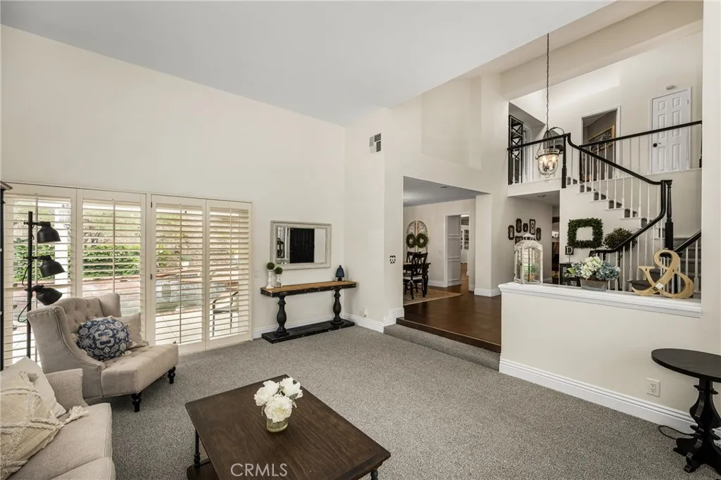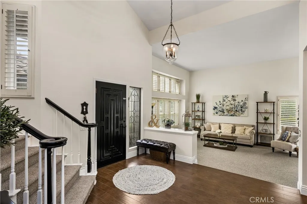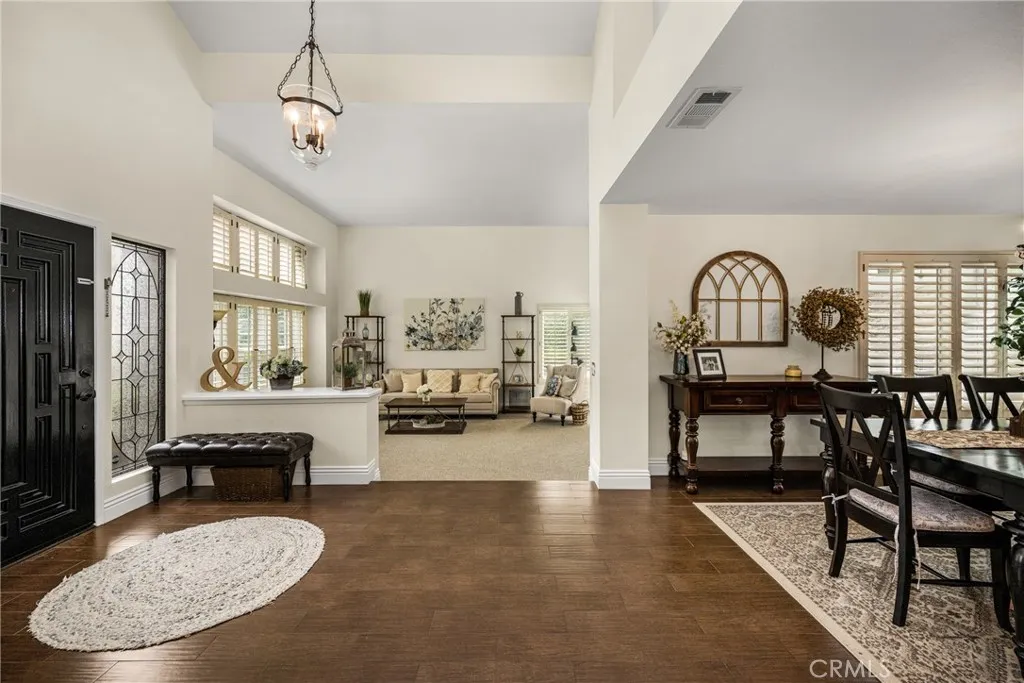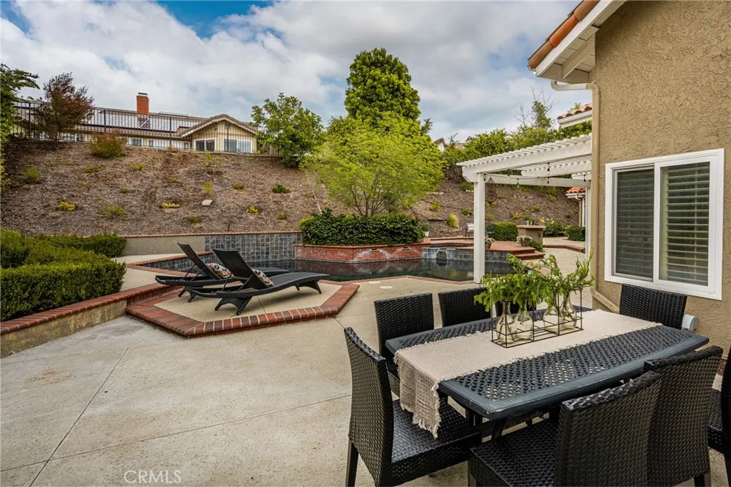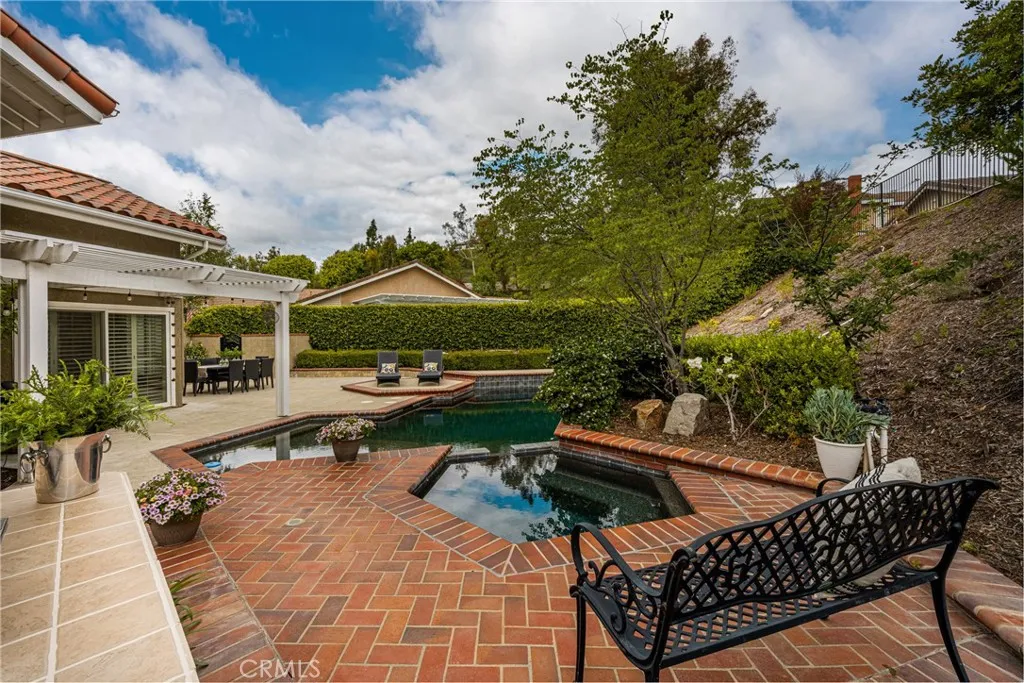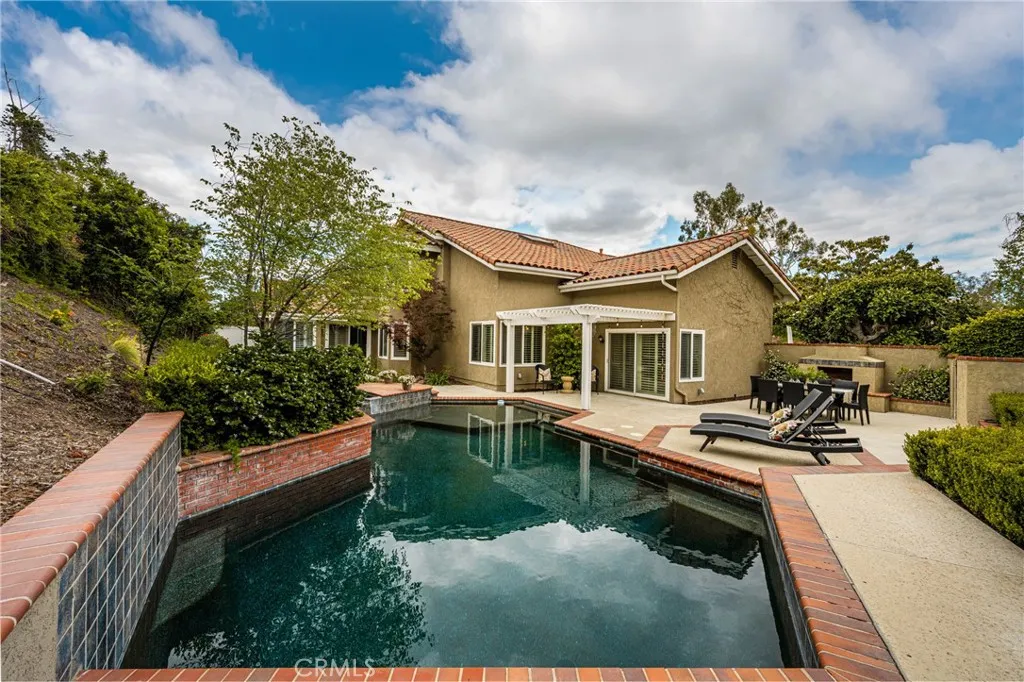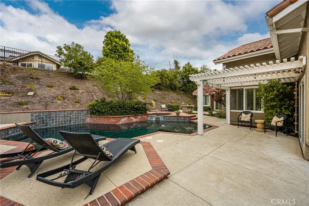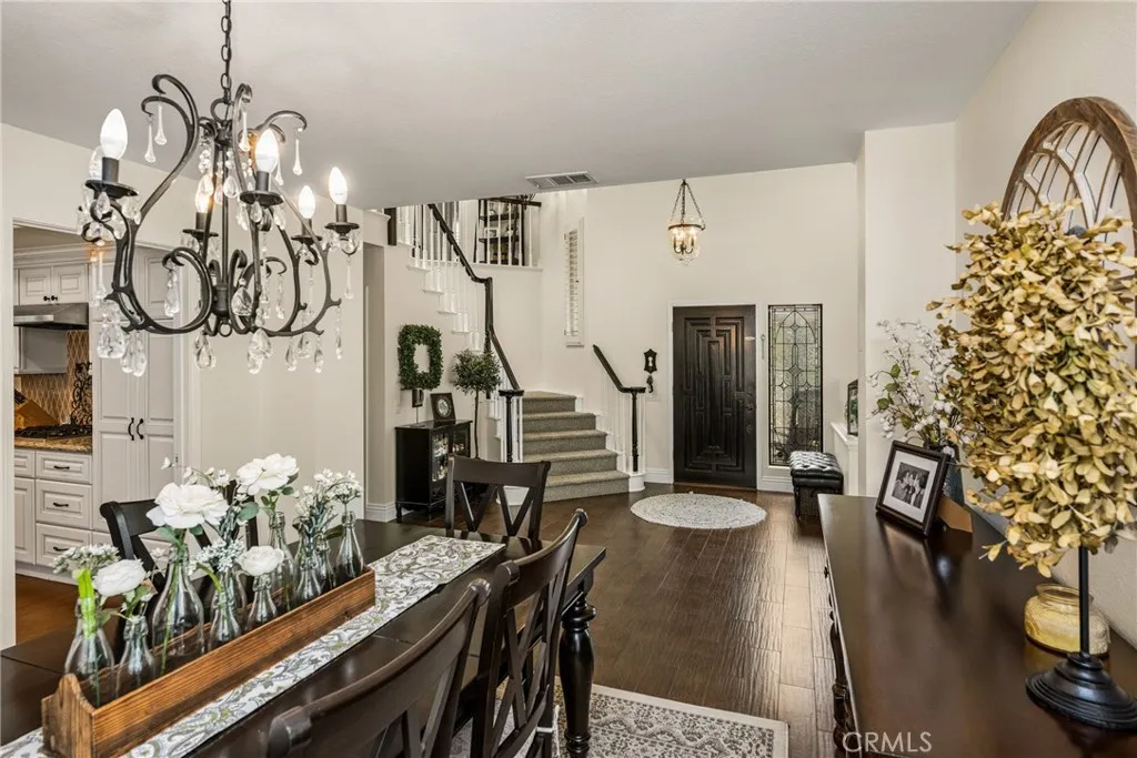 This stunning Autumn Ridge home nestled within the prestigious Mabury Ranch community is an exquisite remodeled residence showcasing timeless elegance. A dramatic entry with soaring ceilings and an open staircase sets the tone for this beautiful home, revealing designer touches throughout its expanded 3,100+ sq ft floorplan. The sunken formal living room features a sliding door to the rear covered patio, complemented by the adjacent formal dining room ideal for entertaining. The remodeled kitchen offers light cabinetry, granite countertops, custom diamond-pattern tile backsplash, pantry cabinet with pull-out drawers, stainless steel appliances, breakfast bar, and a sunny informal dining area. Overlooking the kitchen is the inviting family room with a brick fireplace. A separate beverage bar with built-in wine fridge is steps away. The impressive rear bonus room with vaulted ceilings and a wet bar provides the perfect space for a game room, media room, or expansive home office. The main level 1/2 bath is perfect for guests when entertaining. Upstairs, the expanded primary suite boasts vaulted ceilings and a spacious walk-in closet with custom built-ins. The re-imagined primary bath includes dual vanities, a deep soaking tub, tiled walk-in shower and designer finishes. Three additional guest bedrooms, a tastefully remodeled guest bath with dual sinks and subway-tiled tub/shower and a convenient laundry room with storage, complete the upper level. The resort-style backyard is a private sanctuary on a generous 9,600 sq ft lot. A pebble-tech pool and spa with Baja step and waterfall create a serene escape, while the outdoor gas fireplace sets the stage for unforgettable gatherings, Al fresco dining, and year-round enjoyment. Additional highlights include plantation shutters, wood-look tile flooring, dual-pane windows, Central AC and heat, indoor utility room/butler’s pantry with sink, and a water softener. The attached 3-car garage with built-in storage provides convenient direct home access. Perfectly positioned on a quiet cul-de-sac, this exceptional home offers the ideal blend of luxury, comfort, and convenience. Mabury Ranch is renowned for its spacious lots, top-tier schools, and proximity to scenic walking, hiking, and horse trails, as well as Santiago Oaks Park. Don't miss this rare opportunity in a neighborhood that can't be beat!