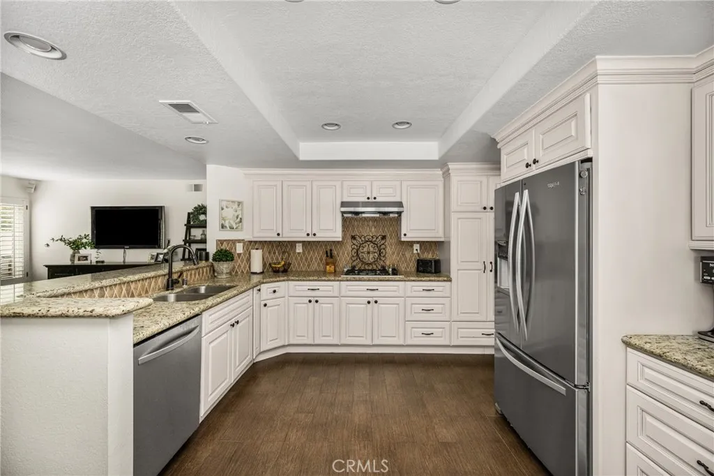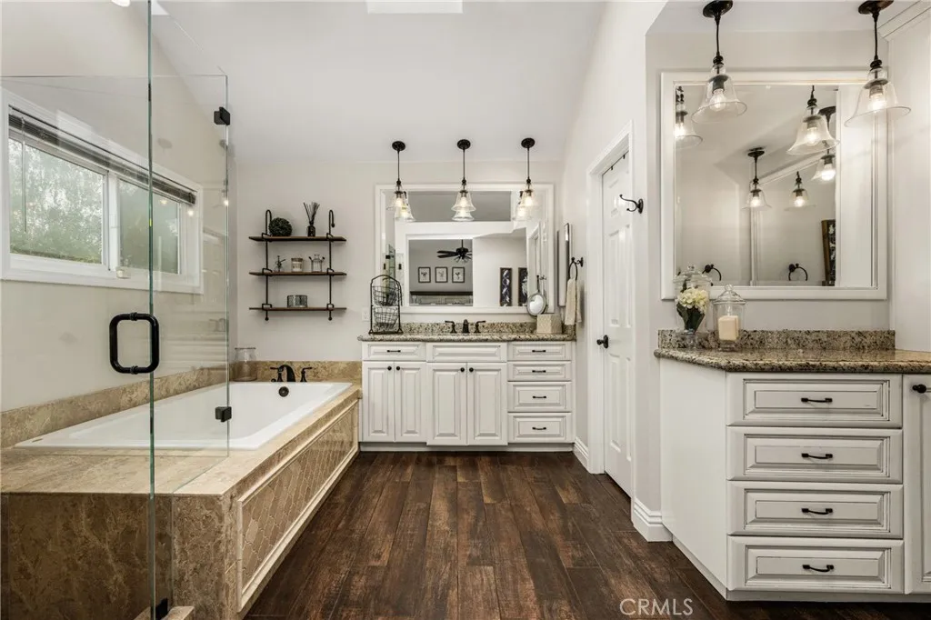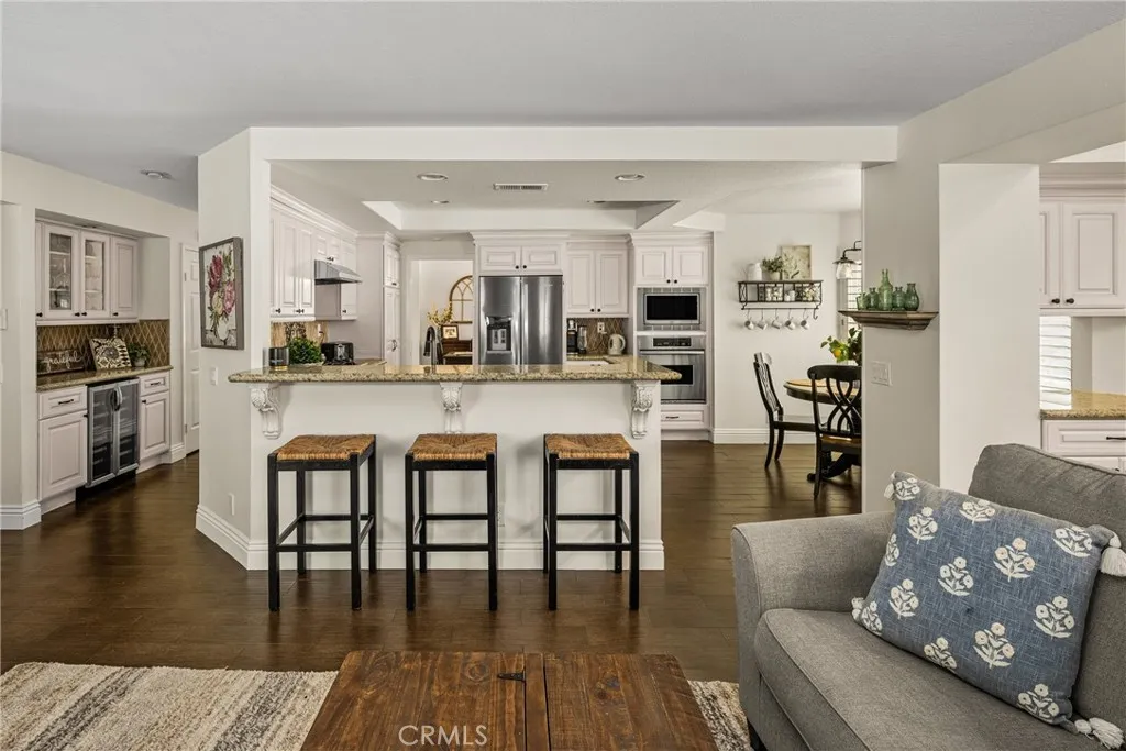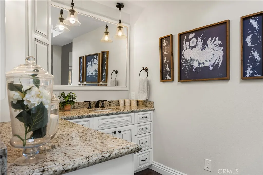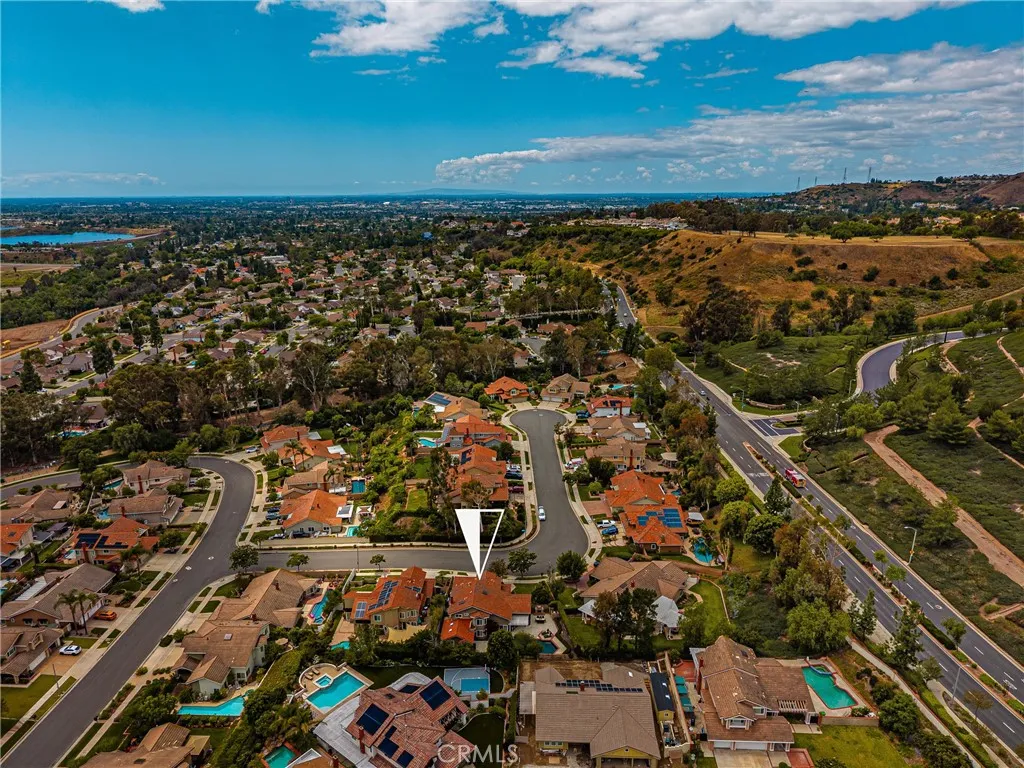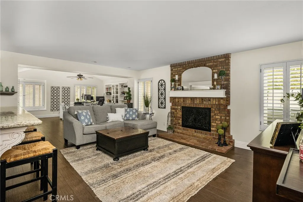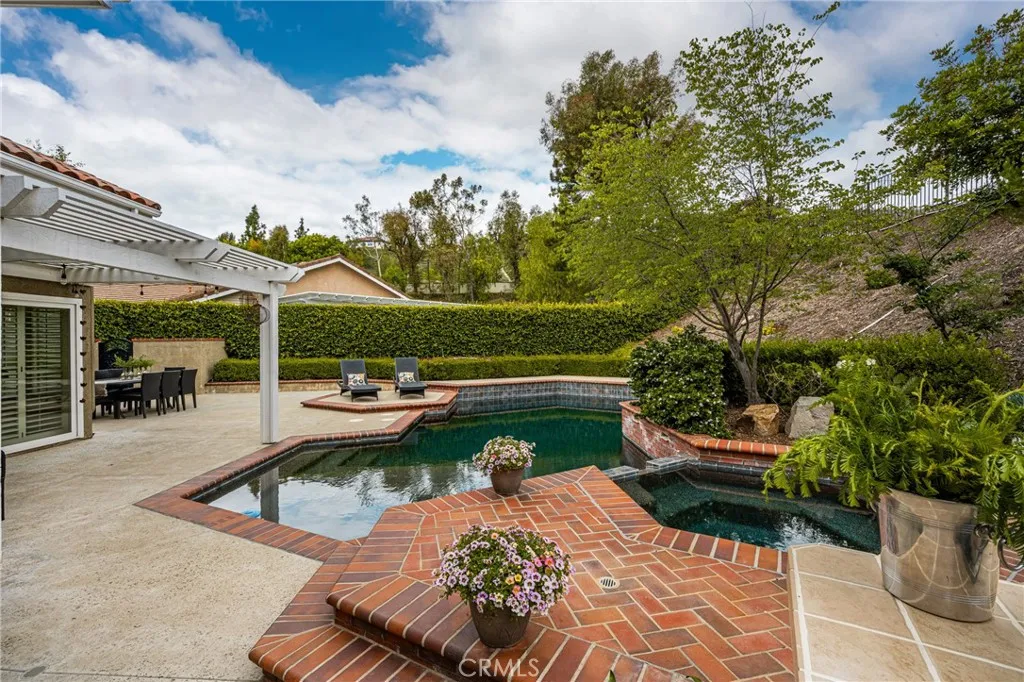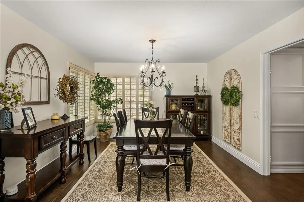 This stunning Autumn Ridge home nestled within the prestigious Mabury Ranch community is an exquisite remodeled residence showcasing timeless elegance. A dramatic entry with soaring ceilings and an open staircase sets the tone for this beautiful home, revealing designer touches throughout its expanded 3,100+ sq ft floorplan. The sunken formal living room features a sliding door to the rear covered patio, complemented by the adjacent formal dining room ideal for entertaining. The remodeled kitchen offers light cabinetry, granite countertops, custom diamond-pattern tile backsplash, pantry cabinet with pull-out drawers, stainless steel appliances, breakfast bar, and a sunny informal dining area. Overlooking the kitchen is the inviting family room with a brick fireplace. A separate beverage bar with built-in wine fridge is steps away. The impressive rear bonus room with vaulted ceilings and a wet bar provides the perfect space for a game room, media room, or expansive home office. The main level 1/2 bath is perfect for guests when entertaining. Upstairs, the expanded primary suite boasts vaulted ceilings and a spacious walk-in closet with custom built-ins. The re-imagined primary bath includes dual vanities, a deep soaking tub, tiled walk-in shower and designer finishes. Three additional guest bedrooms, a tastefully remodeled guest bath with dual sinks and subway-tiled tub/shower and a convenient laundry room with storage, complete the upper level. The resort-style backyard is a private sanctuary on a generous 9,600 sq ft lot. A pebble-tech pool and spa with Baja step and waterfall create a serene escape, while the outdoor gas fireplace sets the stage for unforgettable gatherings, Al fresco dining, and year-round enjoyment. Additional highlights include plantation shutters, wood-look tile flooring, dual-pane windows, Central AC and heat, indoor utility room/butler’s pantry with sink, and a water softener. The attached 3-car garage with built-in storage provides convenient direct home access. Perfectly positioned on a quiet cul-de-sac, this exceptional home offers the ideal blend of luxury, comfort, and convenience. Mabury Ranch is renowned for its spacious lots, top-tier schools, and proximity to scenic walking, hiking, and horse trails, as well as Santiago Oaks Park. Don't miss this rare opportunity in a neighborhood that can't be beat!