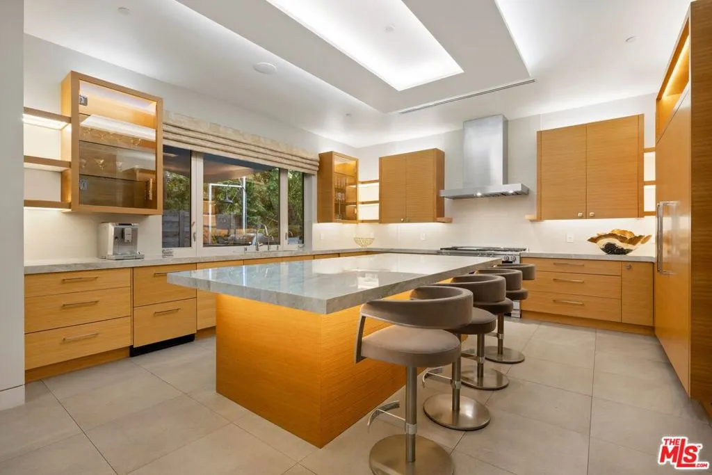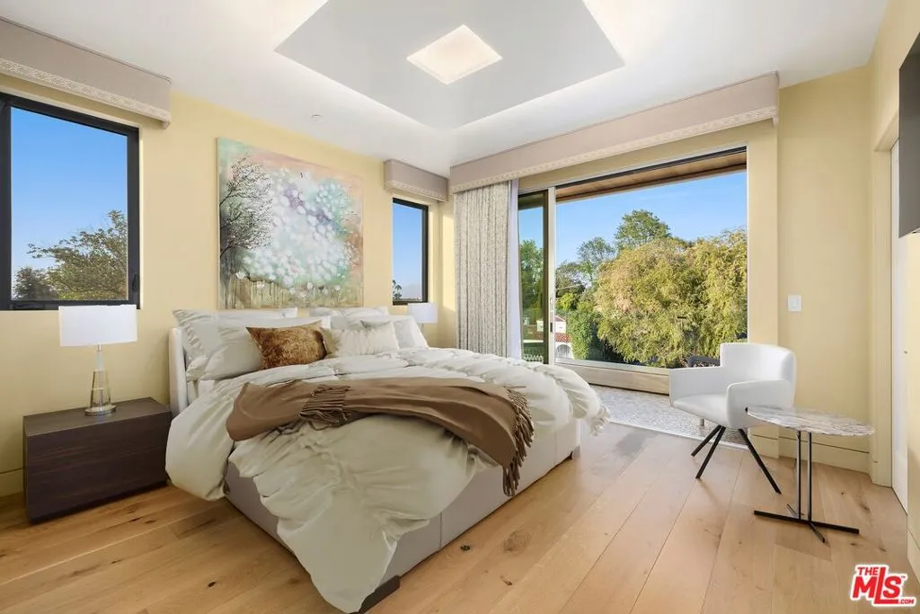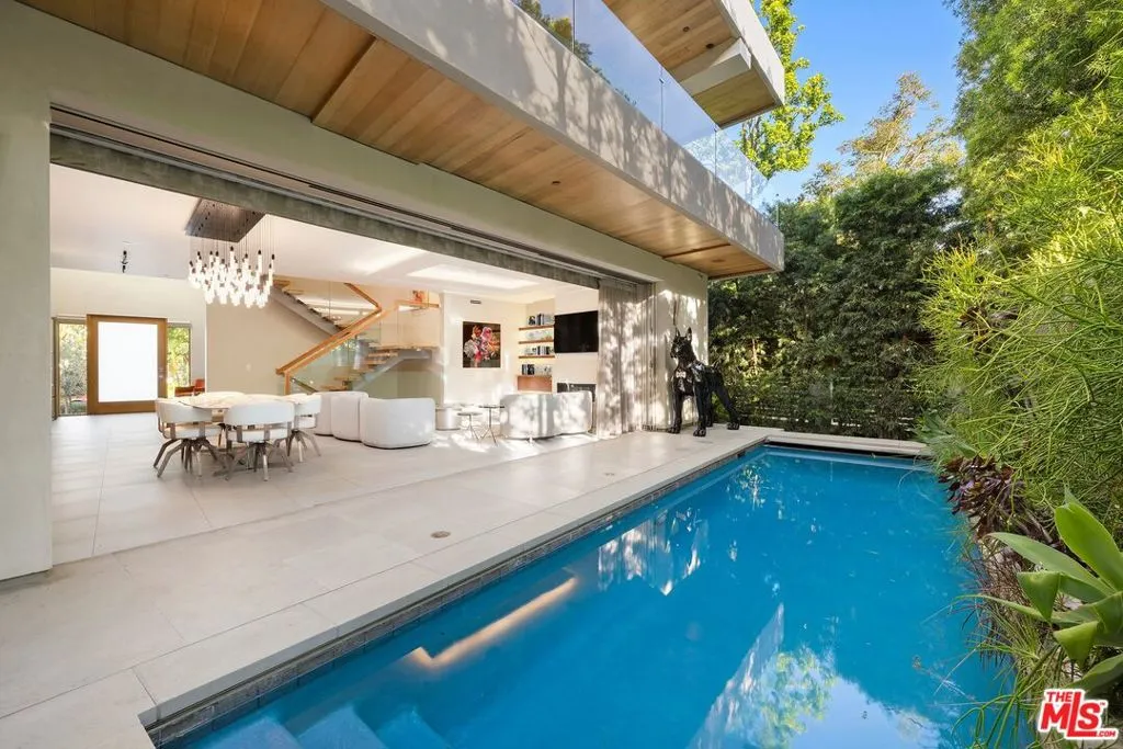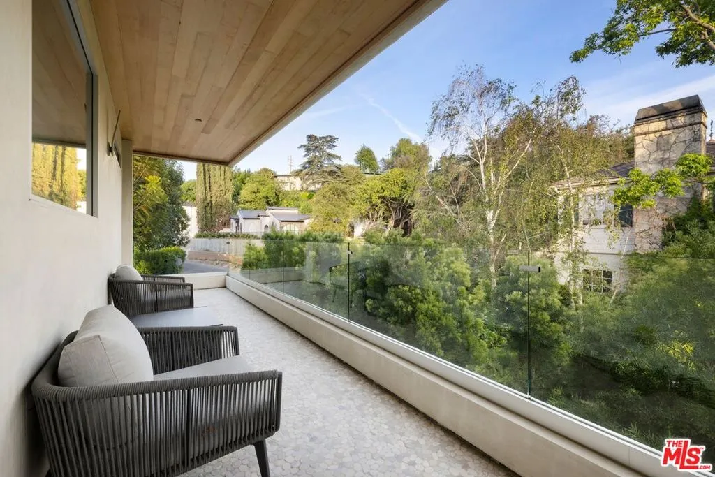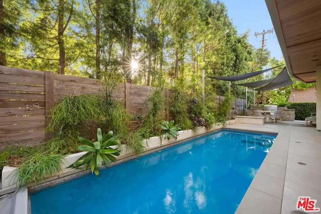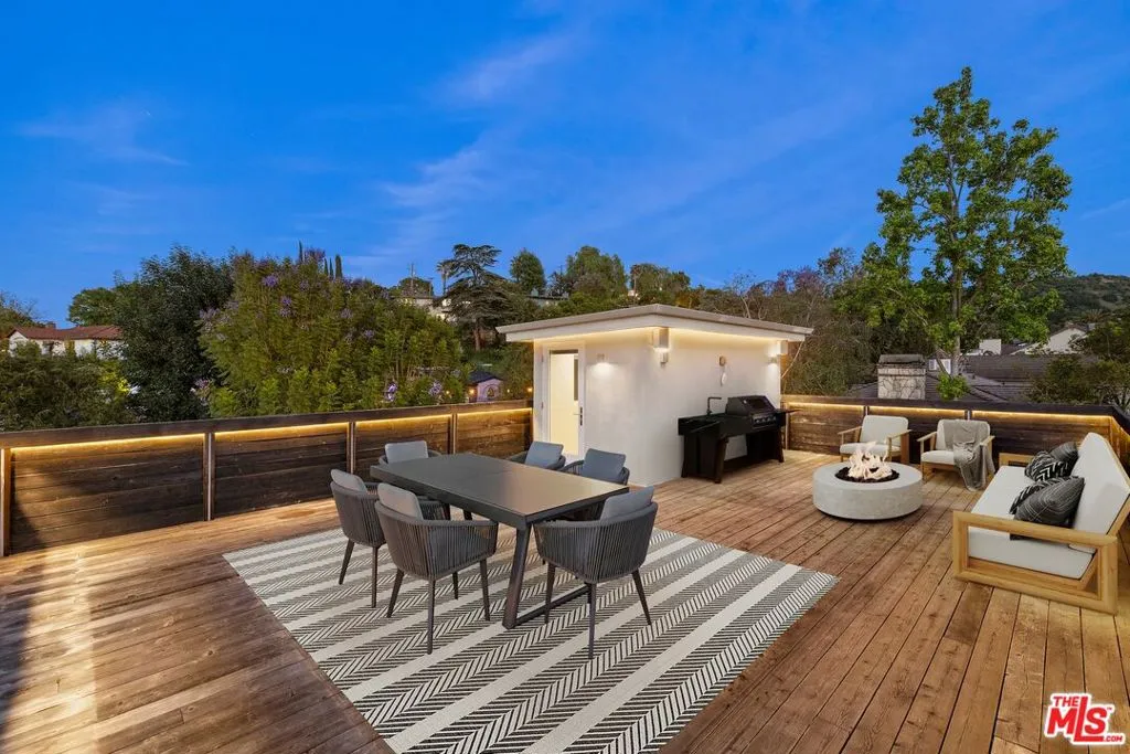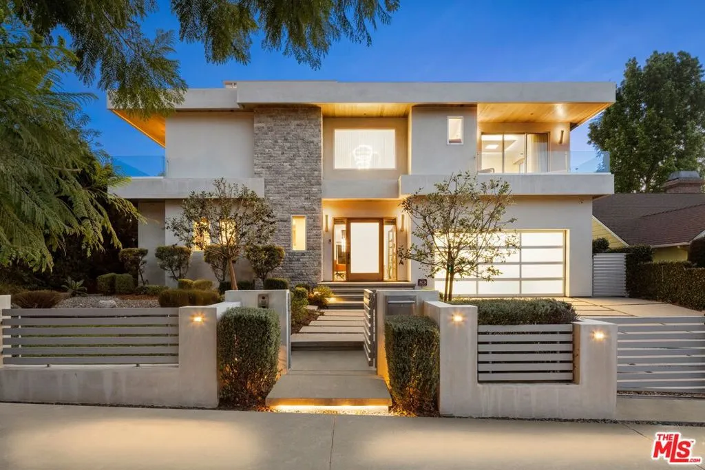 Welcome to this lovely, spacious, and gated contemporary pool home on a corner lot in coveted South-of-the-Boulevard Sherman Oaks, extensively updated throughout with modern finishes for today's lifestyle. Clean lines and geometric shape harmonize with warm woods and sandy brick to form the home's facade, inviting guests within. Inside, cool stone floors flow throughout the open-concept public entertaining spaces. The living room features an elegant fireplace flanked by floating open shelving as Fleetwood doors disappear to provide the ultimate indoor-outdoor experience. Nearby, enjoy meals with friends and family in the dining area, adjacent to the warm, modern kitchen with center island, glossy stone countertops, showcase cabinetry, and top-of-the-line appliances including a chef-grade Miele range with hood. Upstairs, the primary bedroom has wide-plank wood floors, tray ceiling accents, and sliding glass that opens to the large private balcony overlooking the manicured grounds below. The en-suite spa-like bath has a picture window framing greenery, soaking tub, oversized rainwater shower with niche and bench, and floating dual-sink vanity. The walk-in closet is a fashionista's dream, complete with dressing island and custom built-ins. Secondary bedrooms are spacious, two of which also have balcony access, and bathrooms are smartly updated. The fifth bedroom is utilized as an office. Enjoy sought-after amenities including a cinema with snack bar, game room with wet bar, gym, and elevator. Outside, relax in the shimmering pool, gather for conversation around the fire table, or dine al-fresco with lite bites prepared by the built-in barbecue. If that were not enough, there is even a finished rooftop deck offering sweeping 360-degree vistas of the hills and surrounding treetops! This prime location promises the ideal Sherman Oaks-Studio City way of life, located close to the many restaurants along Ventura Boulevard near the thriving social scene at the Sportsmen's Lodge complex, anchored by Erewhon and Equinox, as well as iconic LA landmarks like Casa Vega. Top-rated Dixie Canyon Community Charter is found just up the street, studios are moments away, the 101 Freeway is not far, and an easy canyon drive provides access to West Hollywood, Beverly Hills, and the Westside. Esteemed Harvard-Westlake high school is also nearby.