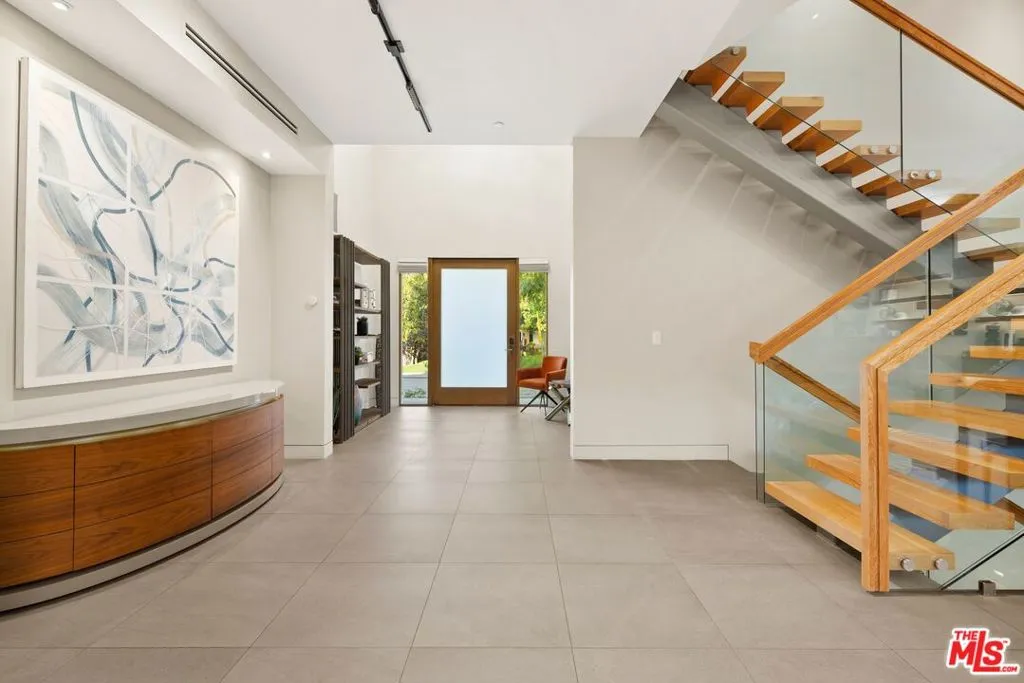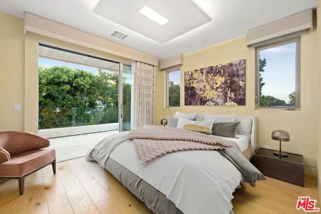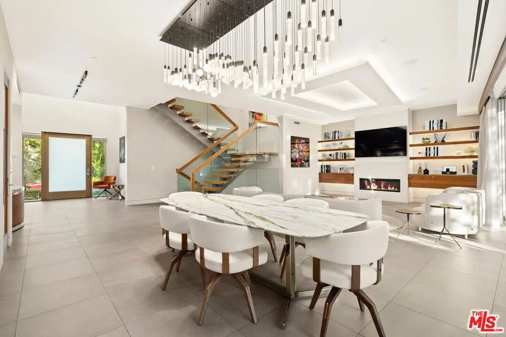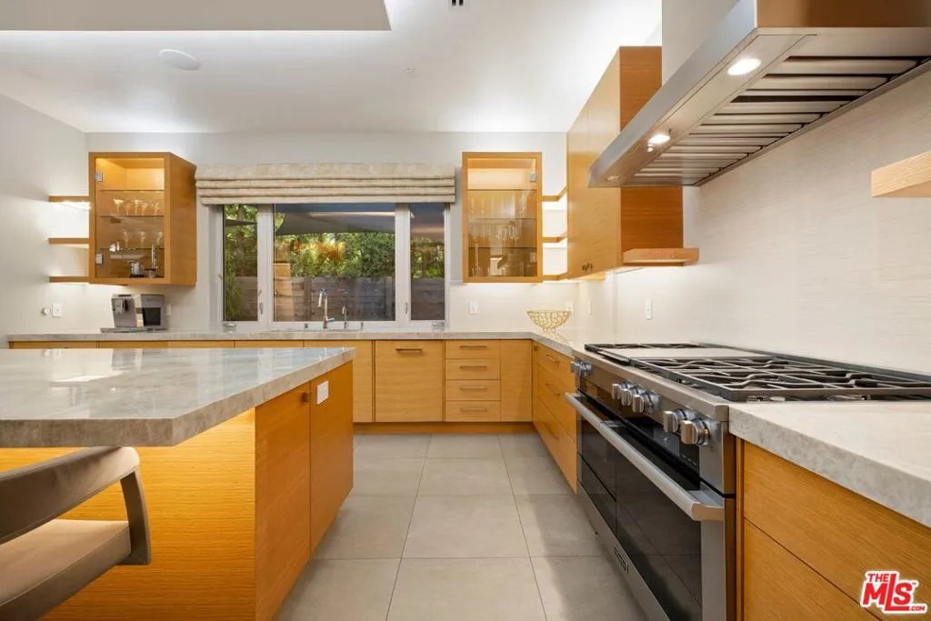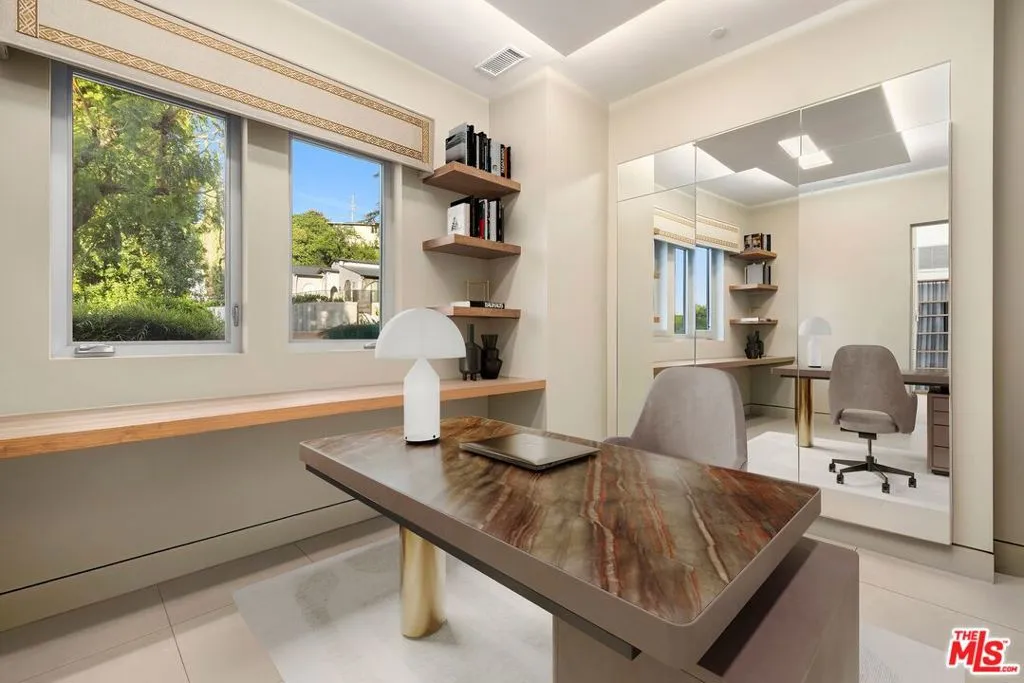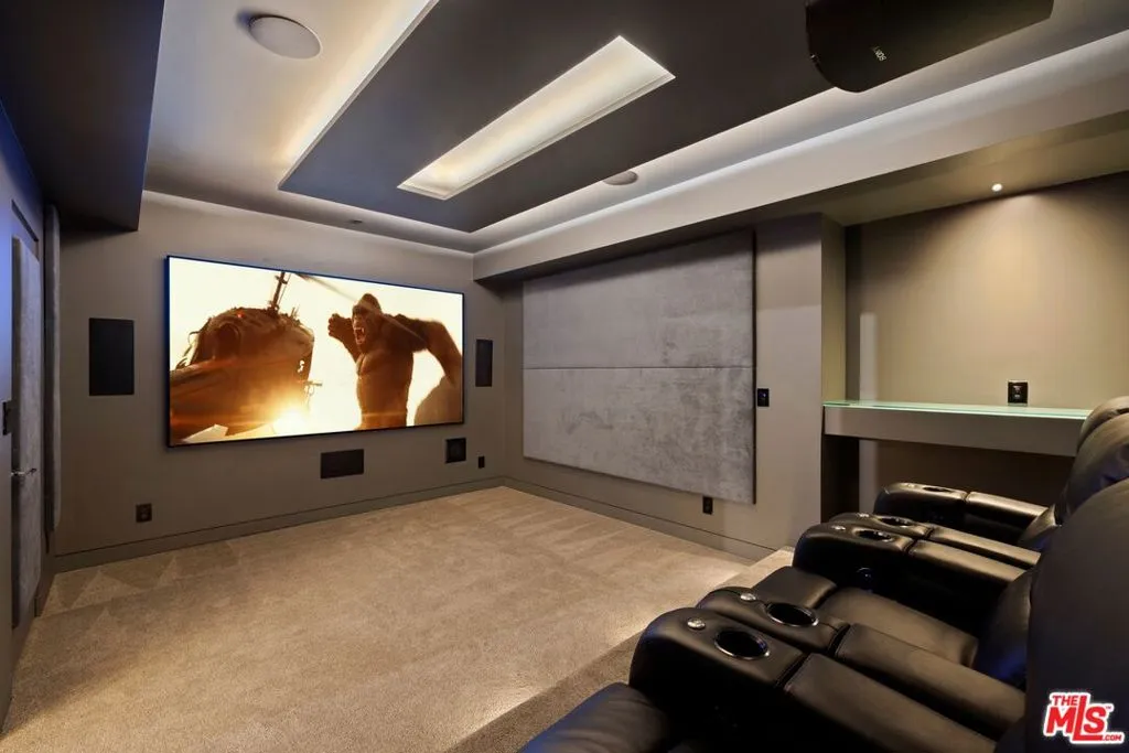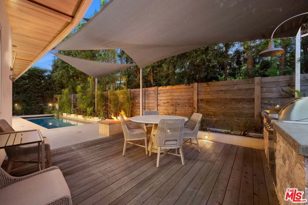 Welcome to this lovely, spacious, and gated contemporary pool home on a corner lot in coveted South-of-the-Boulevard Sherman Oaks, extensively updated throughout with modern finishes for today's lifestyle. Clean lines and geometric shape harmonize with warm woods and sandy brick to form the home's facade, inviting guests within. Inside, cool stone floors flow throughout the open-concept public entertaining spaces. The living room features an elegant fireplace flanked by floating open shelving as Fleetwood doors disappear to provide the ultimate indoor-outdoor experience. Nearby, enjoy meals with friends and family in the dining area, adjacent to the warm, modern kitchen with center island, glossy stone countertops, showcase cabinetry, and top-of-the-line appliances including a chef-grade Miele range with hood. Upstairs, the primary bedroom has wide-plank wood floors, tray ceiling accents, and sliding glass that opens to the large private balcony overlooking the manicured grounds below. The en-suite spa-like bath has a picture window framing greenery, soaking tub, oversized rainwater shower with niche and bench, and floating dual-sink vanity. The walk-in closet is a fashionista's dream, complete with dressing island and custom built-ins. Secondary bedrooms are spacious, two of which also have balcony access, and bathrooms are smartly updated. The fifth bedroom is utilized as an office. Enjoy sought-after amenities including a cinema with snack bar, game room with wet bar, gym, and elevator. Outside, relax in the shimmering pool, gather for conversation around the fire table, or dine al-fresco with lite bites prepared by the built-in barbecue. If that were not enough, there is even a finished rooftop deck offering sweeping 360-degree vistas of the hills and surrounding treetops! This prime location promises the ideal Sherman Oaks-Studio City way of life, located close to the many restaurants along Ventura Boulevard near the thriving social scene at the Sportsmen's Lodge complex, anchored by Erewhon and Equinox, as well as iconic LA landmarks like Casa Vega. Top-rated Dixie Canyon Community Charter is found just up the street, studios are moments away, the 101 Freeway is not far, and an easy canyon drive provides access to West Hollywood, Beverly Hills, and the Westside. Esteemed Harvard-Westlake high school is also nearby.