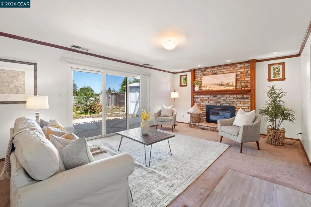 Spacious and beautiful Regency Woods rancher! Features a large living room with a bay and octagonal window, neutral carpet, and a semi-vaulted ceiling. Separate formal dining room with a large picture window and an updated light fixture. Gourmet kitchen boasts slab counters, a center island, an abundance of cabinets, a sunny garden window, and a casual dining area with updated light fixture. Family room is anchored by a cozy brick fireplace with a raised hearth, accent windows, neutral carpet and sliding glass door to rear patio. Desirable downstairs bedroom with a closet, half bath and inside laundry room. Spacious primary suite with vaulted wood beam ceiling featuring a lighted fan, sitting area with a fireplace and balcony overlooking the rolling hillside & open space. Expanded primary bath offers a large shower with a glass enclosure and a solid-surface floor-to-ceiling surround, a dresser-style vanity with dual sinks, additional linen storage and a walk-in closet. Private big lot fronts and backs to open space and features a covered deck for outdoor dining anytime, a sprawling lush lawn area, beautifully manicured & vibrant flowers and ornamentals, a storage shed and paved side yards! This is a must see!