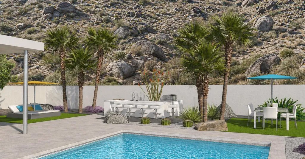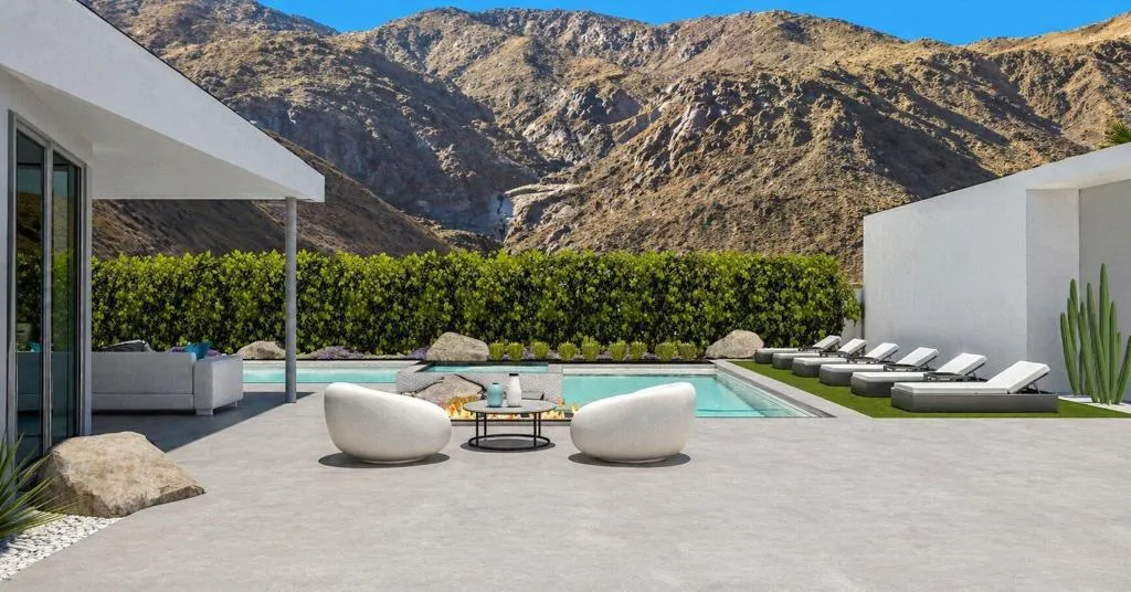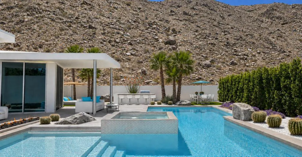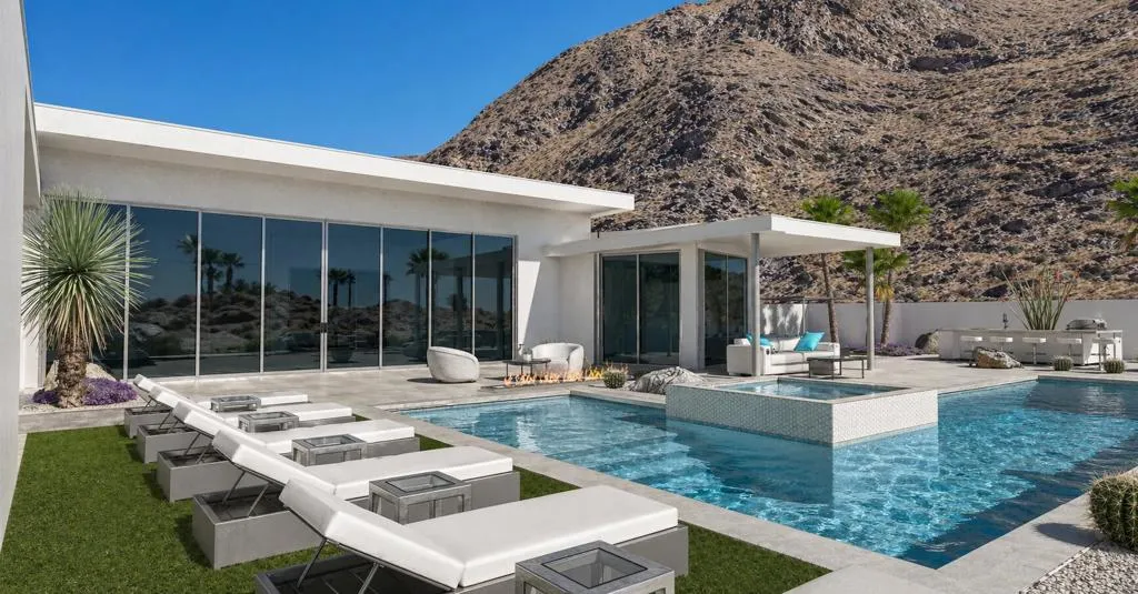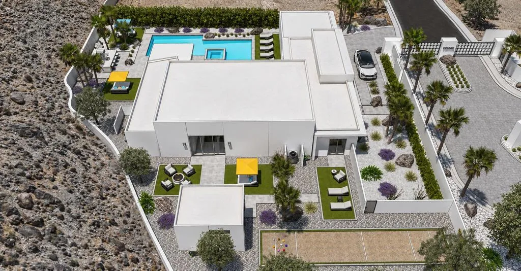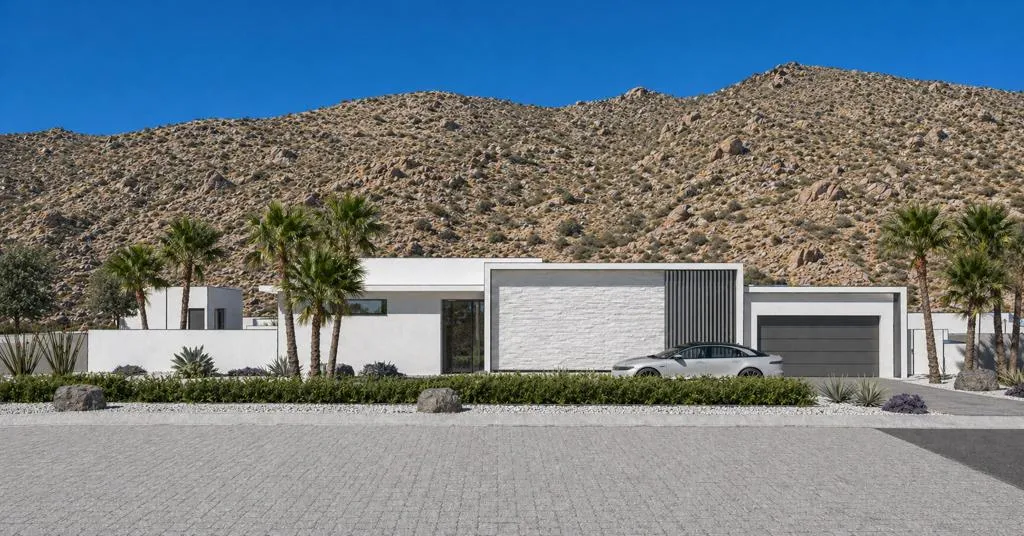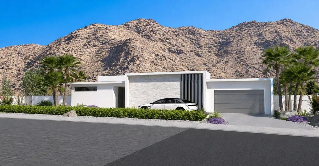 Final Phase of ONE Las Palmas, a new gated community by Brian Foster, Pre-construction Plan 1 residence sits on a generous lot just under 18,000 sq ft and includes 4 bedrooms, 4.5 baths totaling approx. 3,226 sq ft. The layout is comprised of a main house and fully detached guest house. The large lot can also accommodate an additional detached 1or 2-bedroom guest house offering up to 5-6 bedrooms at additional cost. Thoughtfully crafted with exceptional attention to detail, the expansive great room showcases 35 feet of 12-foot-tall sliding glass doors and soaring ceilings creating seamless indoor-outdoor living. Entertain effortlessly with multiple outdoor spaces, including a covered terrace, BBQ area, a stunning pool with tanning shelf & elevated spa, two firepits / conversation areas and bocce ball court. Interior highlights include Wolf & Sub-Zero appliances, large-format porcelain tile flooring, designer carpeting in bedrooms, quartz countertops, oversized kitchen island, linear fireplace with custom wall surround, wet bar, built-in speakers, and solar panels. The luxurious primary suite features a spa-inspired bathroom with a double walk-in shower, floating soaking tub, dual vanities, and ambient lighting. ONE Las Palmas features an exclusive collection of just twenty modern residences. Ideally located near the heart of downtown Palm Springs, this serene enclave offers privacy, luxury, and breathtaking views of Dry Falls and the surrounding mountains. Experience true resort-style living in a home that blends iconic Mid-Century inspiration with contemporary design. Model Homes are open for viewing by appointment.