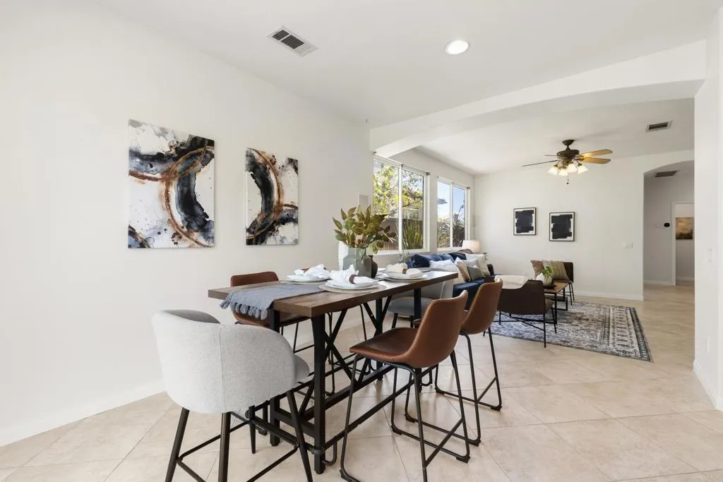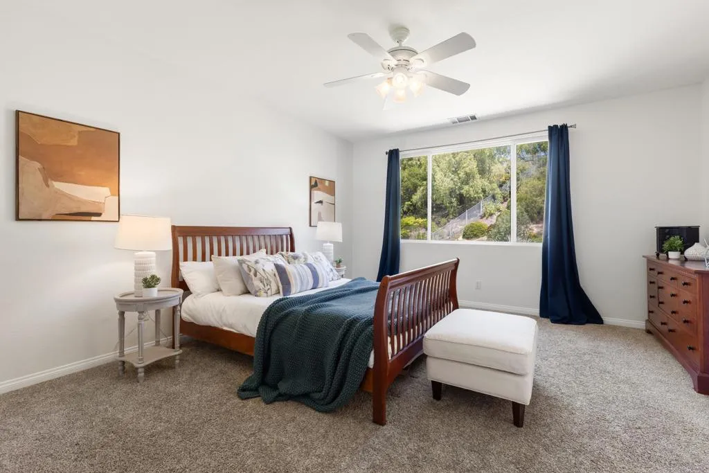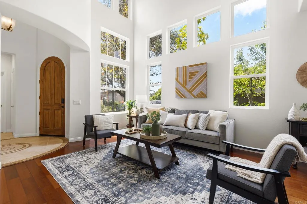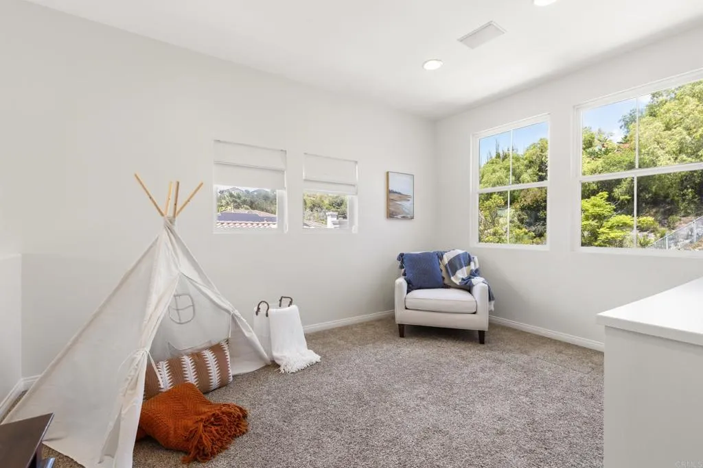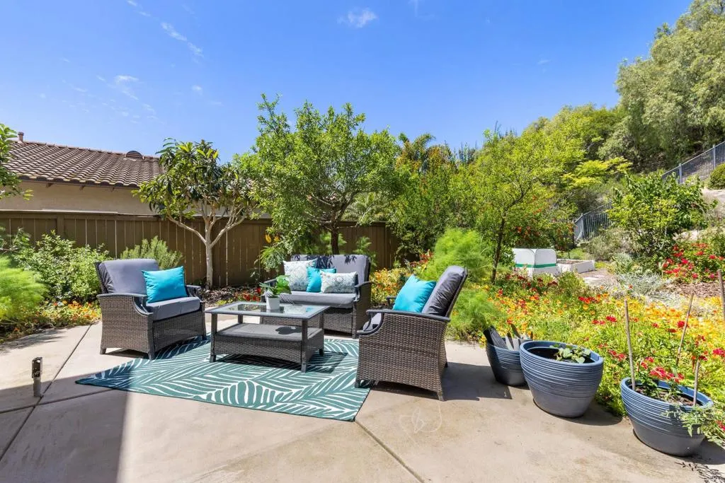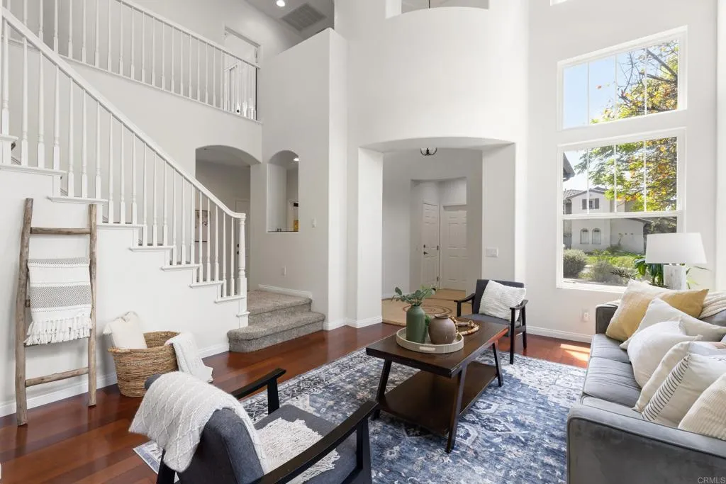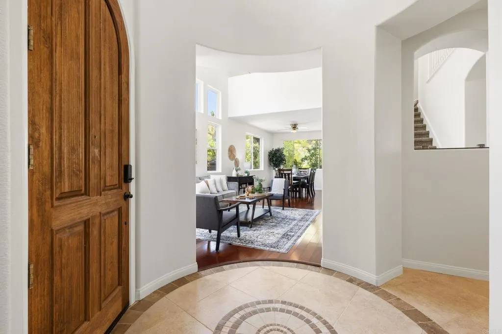 Spacious 4-bedroom, 2.5-bathroom single-family home in the Quintana community of Carlsbad, California, tucked at the end of a quiet cul-de-sac and backing to open space — just 10 minutes from the beach. At 2,855 square feet, this light-filled home offers an open, airy layout with vaulted ceilings and wood flooring throughout. The kitchen features a large center island, walk-in pantry, and gas cooktop. The main living areas flow naturally together with generous room sizes and an abundance of natural light. A bonus room upstairs adds flexible square footage ideal for a playroom, media room, home office, or gym. The oversized primary suite is a true retreat, featuring vaulted ceilings, a huge walk-in closet, and a private bath. The additional three bedrooms offer comfortable space for family, guests, or a dedicated home office — with room to grow into however your lifestyle evolves. Outside, the property shines. The large private backyard includes a productive edible food forest — a rare find in Carlsbad — with space to garden, entertain, and unwind. Paid solar and a new roof deliver long-term efficiency and peace of mind from day one. Backing to open space, the yard feels private and expansive with no rear neighbors. Residents of Rancho Carrillo enjoy access to a community pool, clubhouse, scenic neighborhood trails, and RV storage. Designated public schools for this address are Carrillo Elementary, San Elijo Middle School, and San Marcos High School — buyers to verify enrollment eligibility with San Marcos Unified School District. Located in the heart of Carlsbad with easy access to dining, shopping, and everyday essentials. Outdoor recreation is minutes away — Batiquitos Lagoon, Carlsbad State Beach, Calavera Hills trails, local parks, golf courses, and Legoland California Resort are all within a short drive. This Rancho Carrillo home delivers the full coastal California lifestyle — beach access, lagoon views, and nature trails nearby — with the privacy and space of a cul-de-sac lot backing open space.