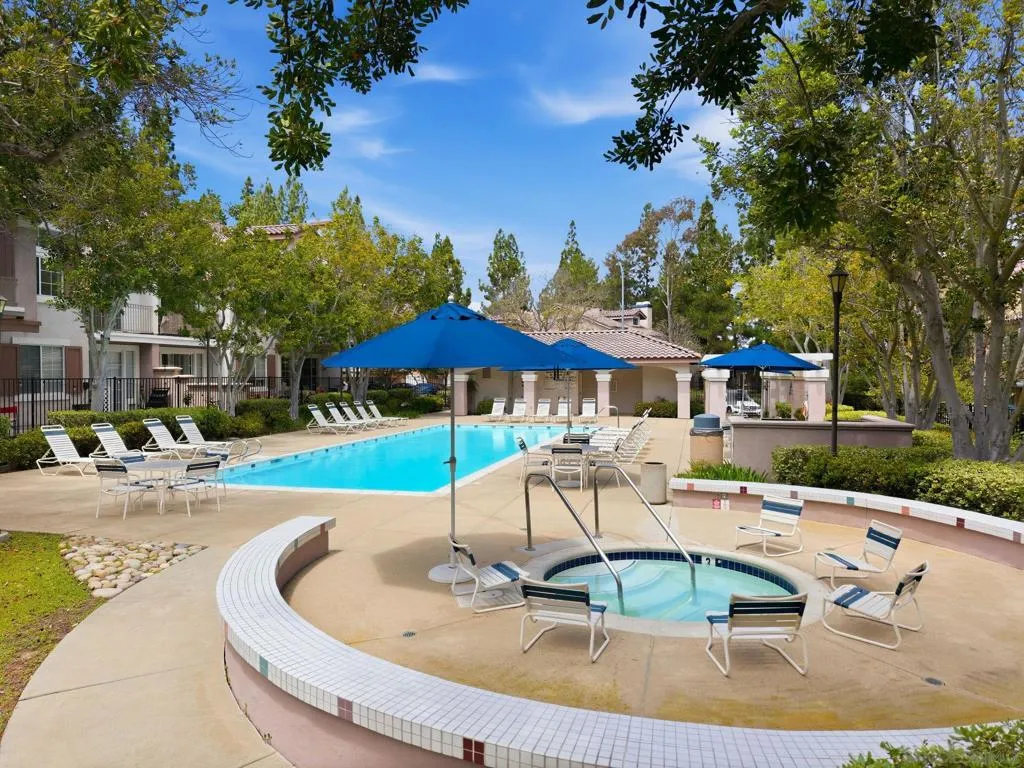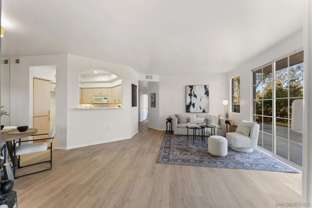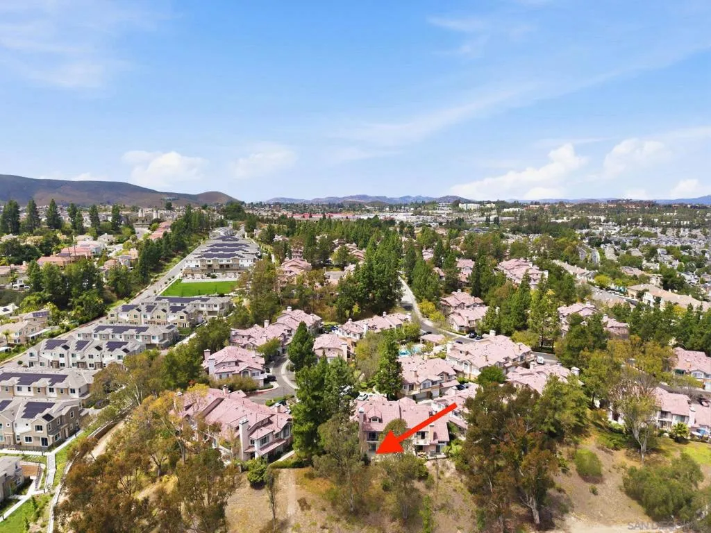 Rare, oversized 38x17 fenced patio with canyon and mountain views, an outdoor space that is incredibly hard to find in a condo. Spacious unit with an open floor plan, featuring new luxury vinyl plank flooring and fresh paint throughout. The primary bedroom offers a large walk-in closet, en-suite bathroom, and a generous sliding glass door that opens directly to the patio, creating seamless indoor-outdoor living. Inside side-by-side laundry and an attached garage. Community pool, spa, playground, and barbecue area.