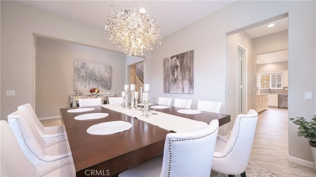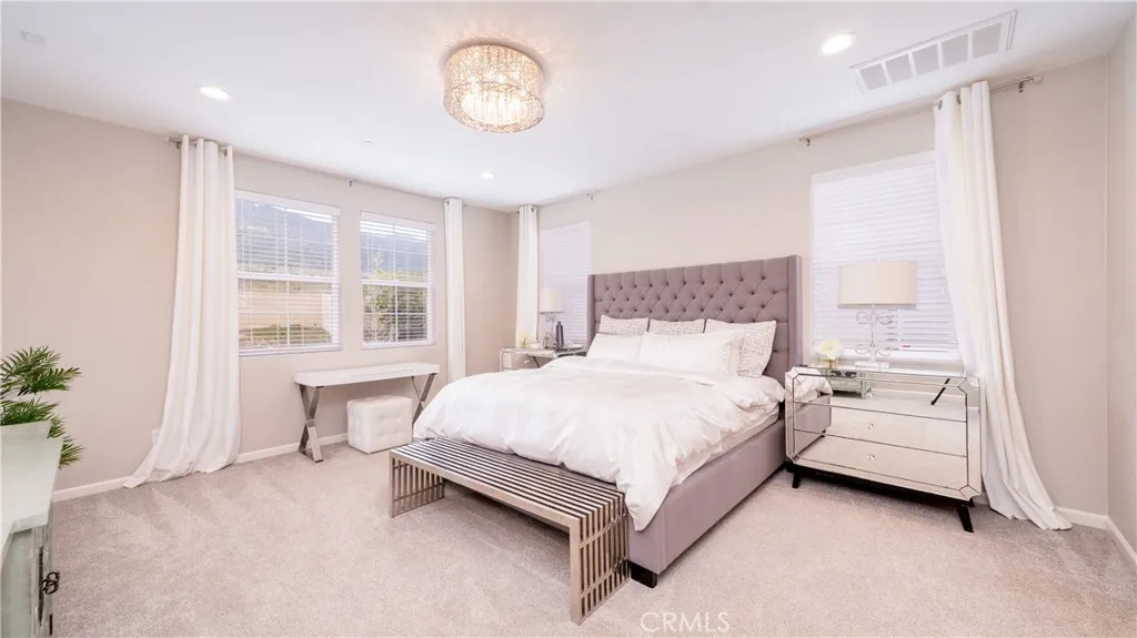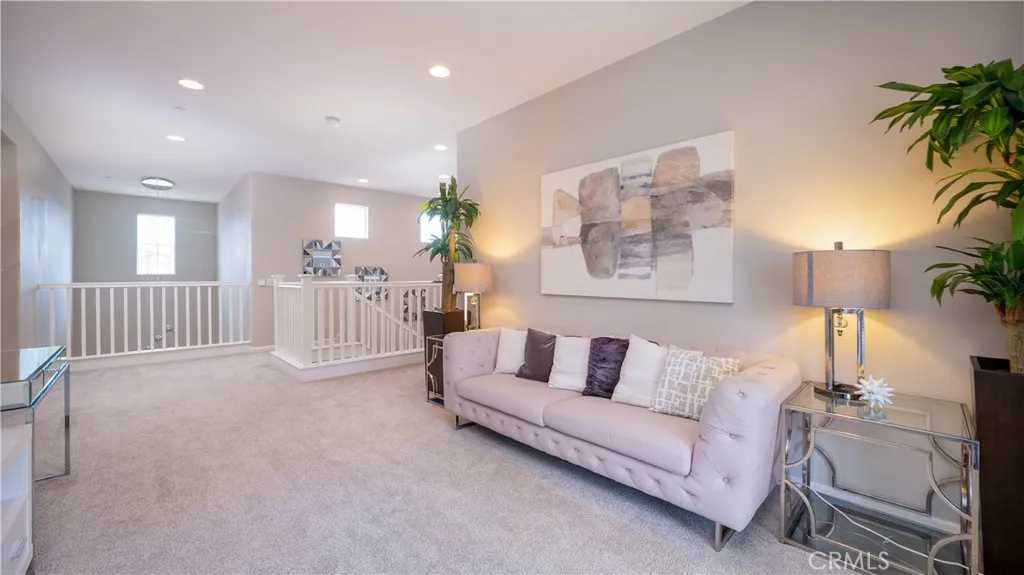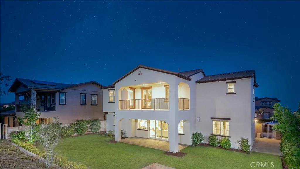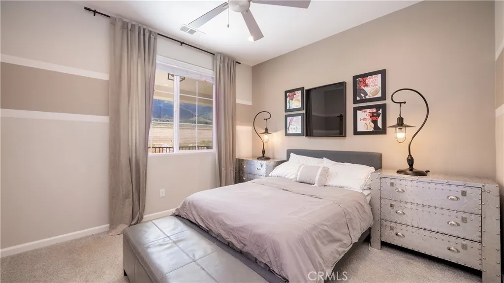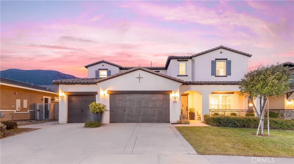 Located in the highly sought-after Rancho Etiwanda Estates, a prestigious gated community, this beautifully designed home offers style, space, and comfort throughout. With approximately 3,300 square feet of living space, the home features 4-bedrooms & 3.5 baths, including a convenient downstairs bedroom with a full en-suite bath, ideal for guests or multi-generational living. From the moment you arrive, the inviting front porch welcomes you with a comfortable seating area and peaceful neighborhood views. The home has been freshly painted inside and out and features striking, modern, custom lighting throughout. A Smart keyless front door and a camera doorbell add both convenience and security. Inside, you will find a formal dining room highlighted by a modern chandelier, along with a butler's pantry complete with quartz countertops, full backsplash, and under-cabinet lighting. The spacious walk-in pantry offers plenty of storage. This kitchen is truly the centerpiece of the home, designed with both function and style in mind. It features an oversized quartz island with breakfast bar seating, sleek pendant lighting, stainless steel appliances, including a built-in refrigerator, oven, microwave, dishwasher, and a 5-burner cooktop with a pot filler and powerful range hood. A glass tile backsplash adds a refined finishing touch. The family room is warm and inviting, featuring a fireplace, an oversized ceiling fan, and a panoramic sliding door that opens seamlessly to the backyard. The indoor-outdoor flow is perfect for entertaining, leading to a covered CA room equipped with ceiling fans, recessed lighting & electrical outlets. Upstairs, a spacious loft with recessed lighting and French doors that open to a private balcony with unobstructed mountain views. The primary suite offers a relaxing retreat with custom lighting, balcony access, and a luxurious en-suite bathroom. Enjoy a separate soaking tub, an oversized walk-in shower with rain shower, floor-to-ceiling tile work, and a built-in bench. Dual vanities, a dedicated glam station, and a large walk-in closet with custom organizers complete the space. The 3-car garage features epoxy-coated flooring and insulated doors. Additional highlights include dual Honeywell Smart thermostats, a fire sprinkler system, & a tankless water heater. The backyard has been freshly sodded and is ready for your touch. This is a rare opportunity to own a thoughtfully upgraded home in one of the area's most desirable communities.