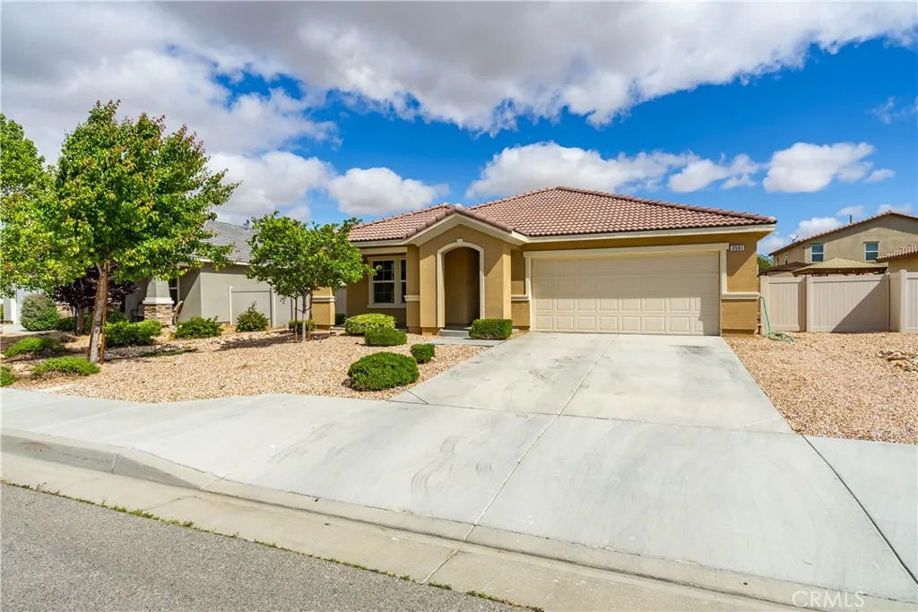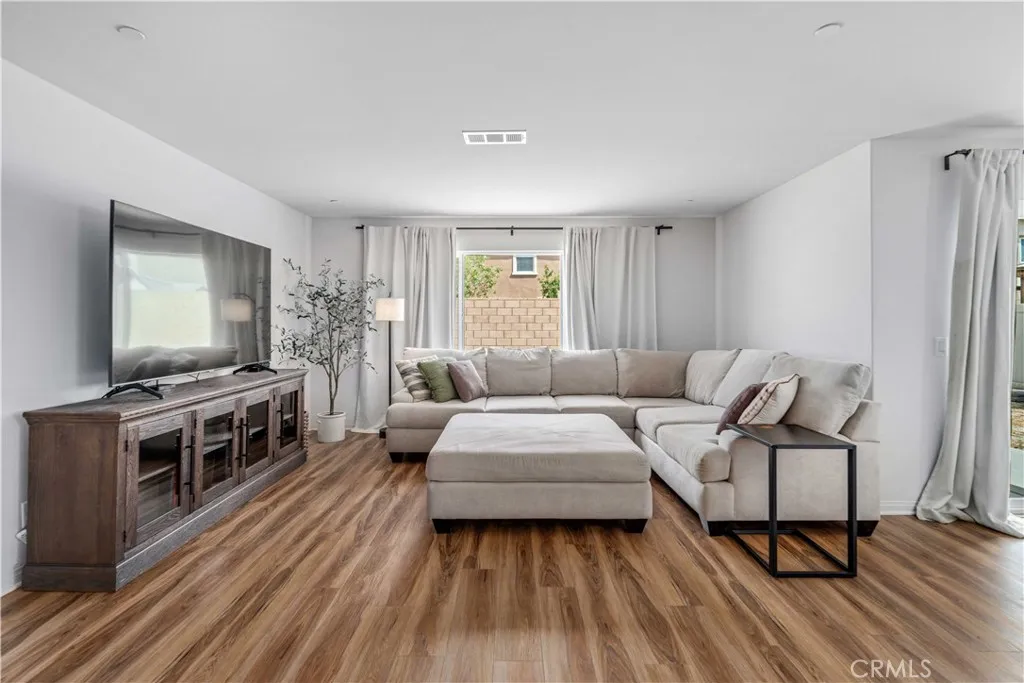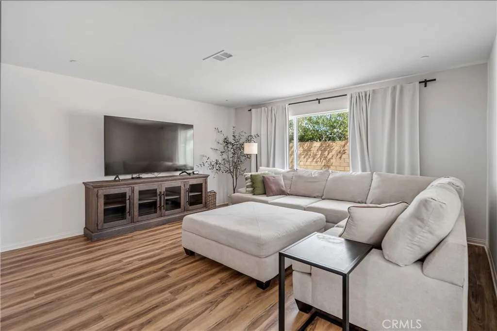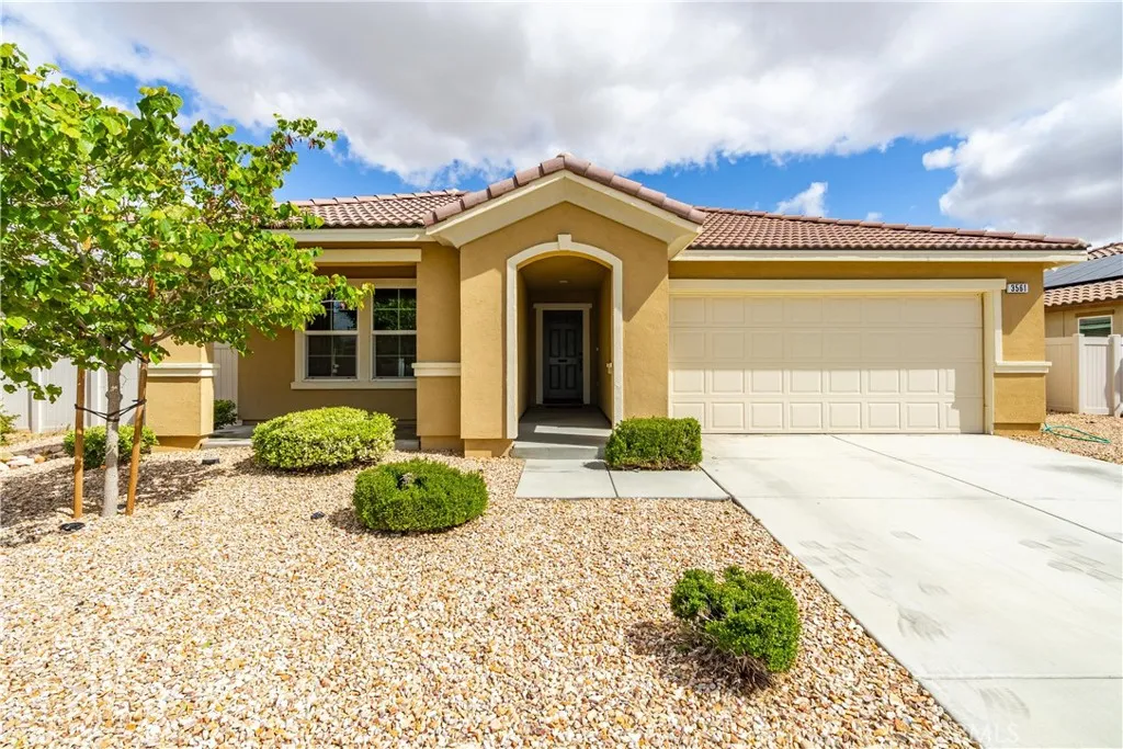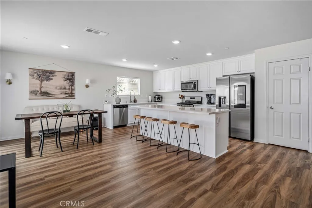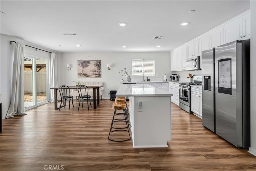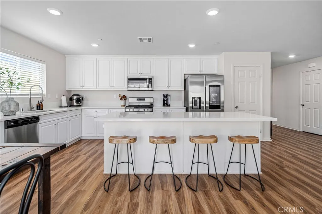 Welcome to this beautifully maintained 2019-built home offering 4 bedrooms and 2 bathrooms, thoughtfully designed for both comfort and convenience. Step inside to a bright, open-concept floor plan featuring recessed lighting and luxury vinyl plank flooring resembling hardwood throughout all main living areas, creating a seamless flow between the living, dining, and kitchen spaces—perfect for everyday living and entertaining. The kitchen serves as the heart of the home, showcasing a large quartz island, upgraded stainless steel appliance package with microwave above the stove, upgraded Samsung smart refrigerator, cabinet above the fridge for added storage, abundant counter space, and crisp white cabinetry—combining both style and functionality for gatherings of any size. Quartz countertops are featured in both the kitchen and all bathrooms for a cohesive, modern finish. The spacious primary suite is privately positioned away from the additional bedrooms, providing a peaceful retreat to relax and unwind. The secondary bathroom includes an extended vanity, offering additional space and convenience. Enjoy modern, energy-efficient features including solar panels, a tankless water heater, smart thermostat, and fire sprinkler system—providing both comfort and potential cost savings. The low-maintenance front yard is designed with drought-tolerant landscaping and a drip irrigation system for easy upkeep. Completing the home is a two-car garage providing added convenience and storage.