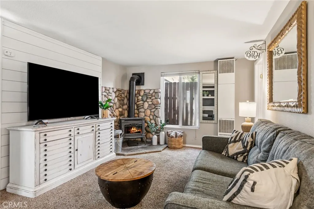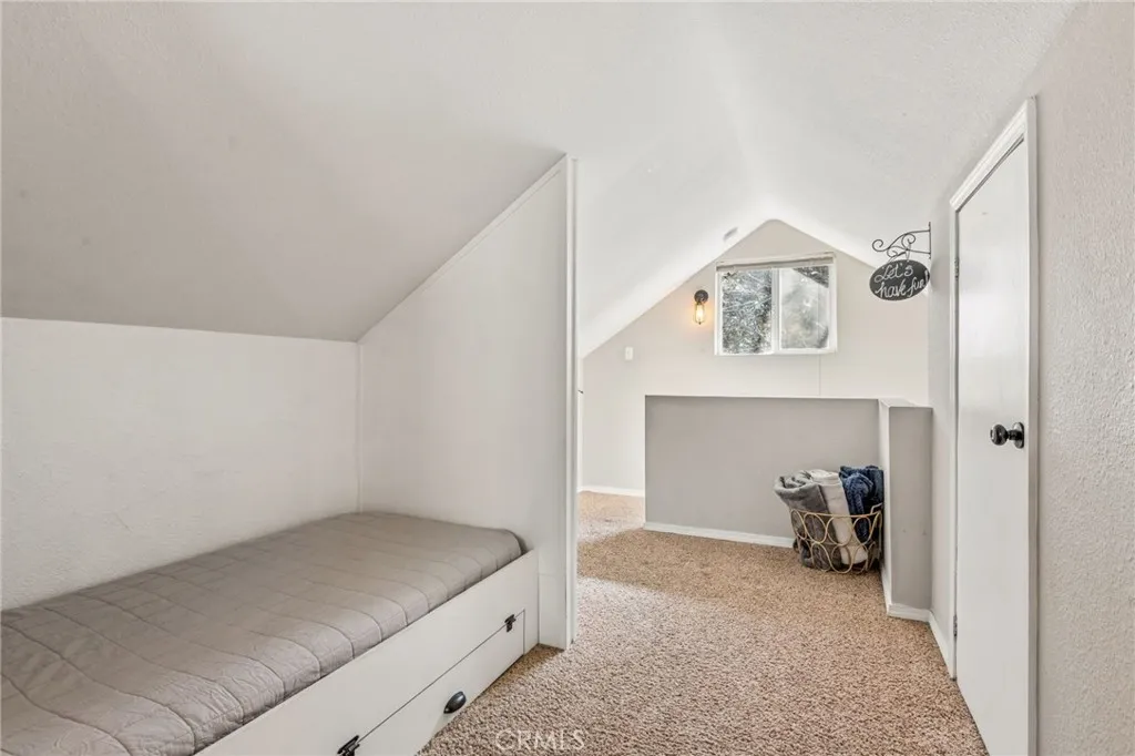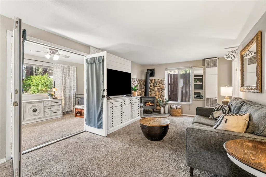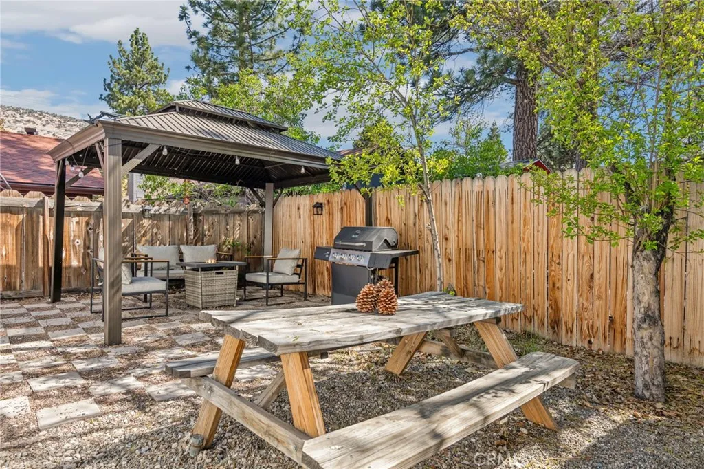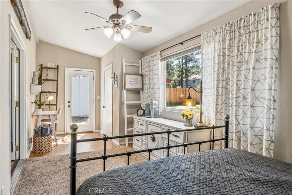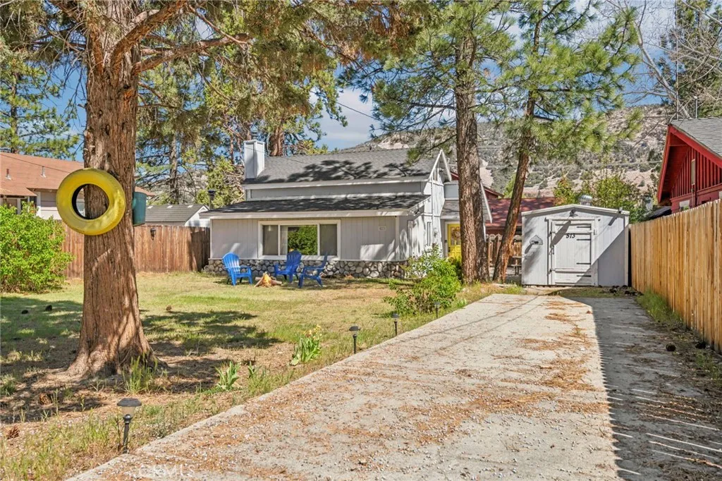 Welcome to this adorable move-in ready mountain cottage, full of charm, curb appeal, and inviting outdoor spaces. Framed by tall pines, a grassy front yard, white picket fencing, and attractive stone wainscoting, this home offers the perfect blend of cozy cabin character and modern comfort. Enjoy a spacious front yard along with a side yard featuring a paver patio and patio cover—ideal for BBQs, outdoor dining, or simply relaxing in the fresh mountain air. Inside, the home opens to bright dining and kitchen spaces with an open, welcoming feel. The kitchen features granite countertops, tiled backsplash, and stainless steel appliances. The living room serves as the heart of the home, highlighted by a wood-burning stove with a rustic stone surround. French doors off the living area lead to a spacious main-level bedroom complete with an office nook and private exterior access, offering flexibility for guests or working from home. Also on the main level is a roomy laundry area combined with a full bathroom for added convenience. Upstairs, the loft-style bedroom is both charming and functional, featuring three built-in twin beds with storage drawers below and a closet. Conveniently located just a short drive from local dining, shopping, and ski resorts, this delightful cottage is the perfect mountain getaway, investment or full-time retreat.