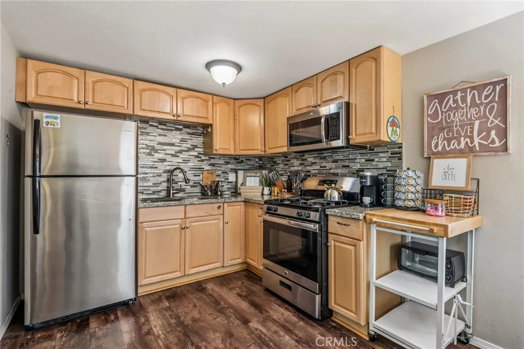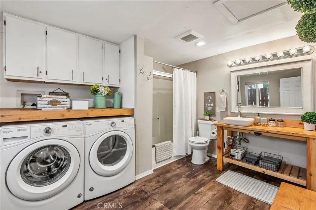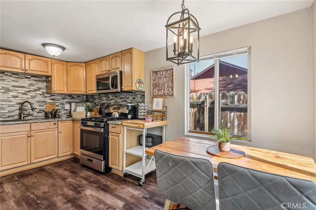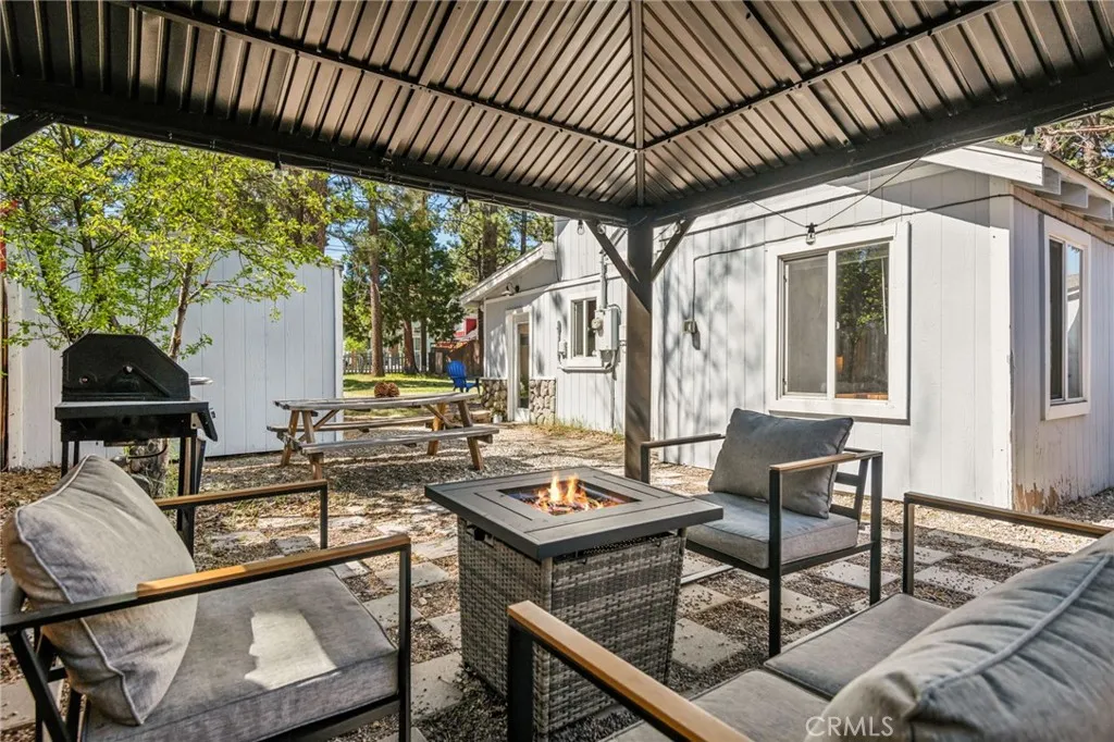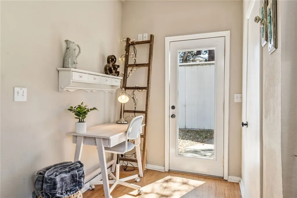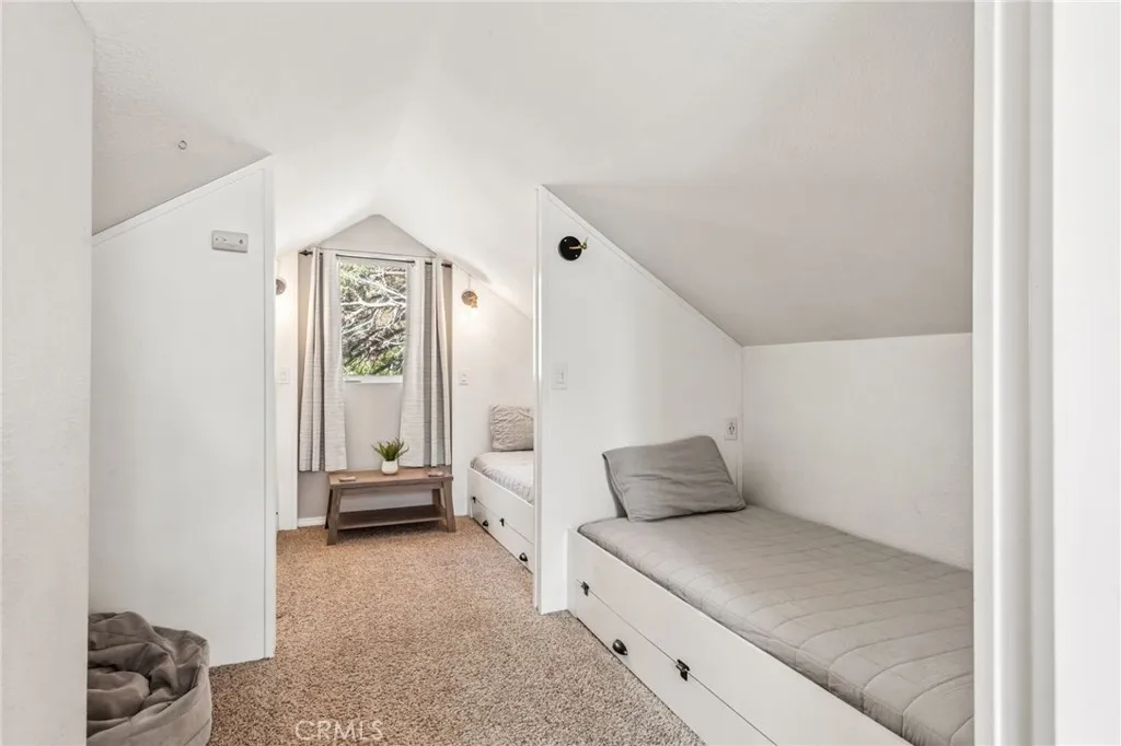 Welcome to this adorable move-in ready mountain cottage, full of charm, curb appeal, and inviting outdoor spaces. Framed by tall pines, a grassy front yard, white picket fencing, and attractive stone wainscoting, this home offers the perfect blend of cozy cabin character and modern comfort. Enjoy a spacious front yard along with a side yard featuring a paver patio and patio cover—ideal for BBQs, outdoor dining, or simply relaxing in the fresh mountain air. Inside, the home opens to bright dining and kitchen spaces with an open, welcoming feel. The kitchen features granite countertops, tiled backsplash, and stainless steel appliances. The living room serves as the heart of the home, highlighted by a wood-burning stove with a rustic stone surround. French doors off the living area lead to a spacious main-level bedroom complete with an office nook and private exterior access, offering flexibility for guests or working from home. Also on the main level is a roomy laundry area combined with a full bathroom for added convenience. Upstairs, the loft-style bedroom is both charming and functional, featuring three built-in twin beds with storage drawers below and a closet. Conveniently located just a short drive from local dining, shopping, and ski resorts, this delightful cottage is the perfect mountain getaway, investment or full-time retreat.