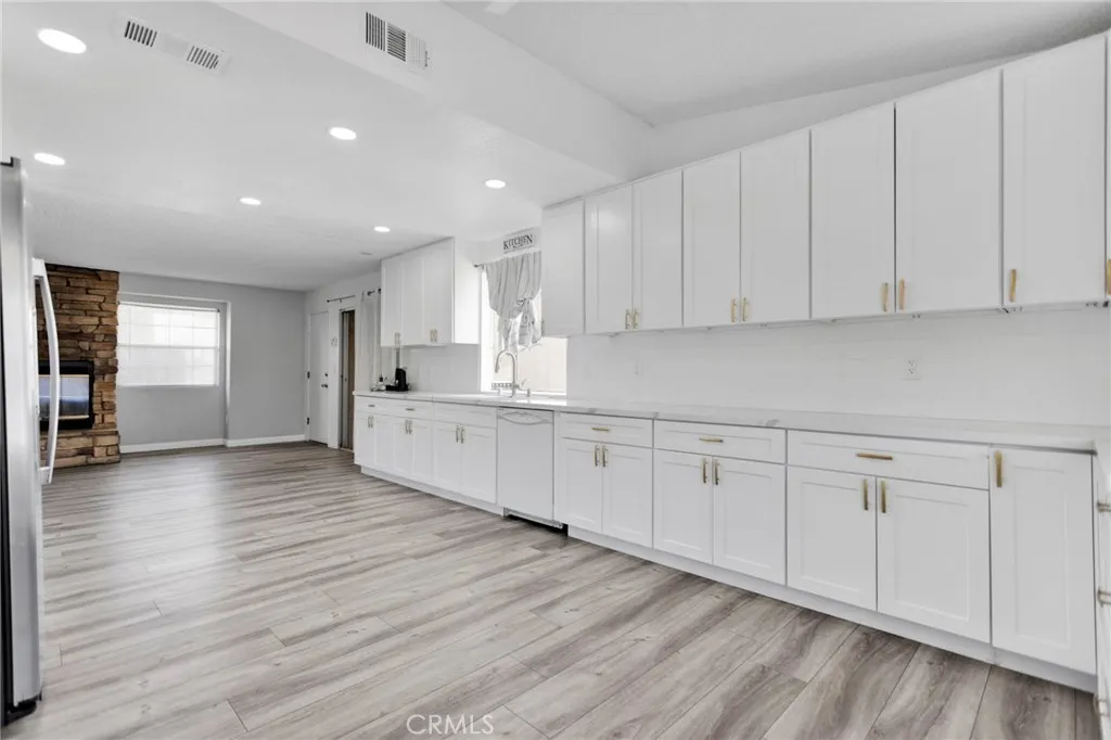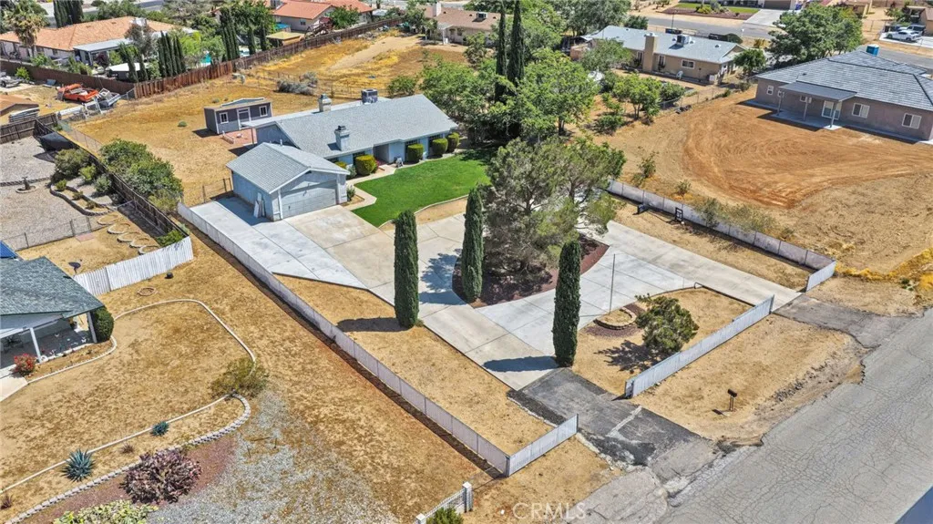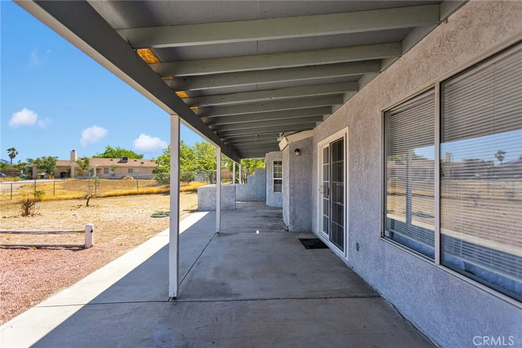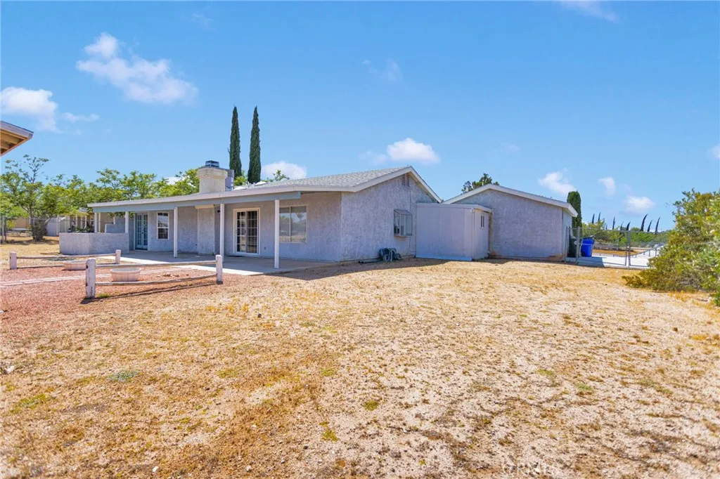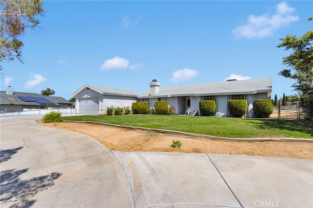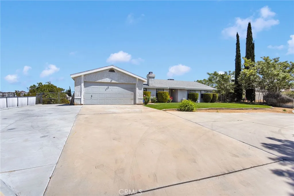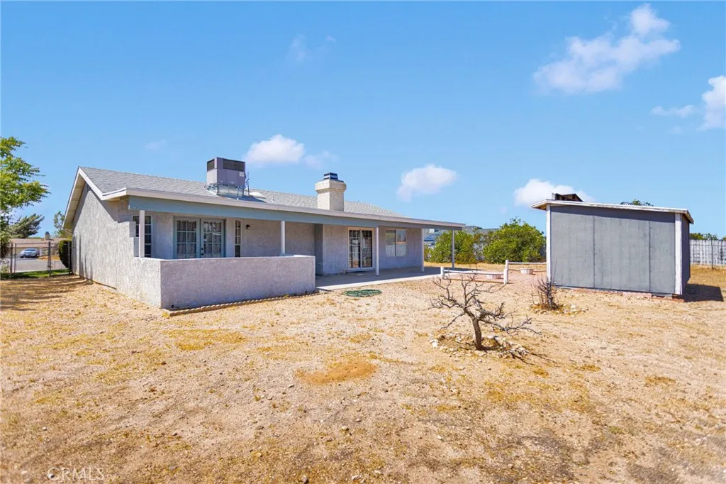 This beautifully updated 3-bedroom, 2-bath home sits in the heart of Victorville, offering space, style, and privacy. Set back from the road, the property features clean front landscaping with curbing, a grassy area, and extensive concrete work, including a large circular driveway for easy parking. Inside, you’re welcomed by hardwood laminate flooring through the main living areas, a cozy fireplace, and a bright kitchen with quartz countertops and tasteful gold accents. The home also offers an attached laundry room with washer and dryer hookups. Bedrooms are comfortably finished with carpet, while the primary suite stands out with custom tile flooring in the bathroom, French doors to the backyard, and a beautifully designed tile shower. The backyard is ideal for relaxing or entertaining, featuring a covered concrete patio, a semi-enclosed space off the primary bedroom, and a spacious storage shed.