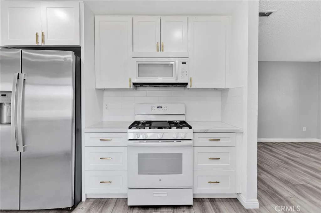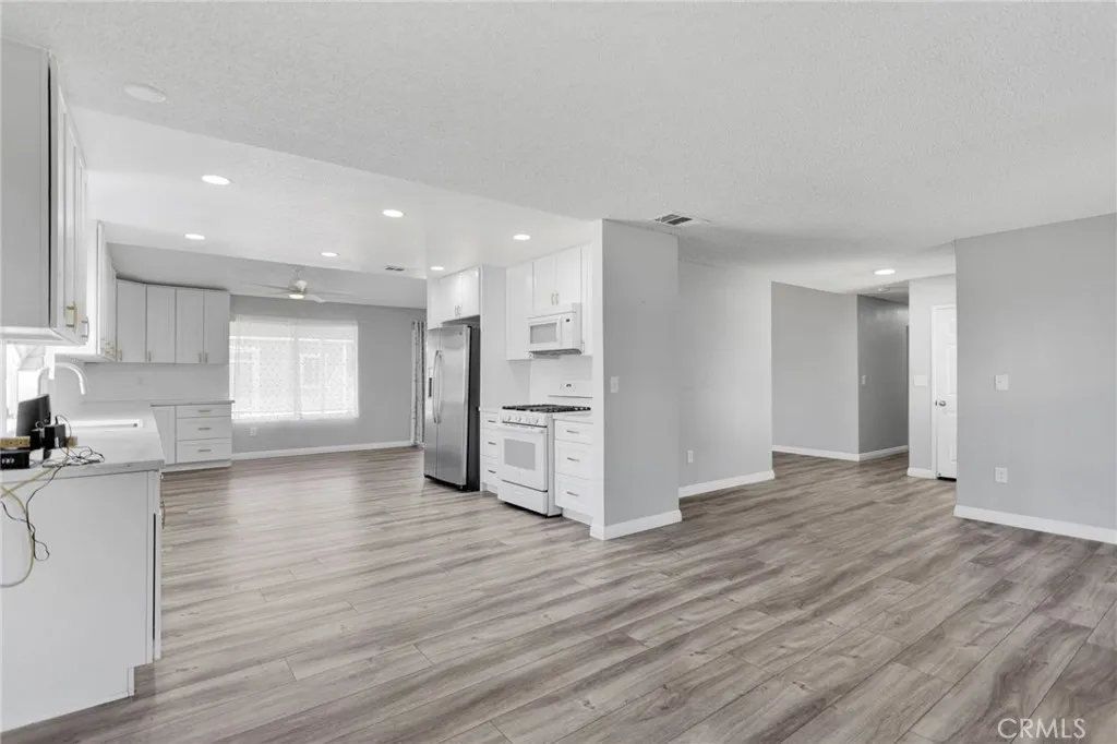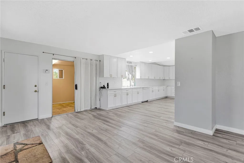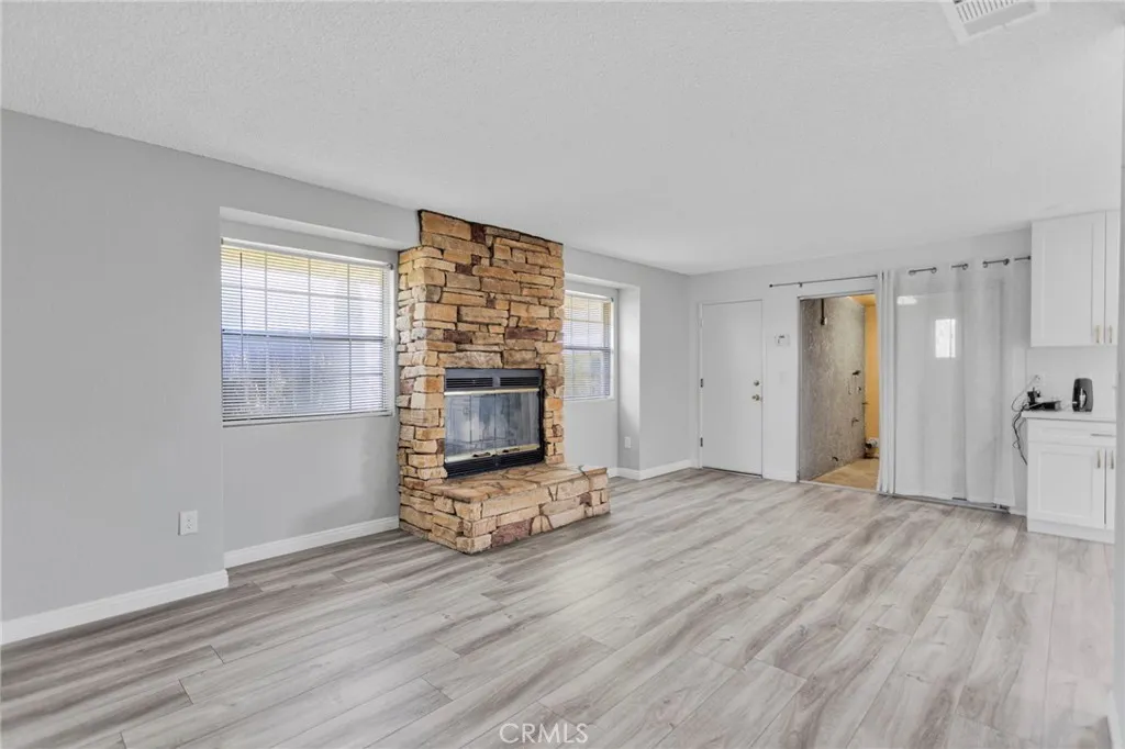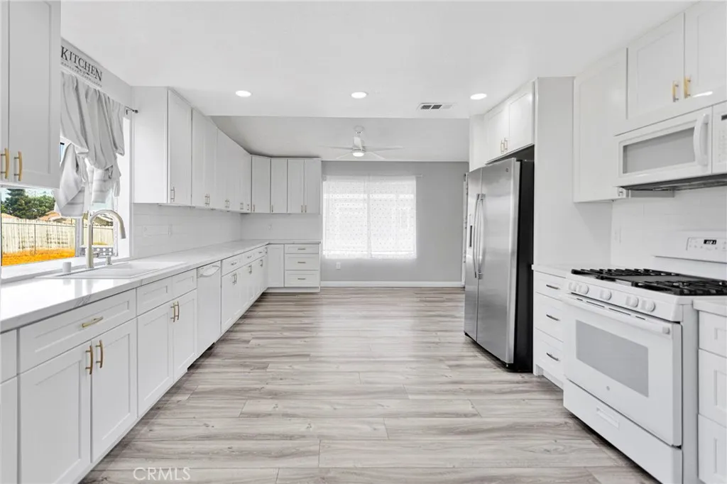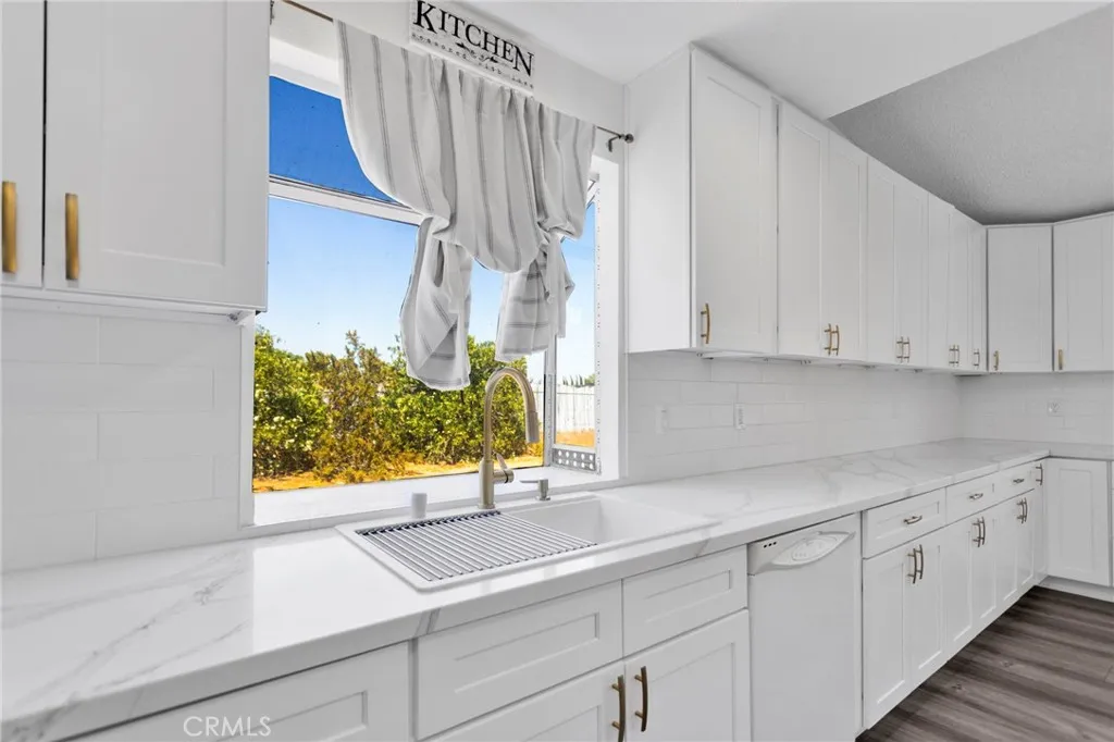 This beautifully updated 3-bedroom, 2-bath home sits in the heart of Victorville, offering space, style, and privacy. Set back from the road, the property features clean front landscaping with curbing, a grassy area, and extensive concrete work, including a large circular driveway for easy parking. Inside, you’re welcomed by hardwood laminate flooring through the main living areas, a cozy fireplace, and a bright kitchen with quartz countertops and tasteful gold accents. The home also offers an attached laundry room with washer and dryer hookups. Bedrooms are comfortably finished with carpet, while the primary suite stands out with custom tile flooring in the bathroom, French doors to the backyard, and a beautifully designed tile shower. The backyard is ideal for relaxing or entertaining, featuring a covered concrete patio, a semi-enclosed space off the primary bedroom, and a spacious storage shed.
