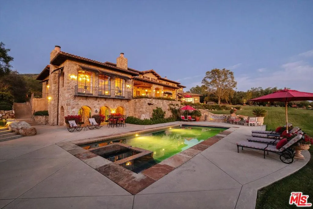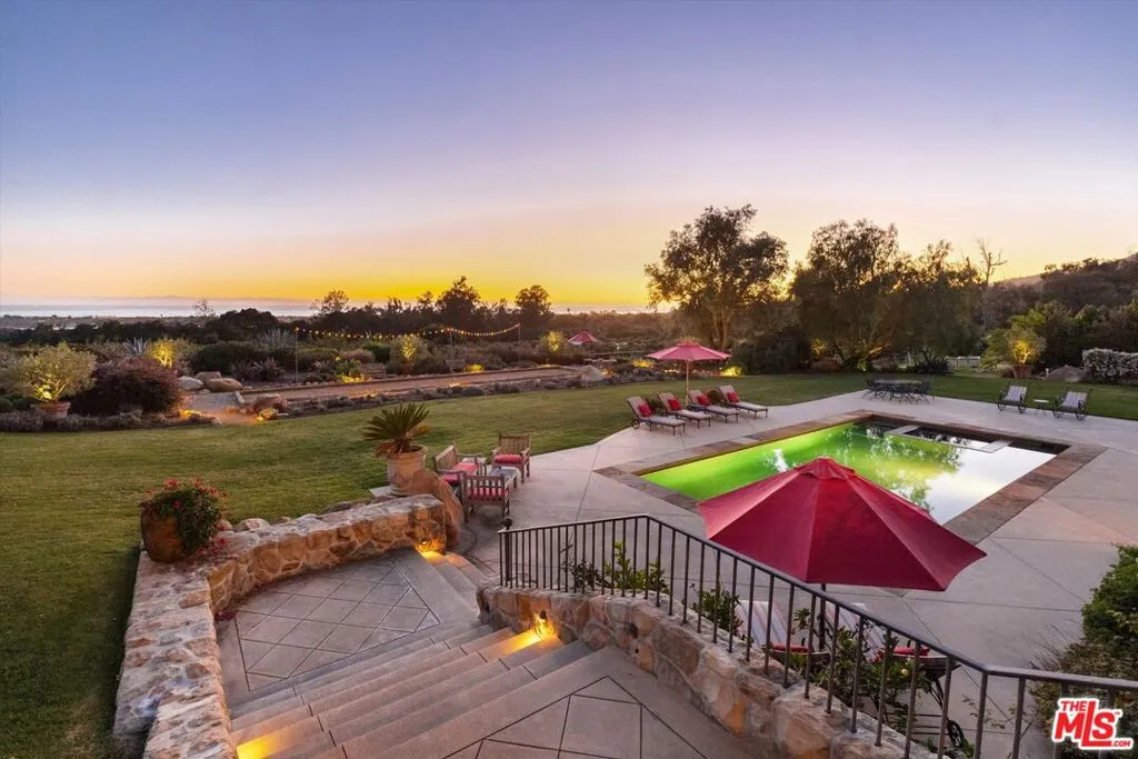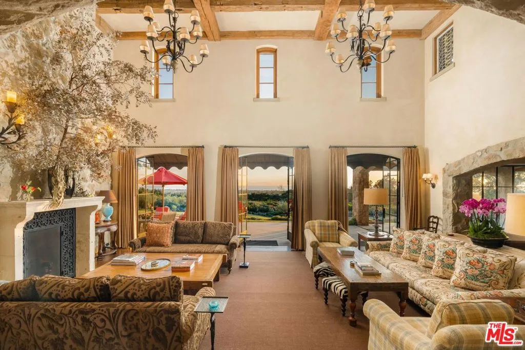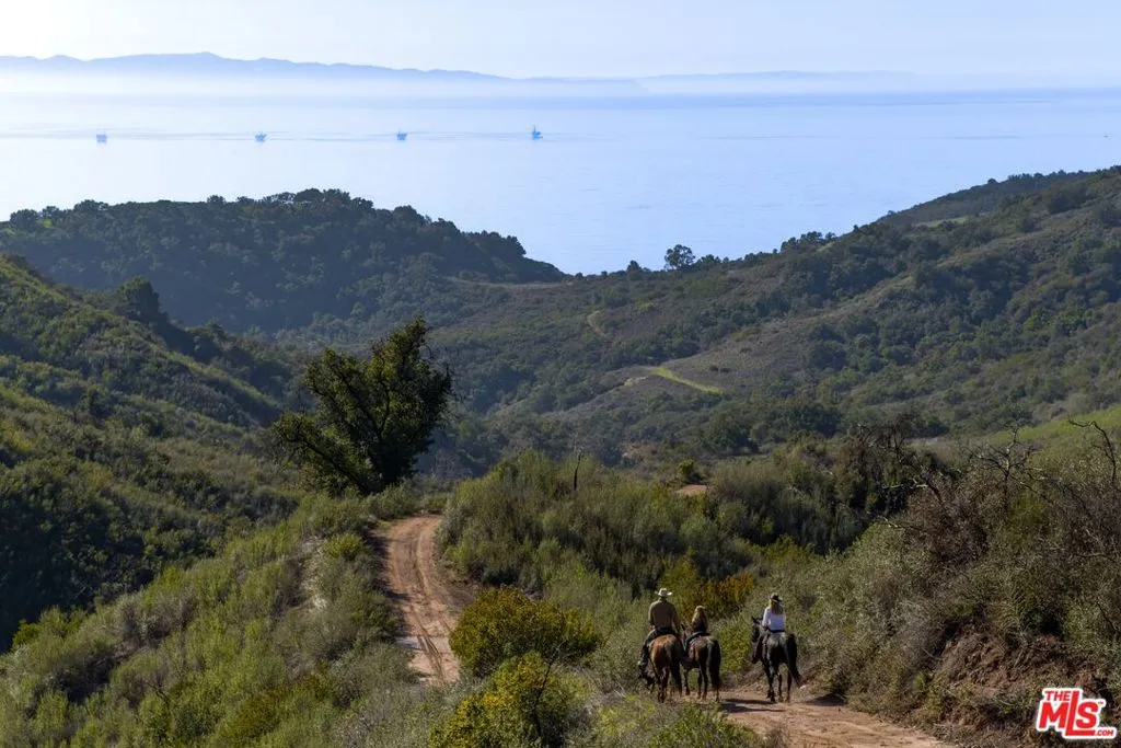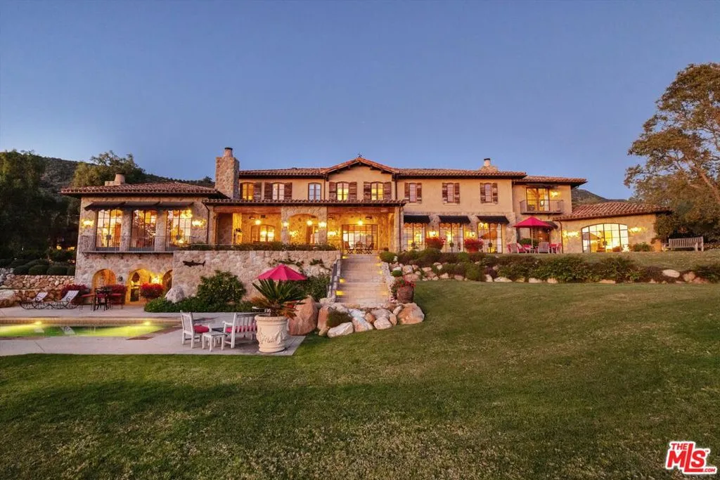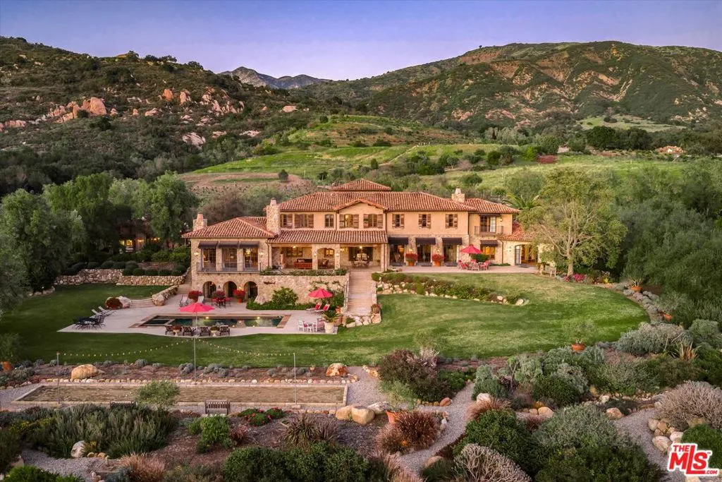 Within the gates of the historic, 3,000-acre Rancho Monte Alegre, JTR Ranch is a rare 10-acre legacy property offering privacy, scale, and extraordinary access to wilderness -- just minutes from Montecito and the beach. Spanning approximately 8010 square feet, the residence captures sweeping ocean and mountain views from nearly every room. Designed with a reverence for European craftsmanship by renowned Santa Barbara architect Don Nulty, the home features 200-year-old hand-hewn coffered ceilings, Belgian wide-plank French oak floors, and multiple French limestone fireplaces. A dramatic two-story stone fireplace anchors the grand living room, where walls of glass frame the coastline beyond. The formal dining room seats fourteen with ease, while the chef's kitchen -- appointed with a six-burner range, four ovens, dual dishwashers, butler's pantry, and seated wet bar -- was designed for both elevated entertaining and everyday living. The floor plan balances grandeur with comfort: a warm family room with fireplace, expansive media center, breakfast/game nook, walk-out lower level with wine cellar and billiards space, mudroom with drip-dry station, and multiple powder rooms. A Romeo and Juliet balcony overlooks the grounds, and upstairs a gallery library and two generous offices create refined work-from-home spaces. With all furnishings included, this home comes ready for you to make it your own. Four private suites -- three king and one queen--along with a custom bunk room designed to sleep ten, provide exceptional accommodations. The primary suite is a retreat unto itself, complete with soaking tub, oversized wardrobe, and a discreet secondary staircase offering both privacy and peace of mind. Outdoors, the estate lives like a private resort. Pool and spa, bocce court, horseshoe pit, firepit, olive grove, fully-enclosed vegetable gardens, and meandering gravel paths create an atmosphere of relaxed sophistication. Entertain beneath the reclaimed barnwood loggia with heat lamps and limestone fireplace, or host al fresco dinners and smoker BBQs across multiple terraces. A detached guest retreat of approximately 1152 square feet sleeps four and includes a loft, sitting area, powder bath, and outdoor shower. Footings have also been poured for an 800-sf cabana west of the pool. What further distinguishes this offering is its private access to the Santa Monica creek wilderness with year-round water flow on Rancho Monte Alegre -- complete with swimming holes, waterfalls, and pristine riparian landscape, all backed by Los Padres National Forest, encompassing nearly two million acres of protected wilderness. For equestrian buyers, JTR Ranch is ideally suited for horses and trail riding, with usable acreage and direct access to miles of natural terrain. Few properties on the South Coast offer such seamless connection to both refined living and vast, untamed landscape. Despite its remarkable privacy, JTR Ranch is exceptionally convenient. Located just moments from the US 101 with easy on-and-off access, the estate is only minutes to Montecito, Coast Village Road, and the beach -- while remaining only a 90-minute drive from Los Angeles. This rare combination of seclusion and accessibility makes it ideally positioned for both full-time residence and weekend retreat. Built in 2010, JTR Ranch represents a singular opportunity within one of Santa Barbara's most storied enclaves -- where European elegance, equestrian lifestyle, and protected wilderness converge along the American Riviera.
