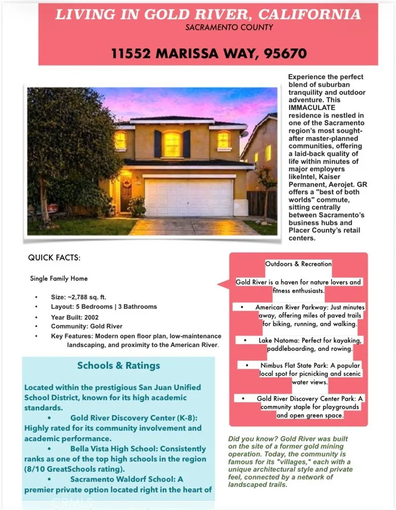 In a neighborhood where pride of ownership is evident on every street corner, this home is a sanctuary for those who value both space and privacy. Located in one of Sacramento's beautifully-planned Village communities, this hard to find 5BR3BA home offers a blend of California functionality + modern versatility. Designed for easy, seamless living. Soaring ceilings + natural light throughout. Open floor plan transitions effortlessly from intimate family gatherings to easy group entertaining. Spacious kitchen overlooks the living areas, ensuring the chef is always part of the conversations. The four large, bright and airy bedrooms with shelved closets and an extra spacious primary BR +en-suite + sitting area space + large walk-in closet are a delight! The centerpiece for the upper level is the oversized Loft and is the family's flexible center - allows for the many possibilities you create and limited only to your imagination - a dedicated executive home office, home cinema, fitness or wellness area, music room, art studio or 2nd family lounge. Raised garden out back. Covered patio + new roof replacement (under contract to be replaced/installed 5/15-5/18). Served by the award winning San Juan Unified District which includes the highly rated Gold River Discovery Center. Quick access to Hwy 50, downtown Sacto, or Folsom's tech corridor. Gold River is a haven for nature lovers and fitness enthusiasts. American River Parkway and Lake Natoma are truly just minutes away, - offering miles of paved trails for biking, running, and walking, kayaking, paddle boarding and rowing while close by Nimbus Flat State Park is a popular local spot for picnicking and scenic water views. This low maintenance home and backyard is ideal for spending weekends and evenings with family in the wide open, green spaces. A must check out!