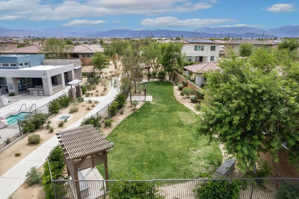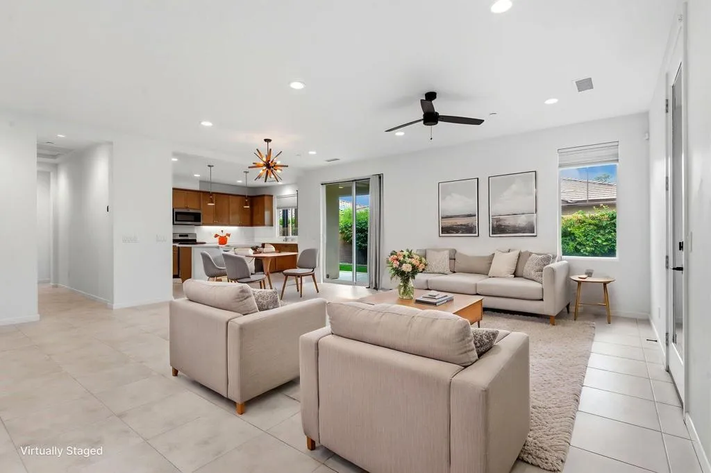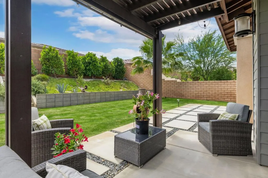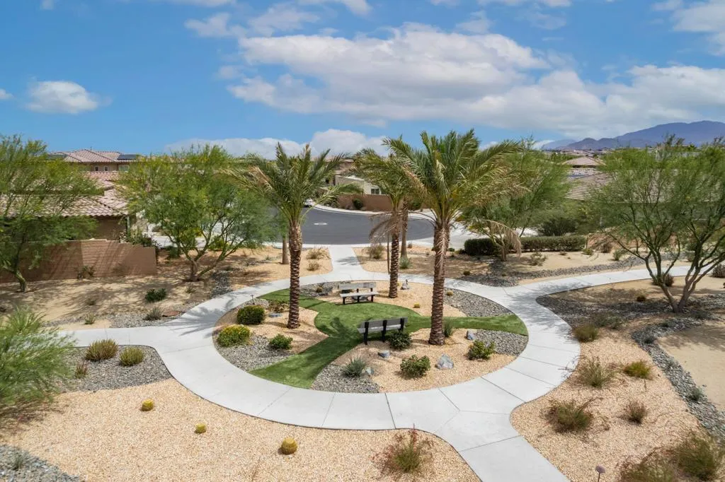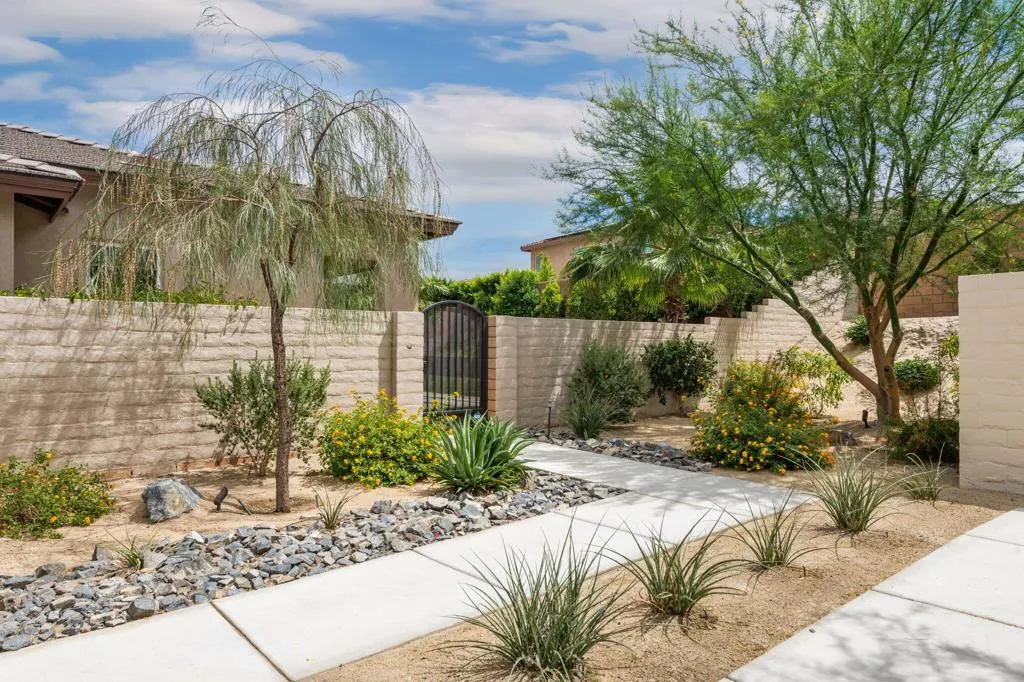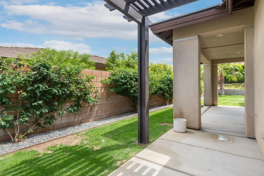 Renovated in 2022, this thoughtfully designed 3-bedroom, 2-bath custom home is located in the gated Genesis community on a larger lot with room for a pool. The home showcases owner upgrades, including an extended courtyard wall that enhances privacy and outdoor living, along with 9' ceilings, 18x18 tile flooring, custom lighting, fixtures, and cellular blinds.The open-concept layout is filled with natural light, with sliding doors from the dining area and a French door from the Great Room creating a seamless indoor-outdoor connection.The backyard is landscaped with Bermuda turf, palm trees, and desert plantings, offering three seating areas including two pergolas and a covered patio off the kitchen--ideal for relaxing or entertaining.The primary suite features private patio access, a walk-in closet, dual vanities, and a custom-tiled shower. Both bathrooms include floor-to-ceiling tiled showers and upgraded finishes.Smart home features include Ring alarm with front door camera, smart lock, Eufy outdoor cameras, ecobee thermostat, and garage door app.Additional highlights include an upgraded laundry room, added garage storage, EV charger conduit, and access to dog parks, fitness center, and pool/spa. Low HOA includes internet, cable, and exterior landscaping.